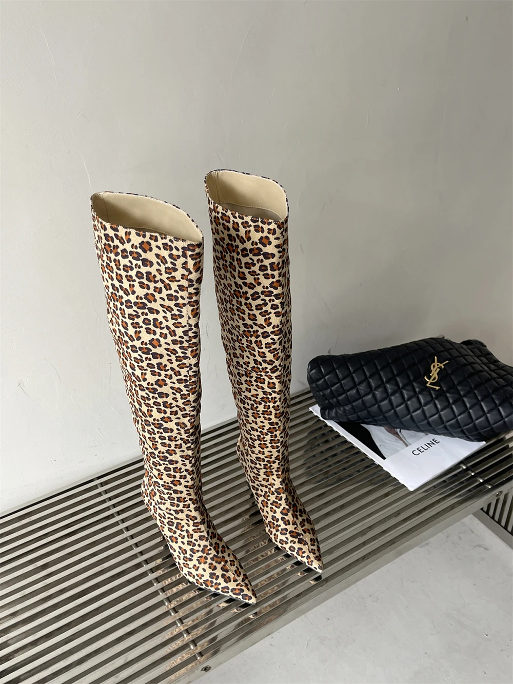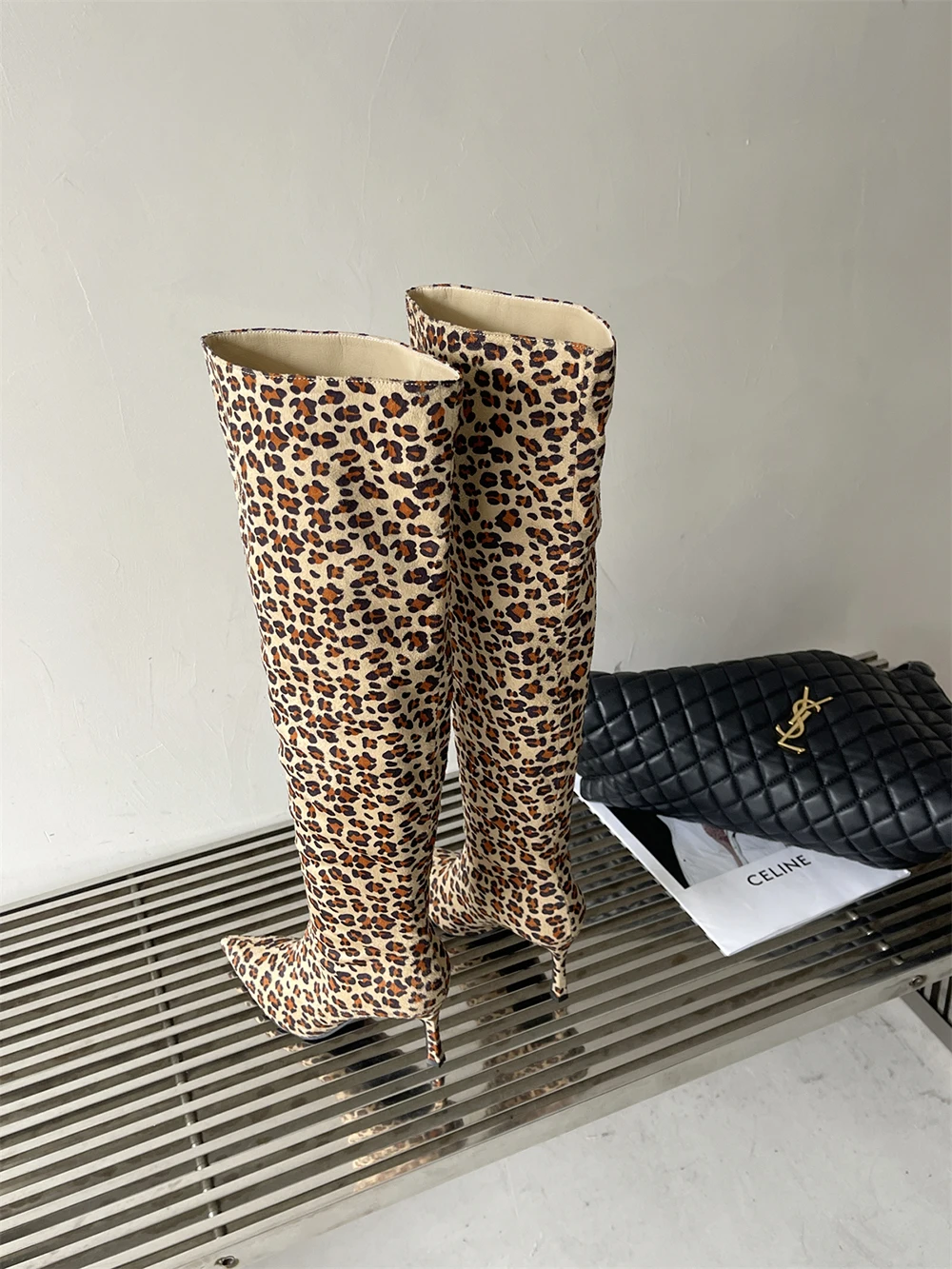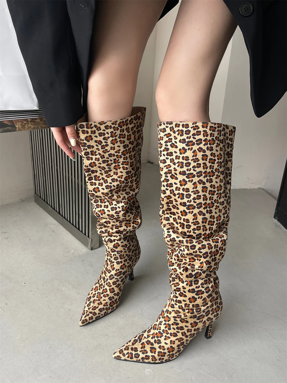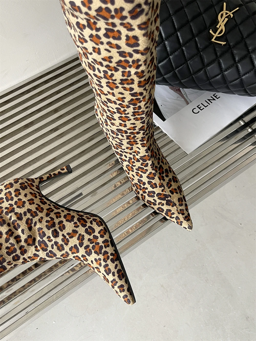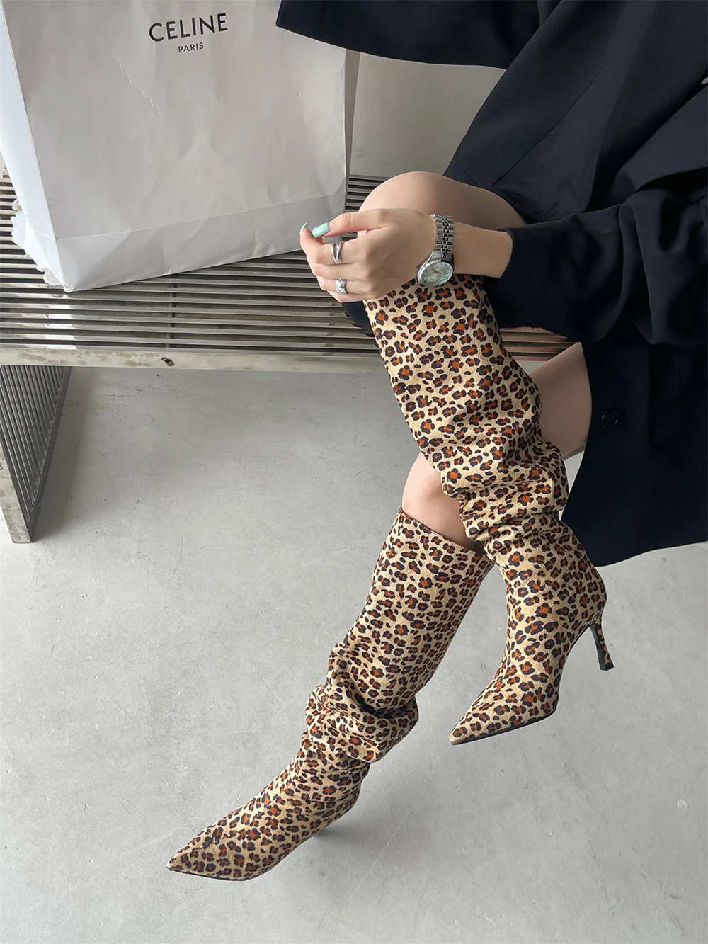 LBSFY - Pointed Toe Women Knee High Boots Chelsea Bootie Black Leopard Beige Zebra Winter Party Pumps Shoes Woman Slip On Size 35-40