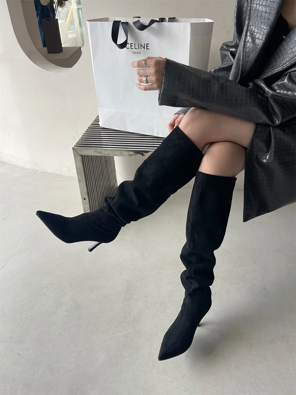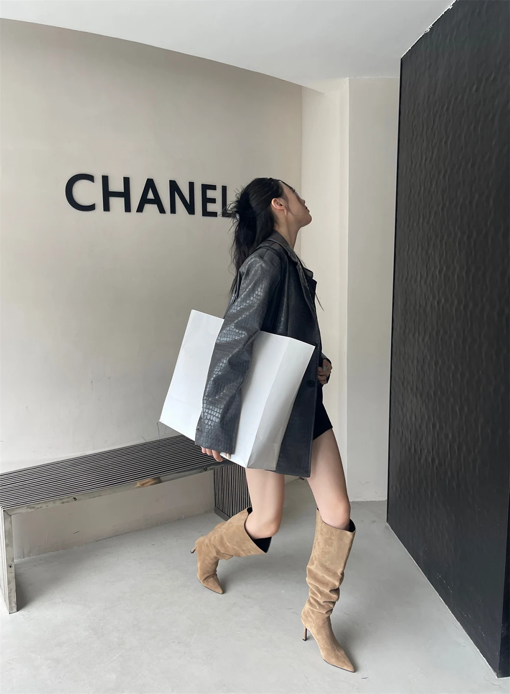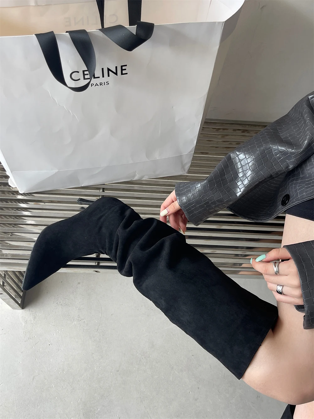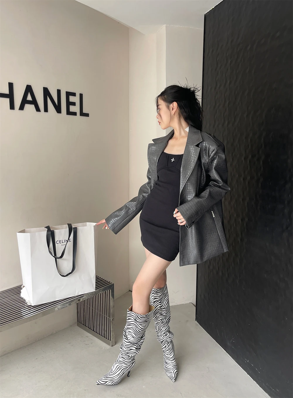 LBSFY - Pointed Toe Women Knee High Boots Chelsea Bootie Black Leopard Beige Zebra Winter Party Pumps Shoes Woman Slip On Size 35-40
