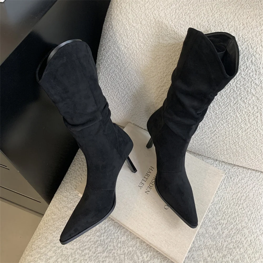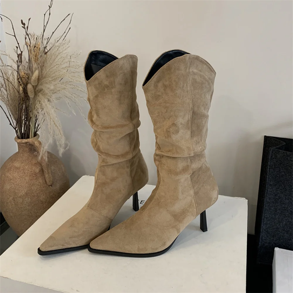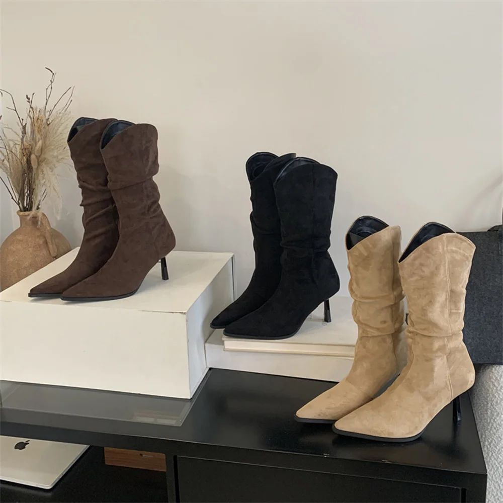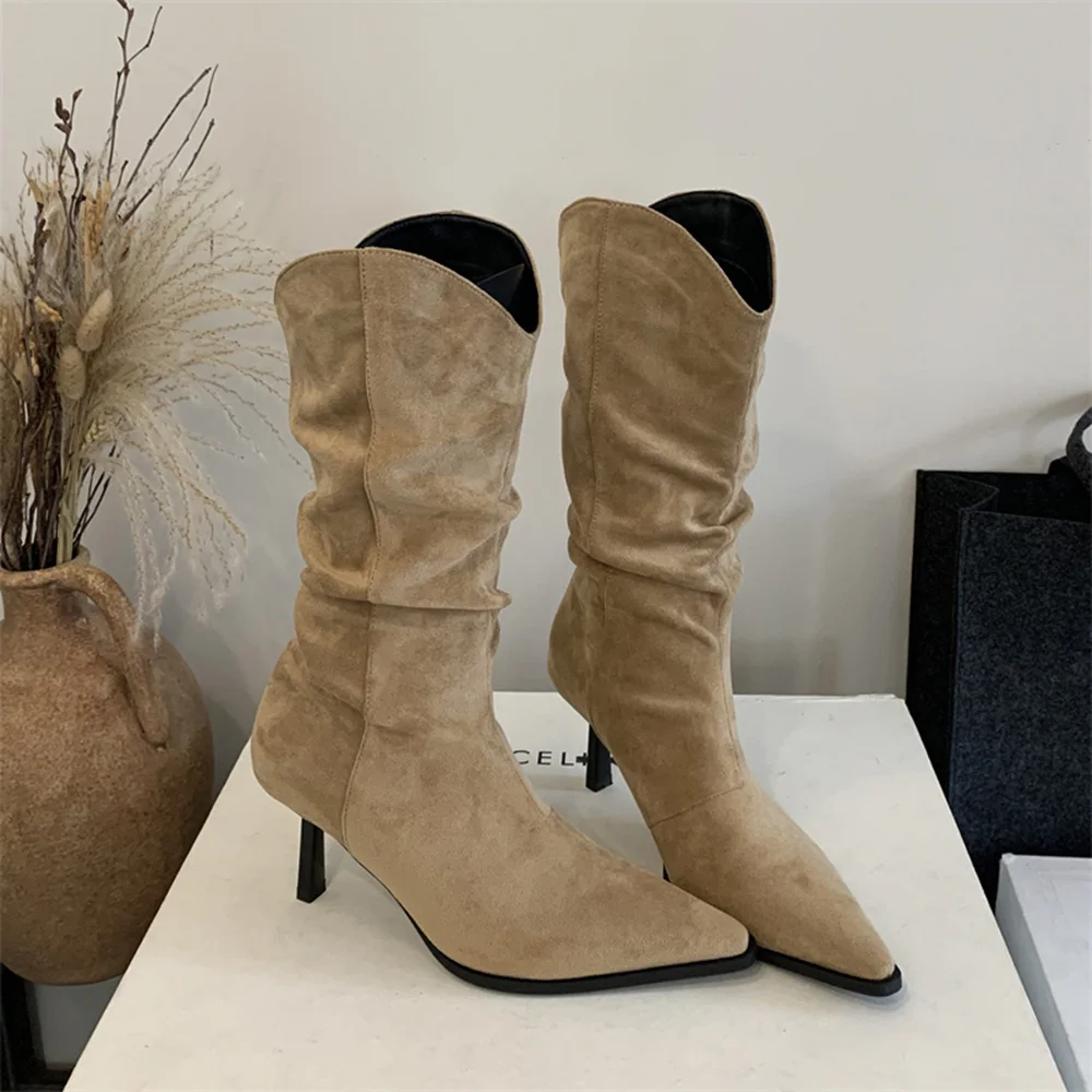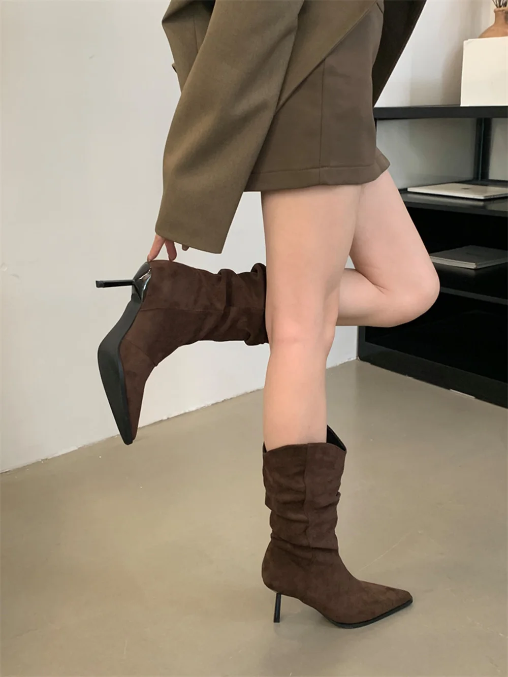 LBSFY - Pointed Toe Women Mid Calf Boots Chelsea Botas Thin High Heels 2024 New Arrivals Black Beige Brown Party Pumps Shoes Woman 35-39