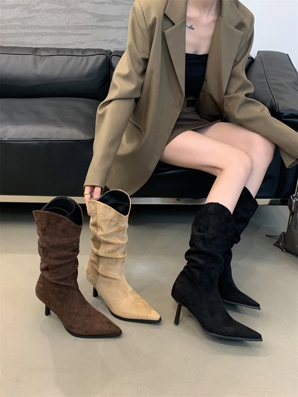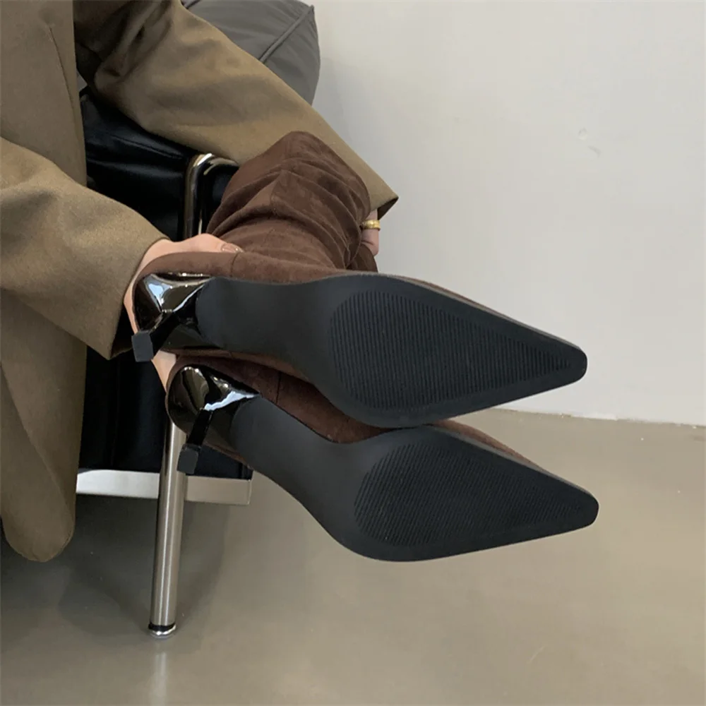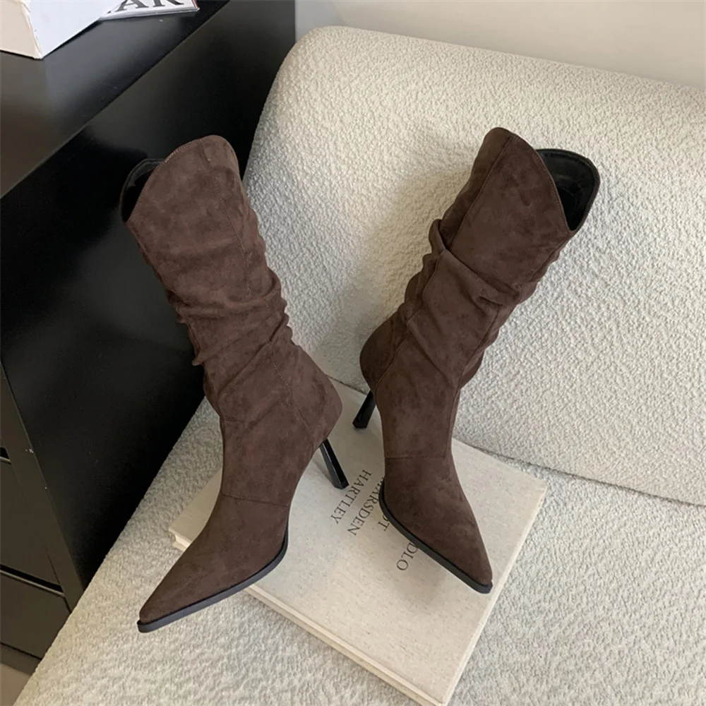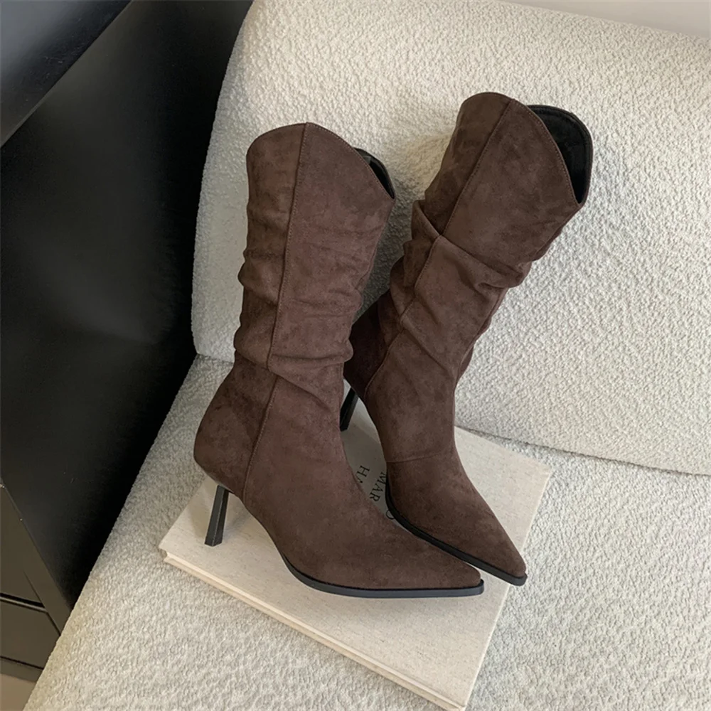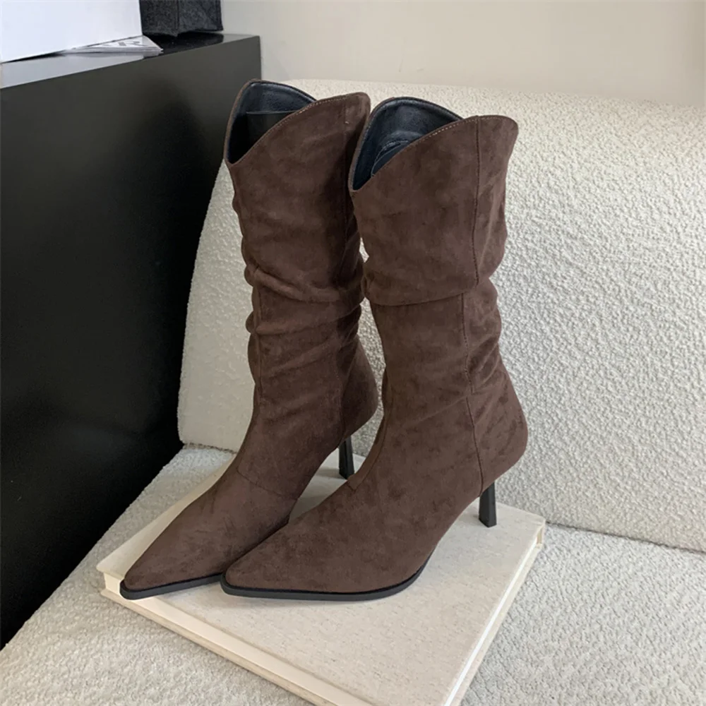LBSFY - Pointed Toe Women Mid Calf Boots Chelsea Botas Thin High Heels 2024 New Arrivals Black Beige Brown Party Pumps Shoes Woman 35-39