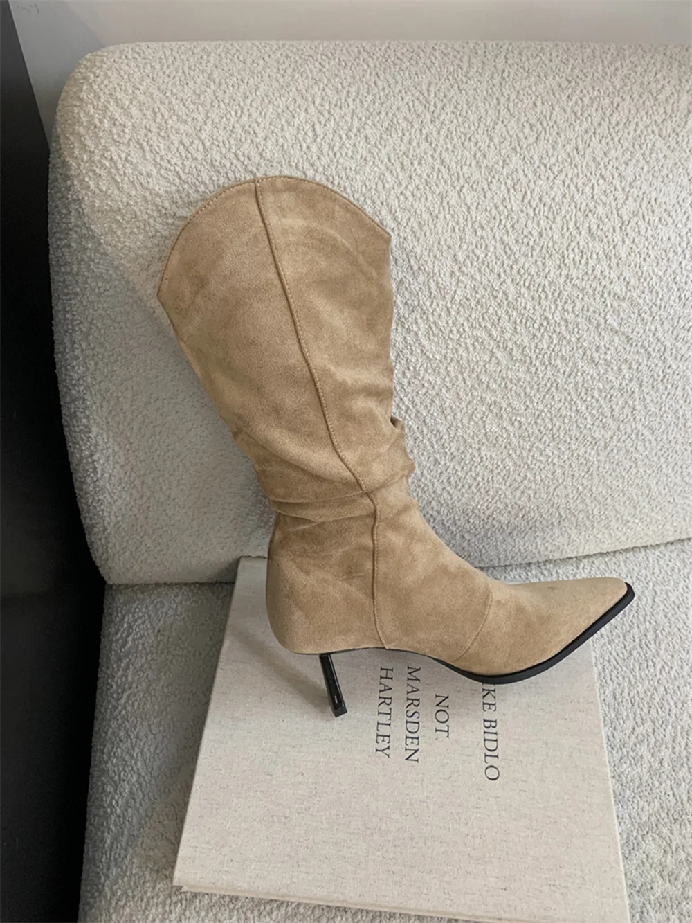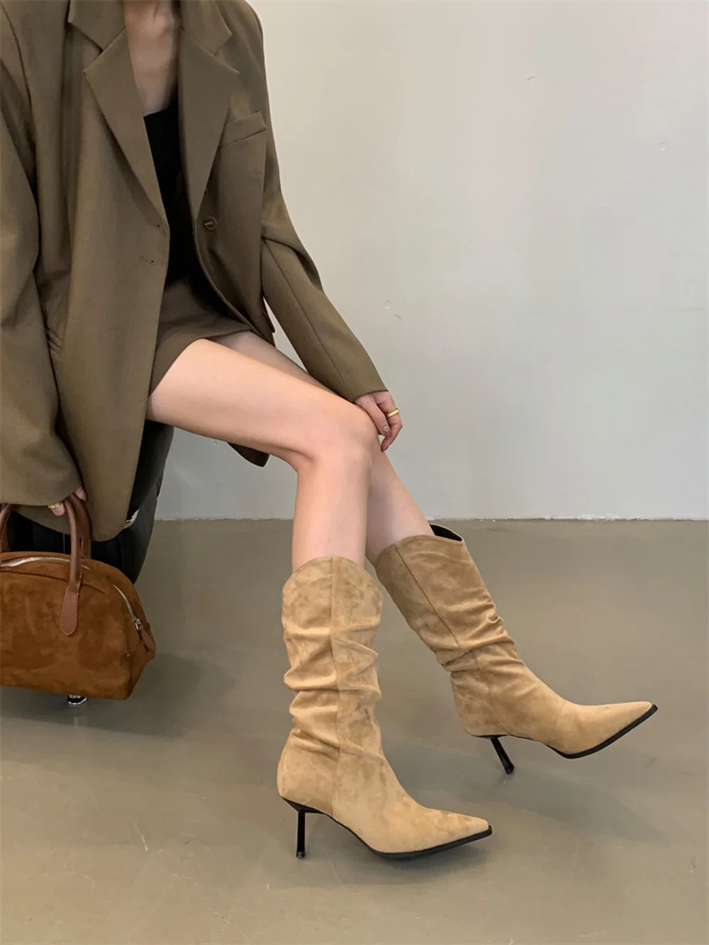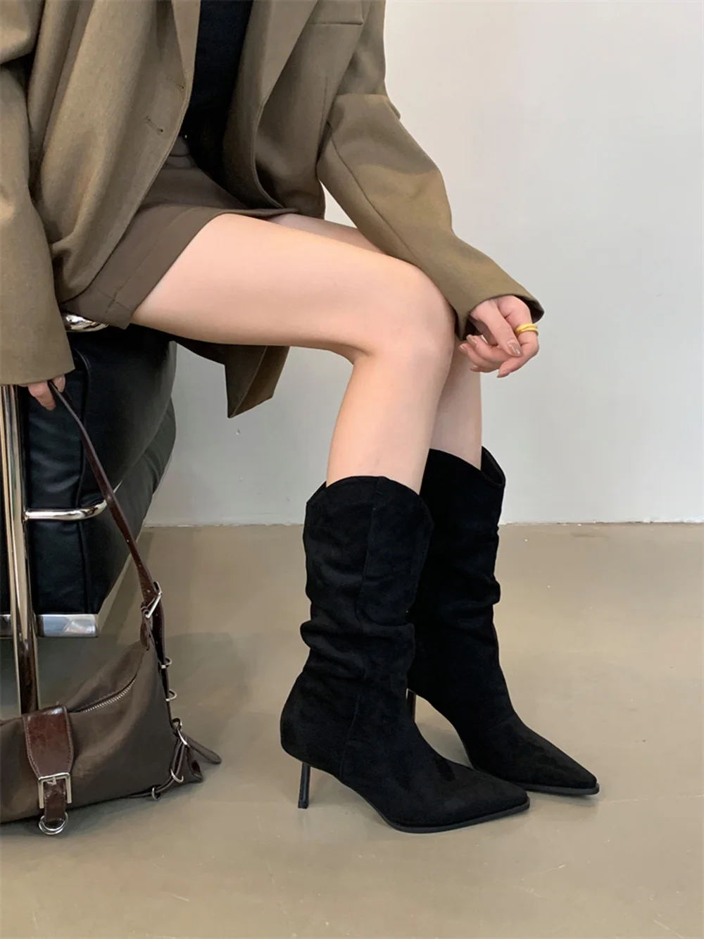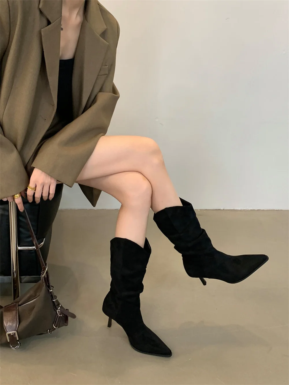 LBSFY - Pointed Toe Women Mid Calf Boots Chelsea Botas Thin High Heels 2024 New Arrivals Black Beige Brown Party Pumps Shoes Woman 35-39