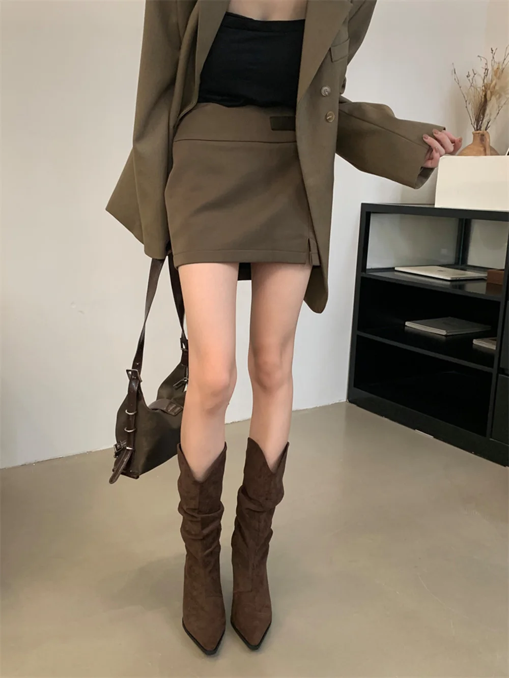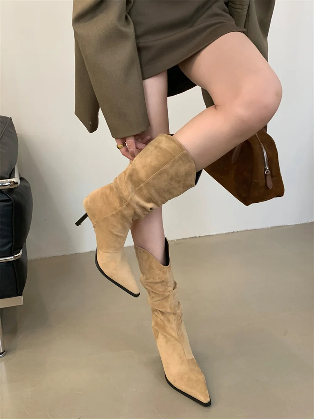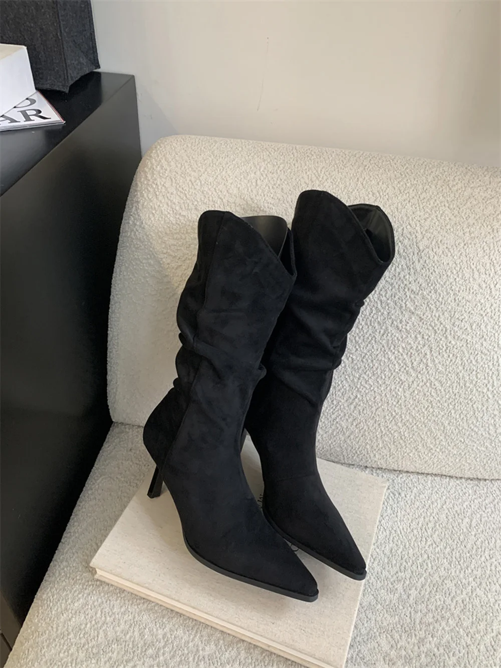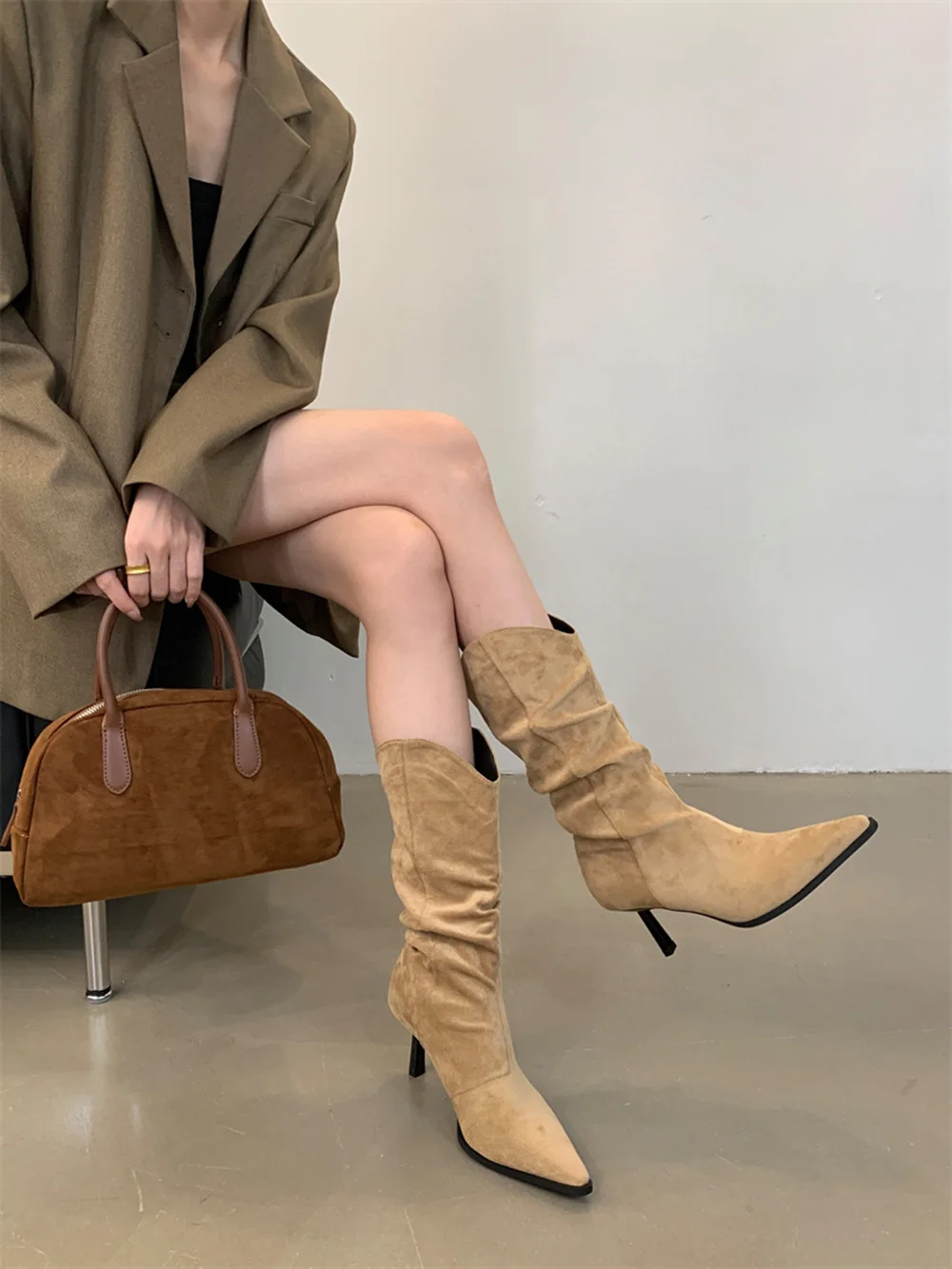 LBSFY - Pointed Toe Women Mid Calf Boots Chelsea Botas Thin High Heels 2024 New Arrivals Black Beige Brown Party Pumps Shoes Woman 35-39