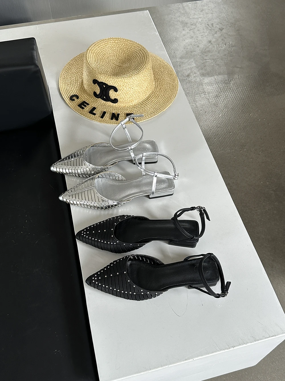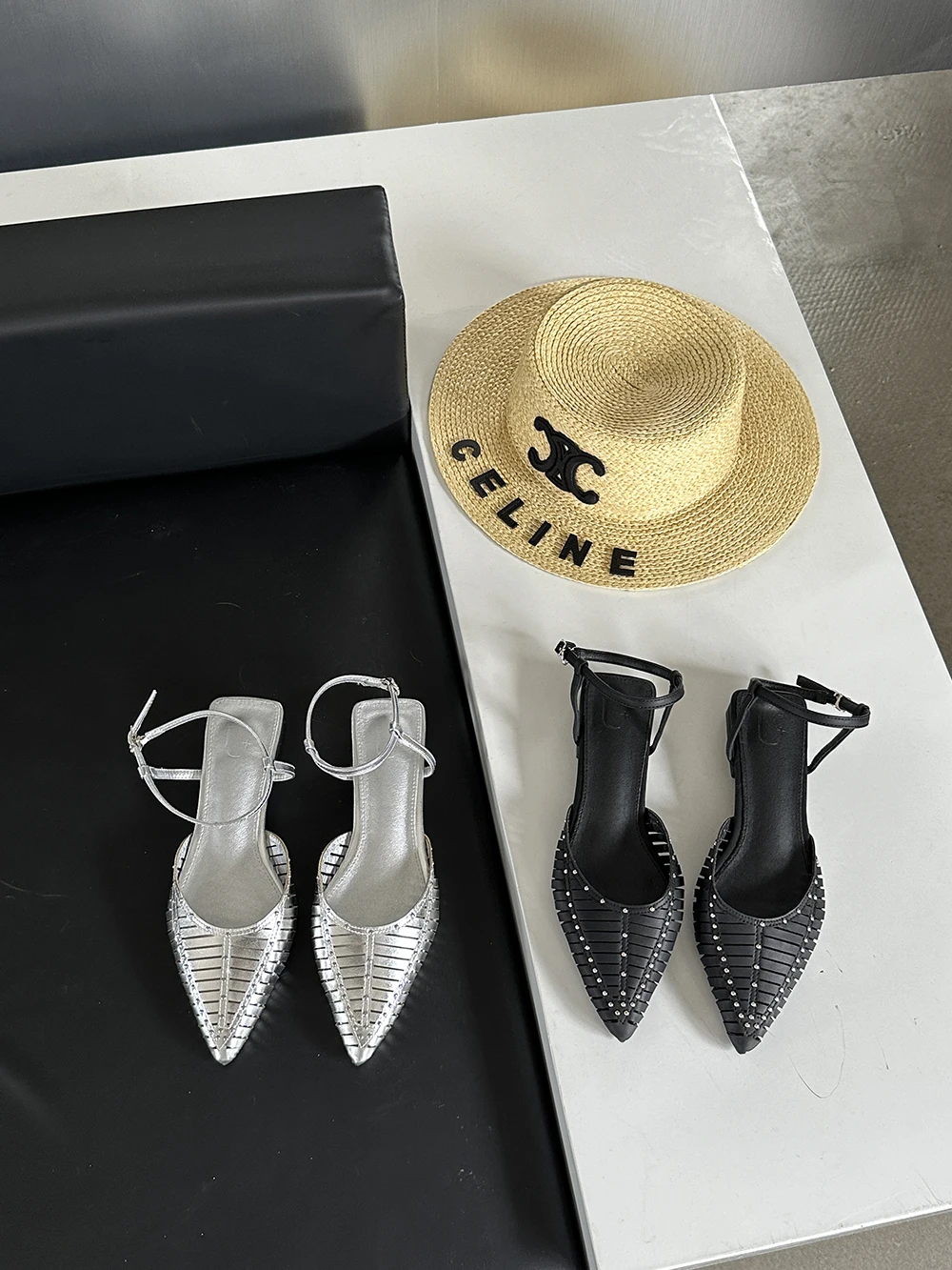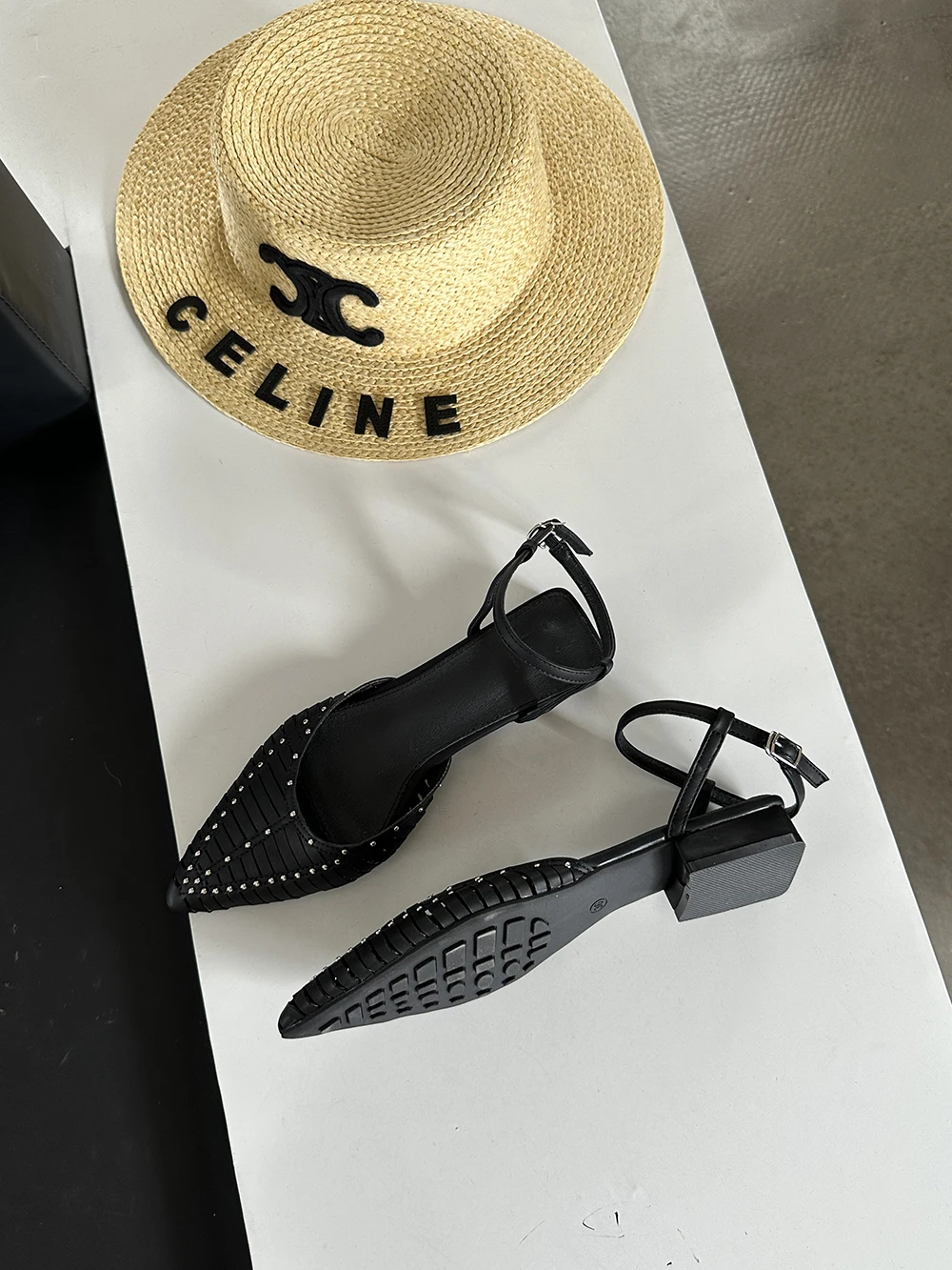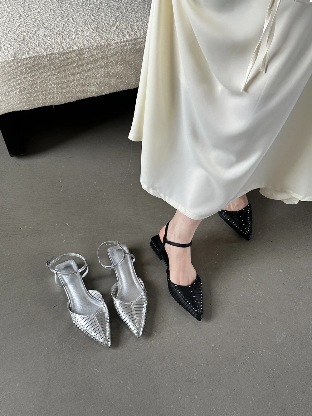LBSFY - Pointed Toe Women Sandals 2024 New Arrivals Ankle Strap Black Silver Summer Flat Low Heeled Rhinestone Party Sandals Size 35-39