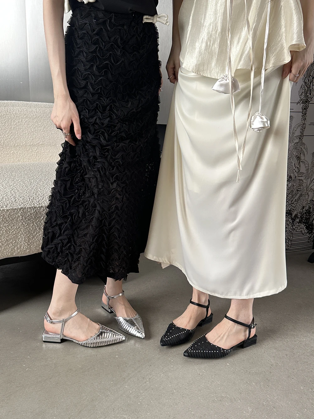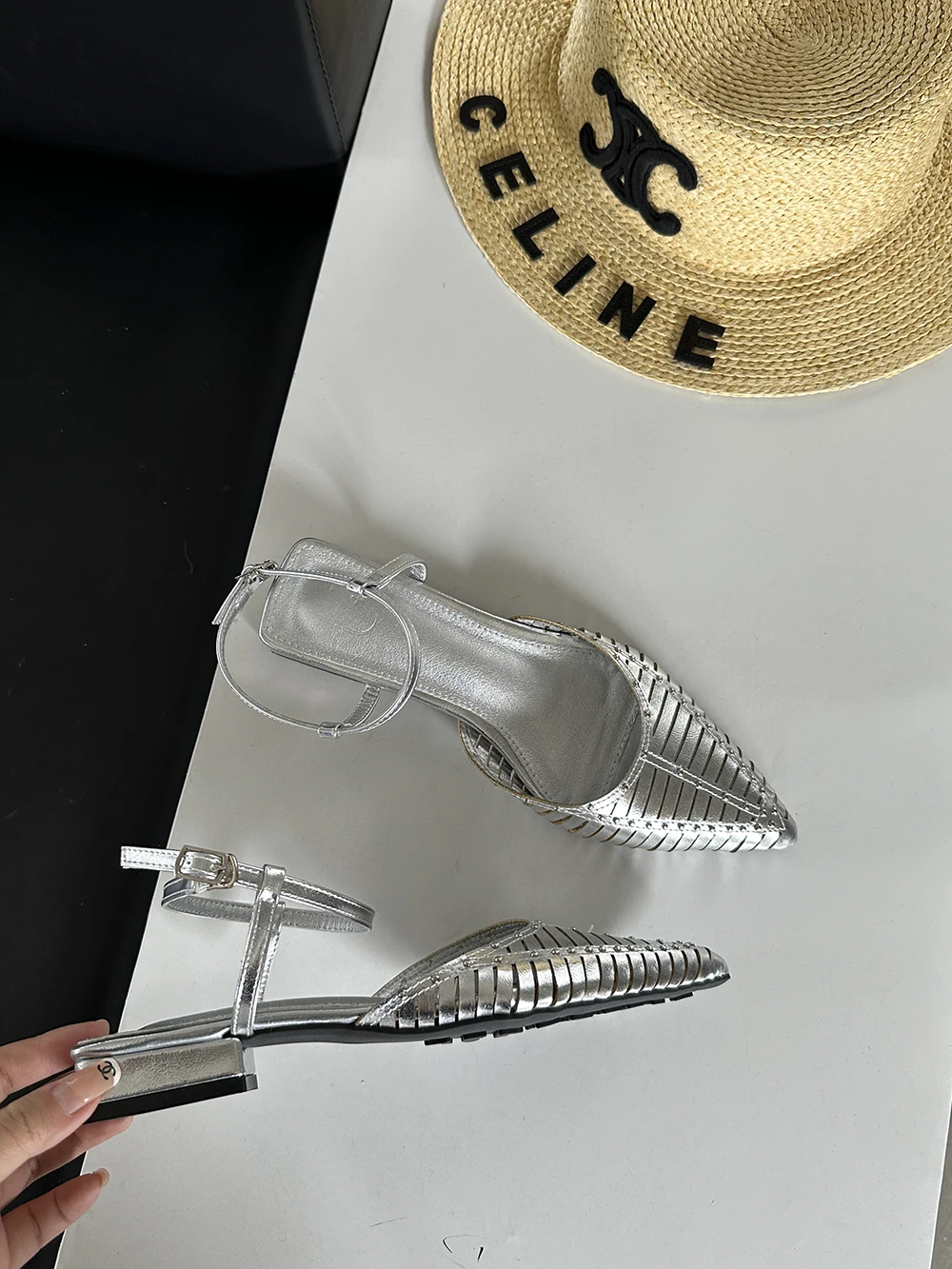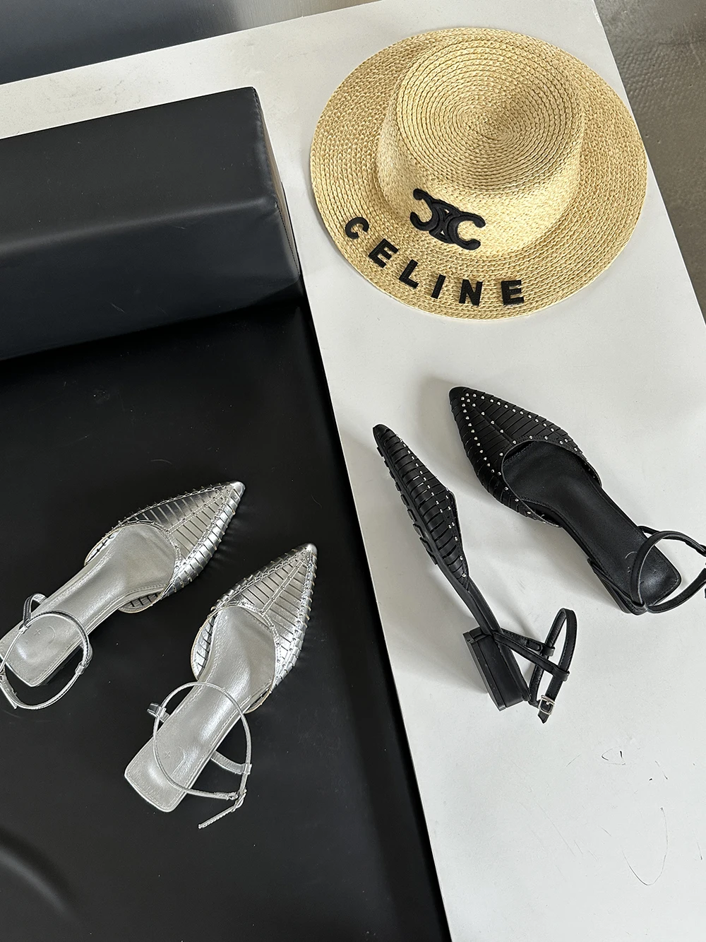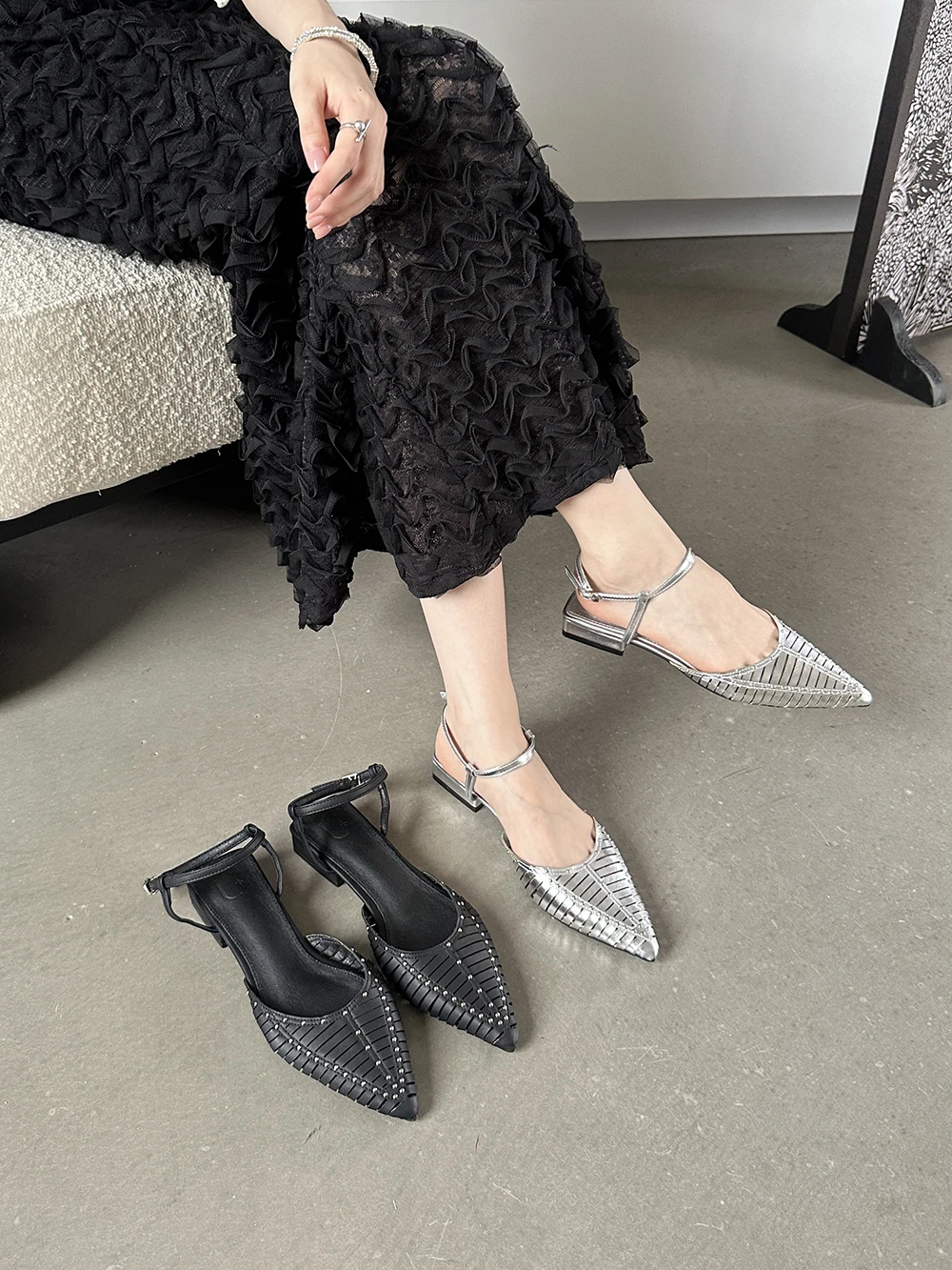 LBSFY - Pointed Toe Women Sandals 2024 New Arrivals Ankle Strap Black Silver Summer Flat Low Heeled Rhinestone Party Sandals Size 35-39