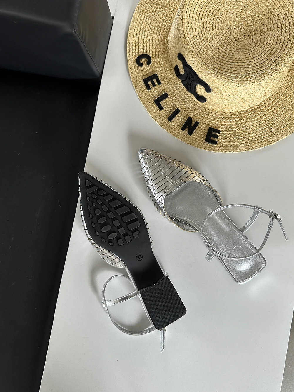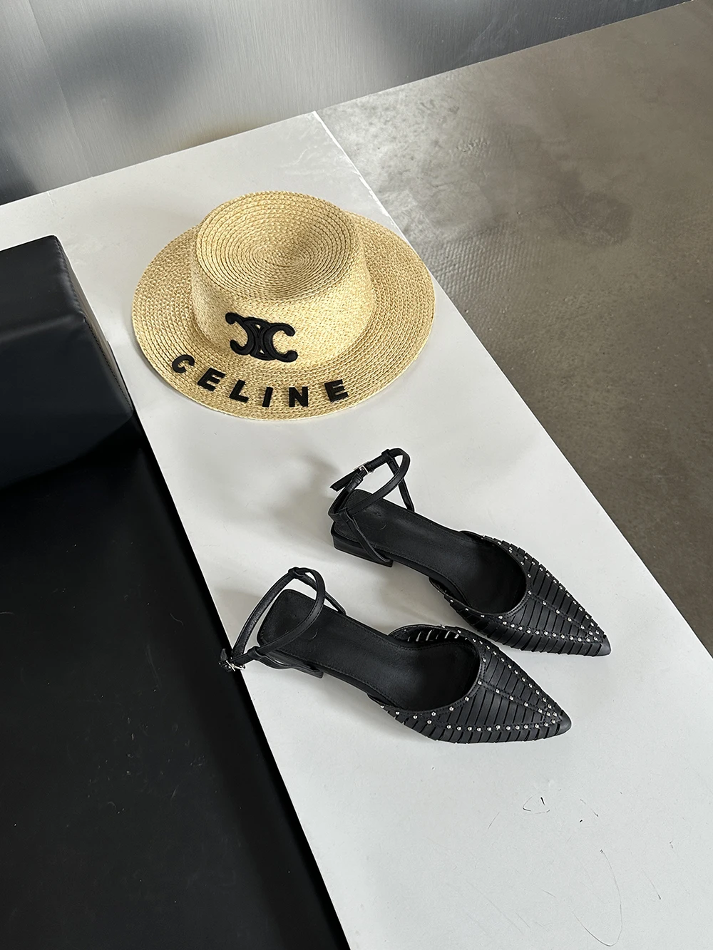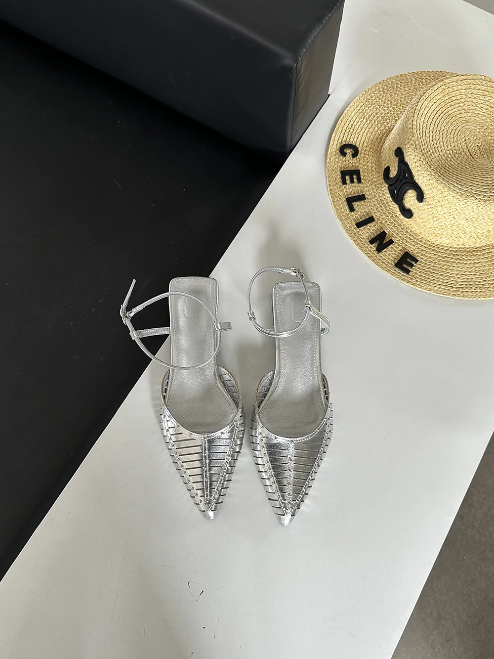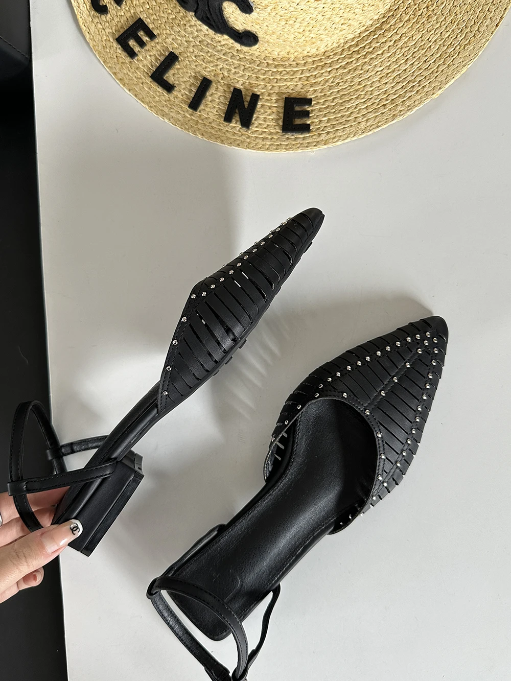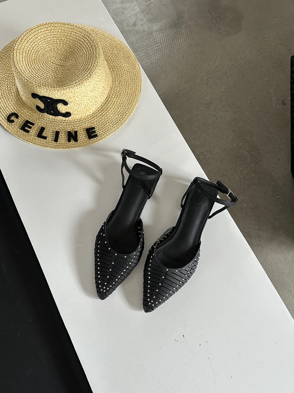 LBSFY - Pointed Toe Women Sandals 2024 New Arrivals Ankle Strap Black Silver Summer Flat Low Heeled Rhinestone Party Sandals Size 35-39