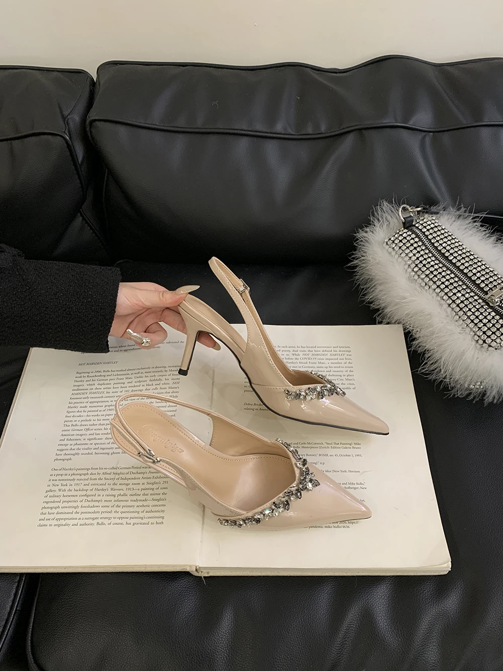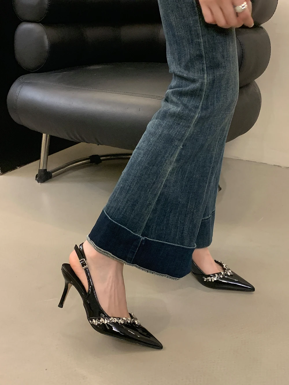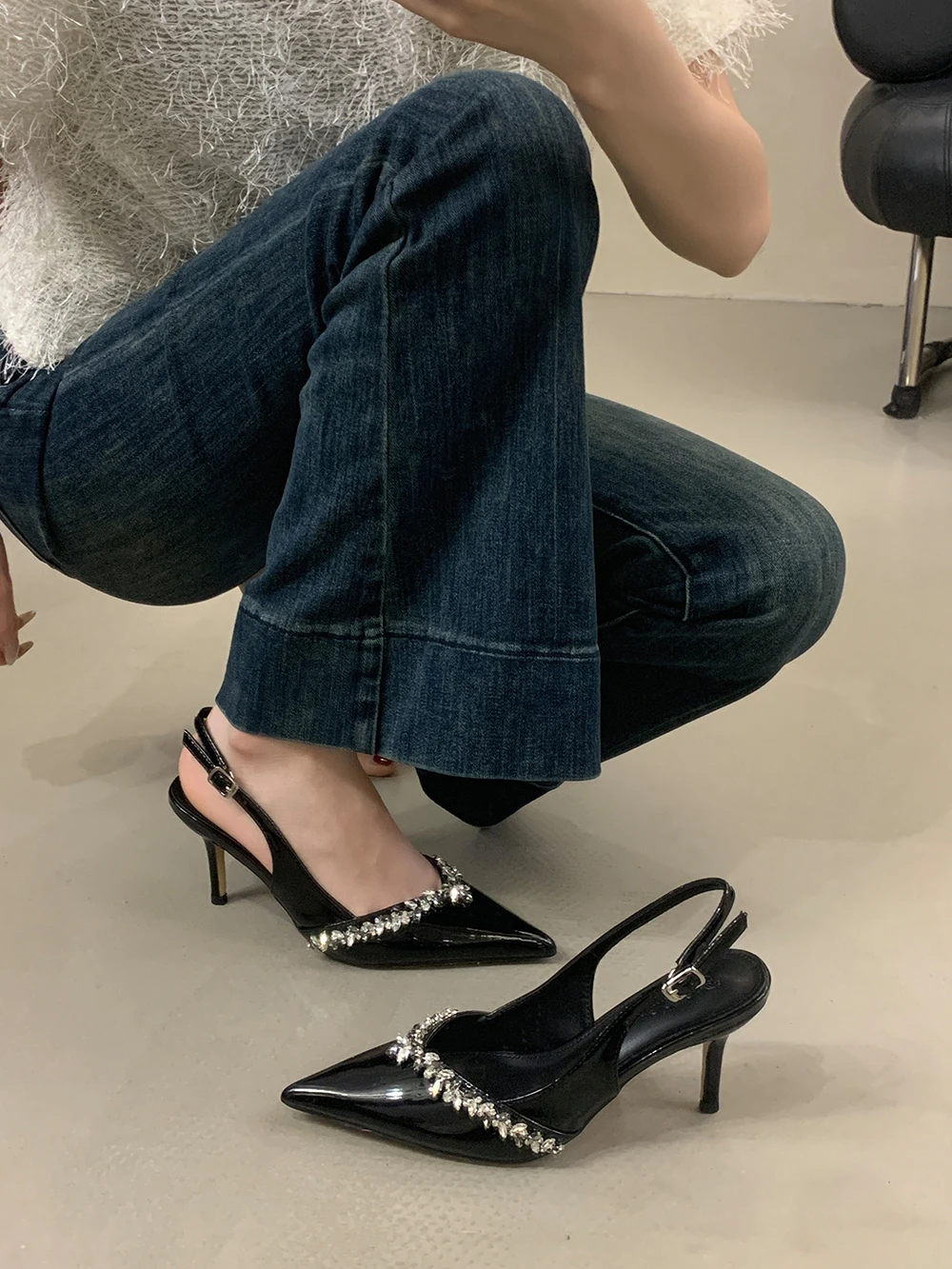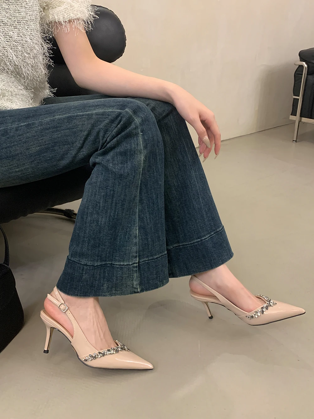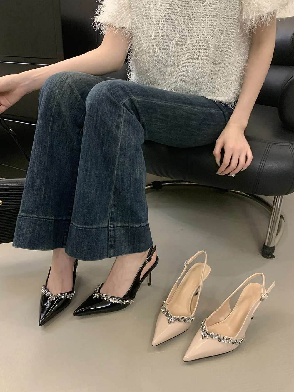LBSFY - Pointed Toe Women Sandals Beige Black Rhinestone Chain Stiletto High Heels 2024 New Arrivals Back Strap Belt Buckle Party Pumps