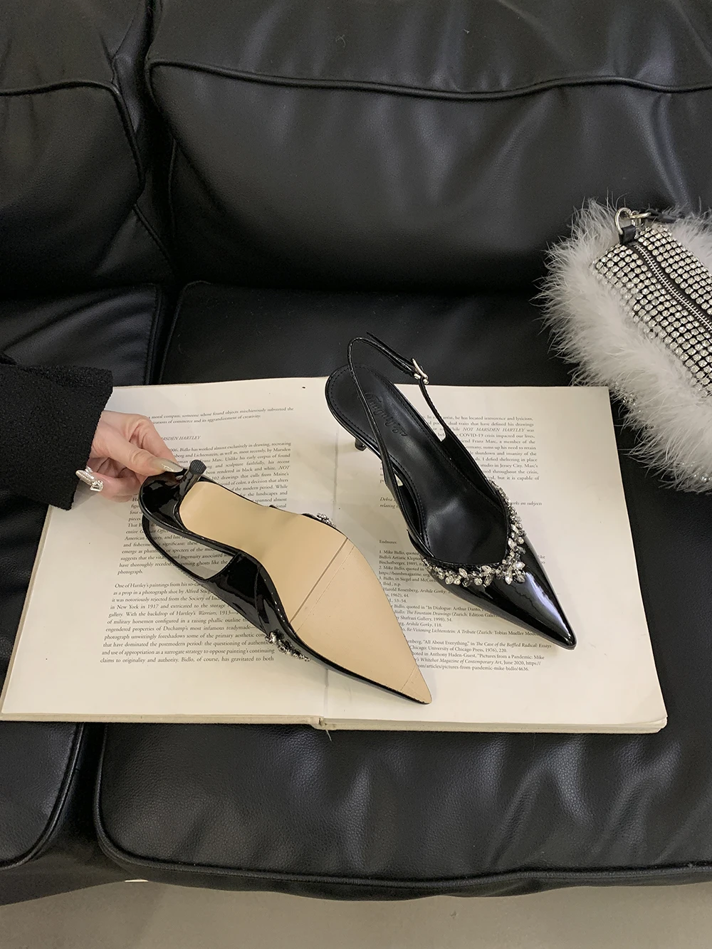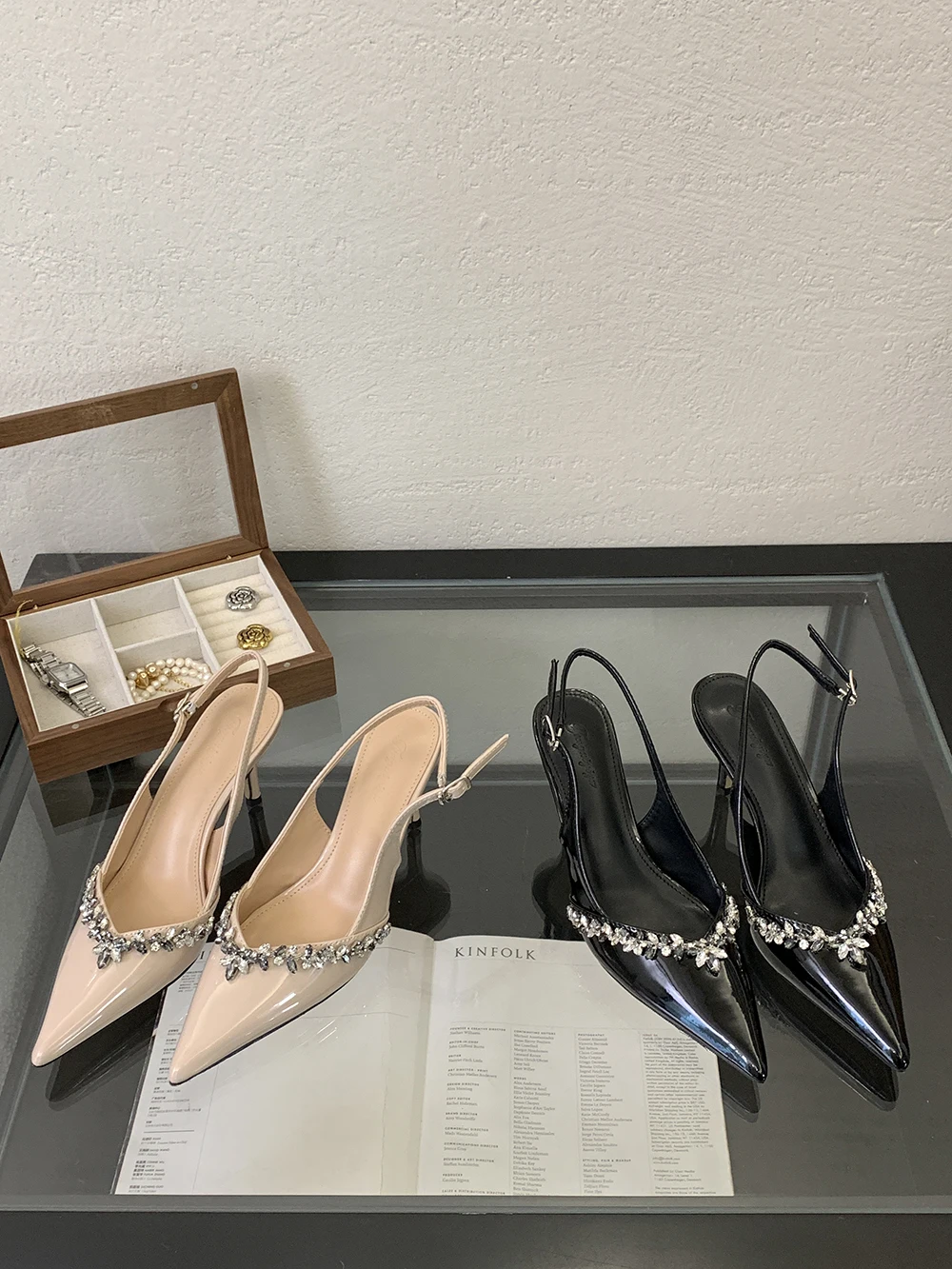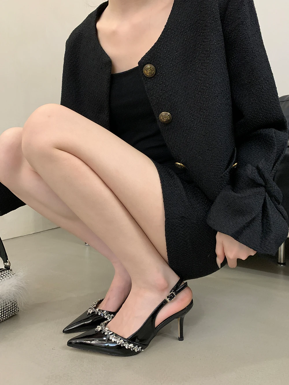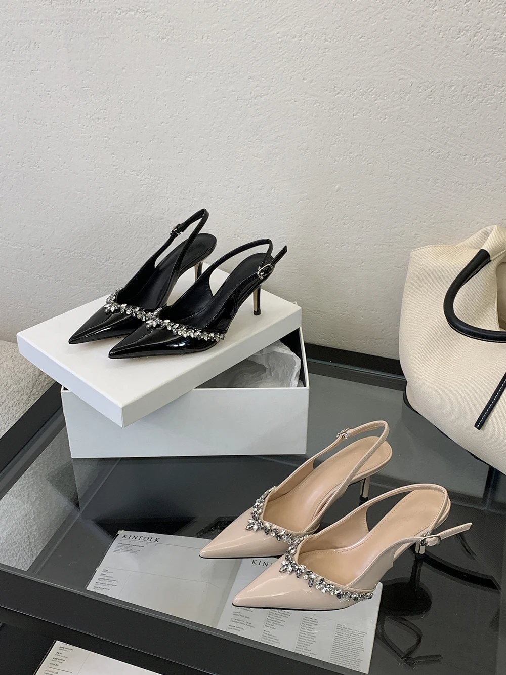 LBSFY - Pointed Toe Women Sandals Beige Black Rhinestone Chain Stiletto High Heels 2024 New Arrivals Back Strap Belt Buckle Party Pumps