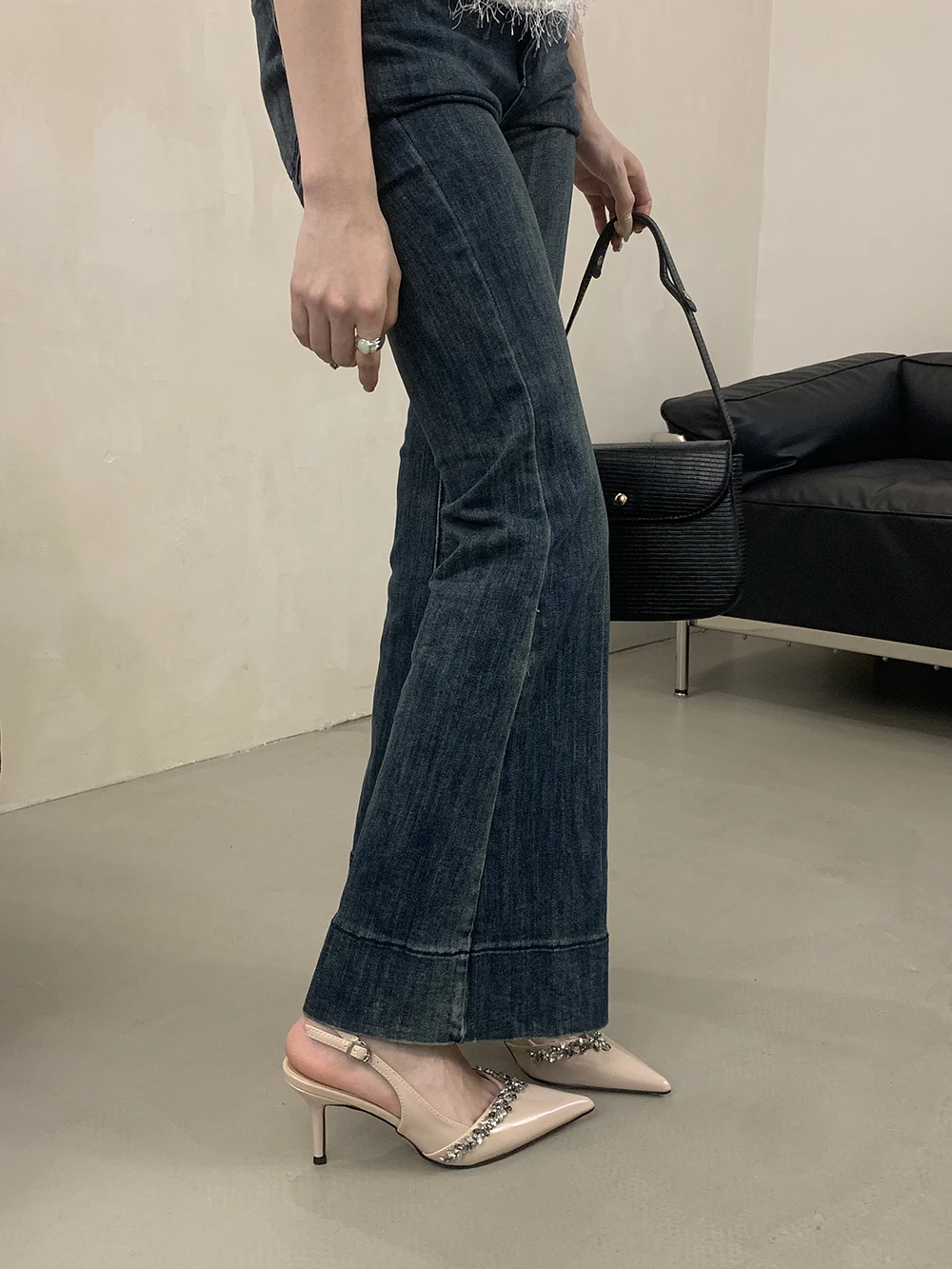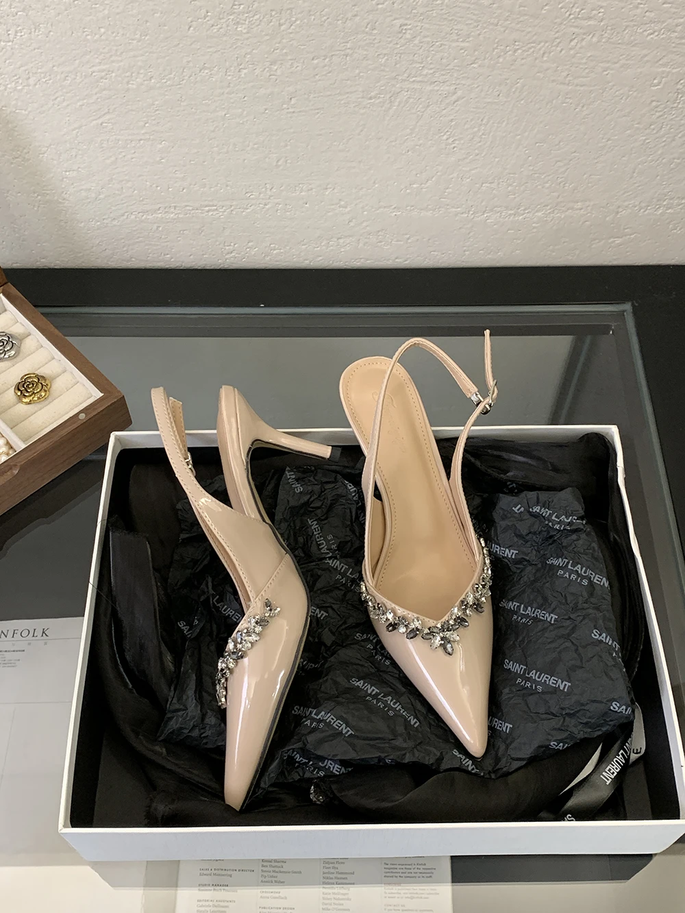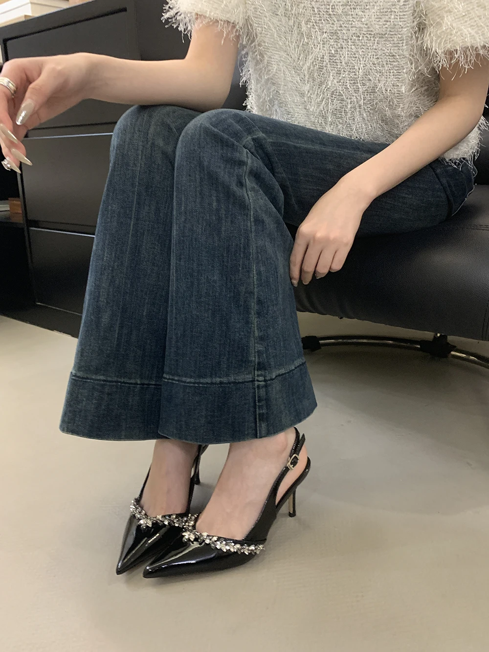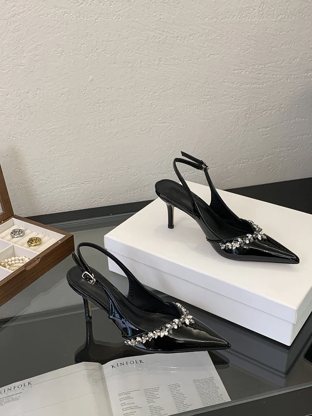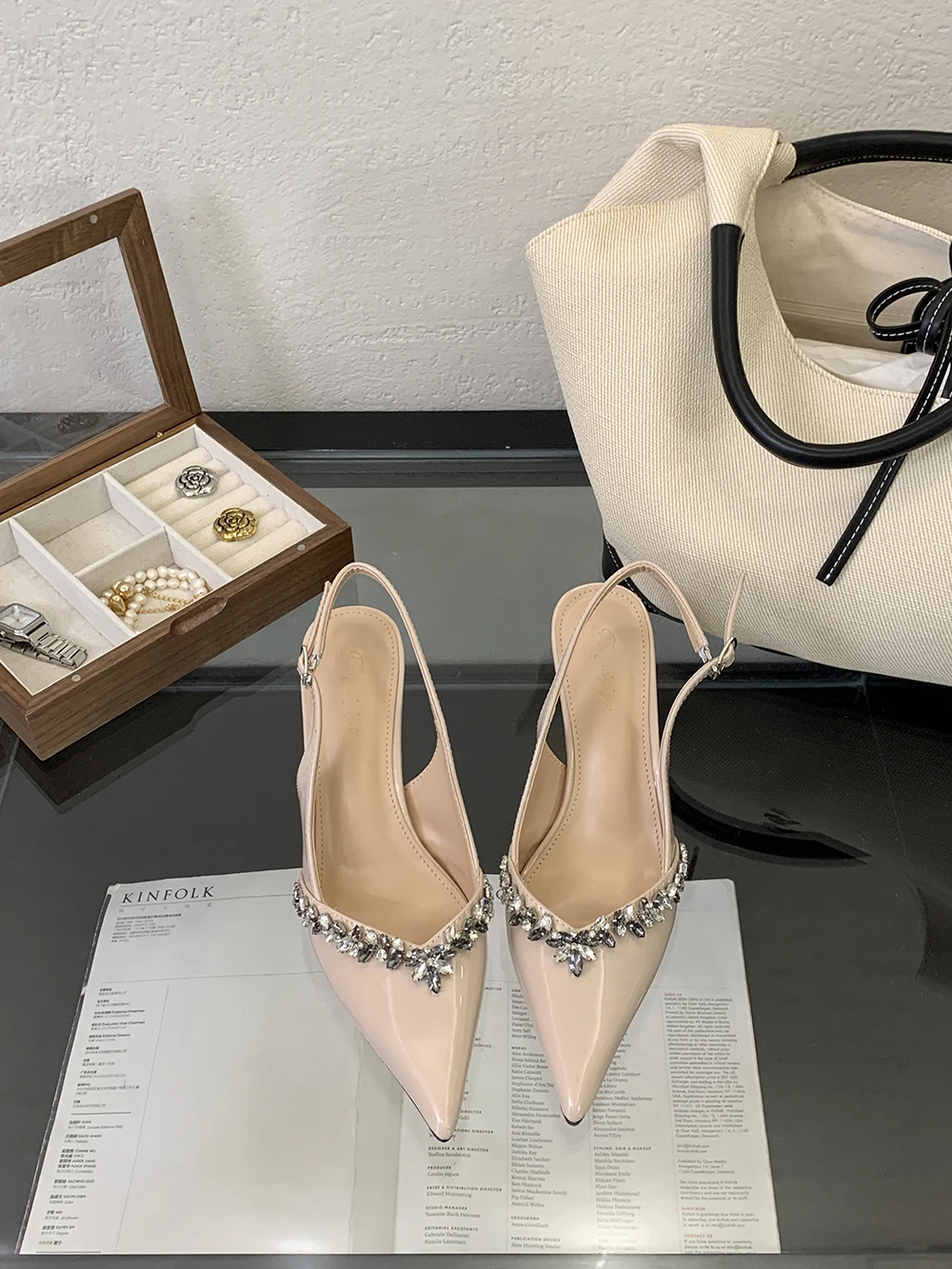 LBSFY - Pointed Toe Women Sandals Beige Black Rhinestone Chain Stiletto High Heels 2024 New Arrivals Back Strap Belt Buckle Party Pumps