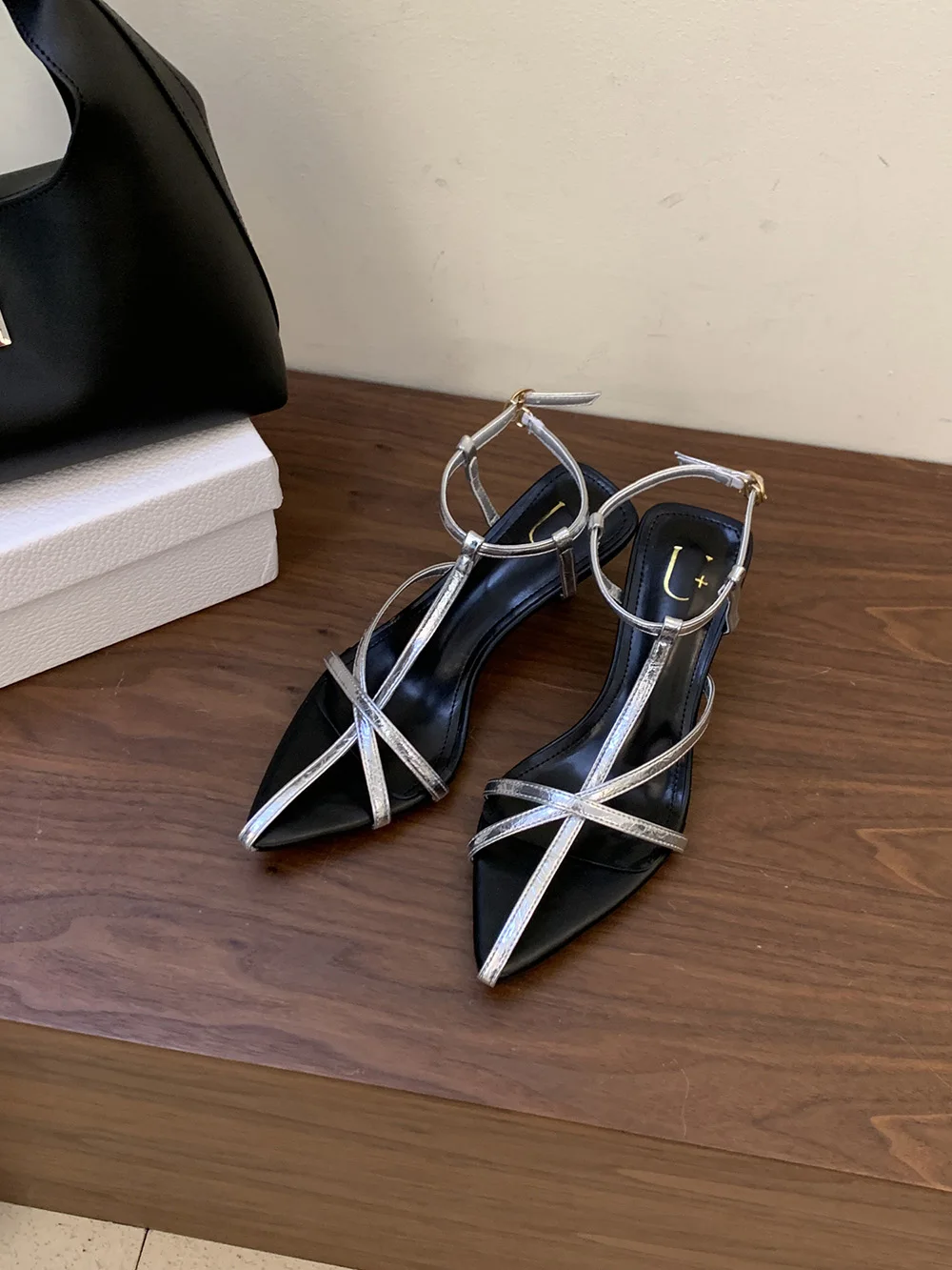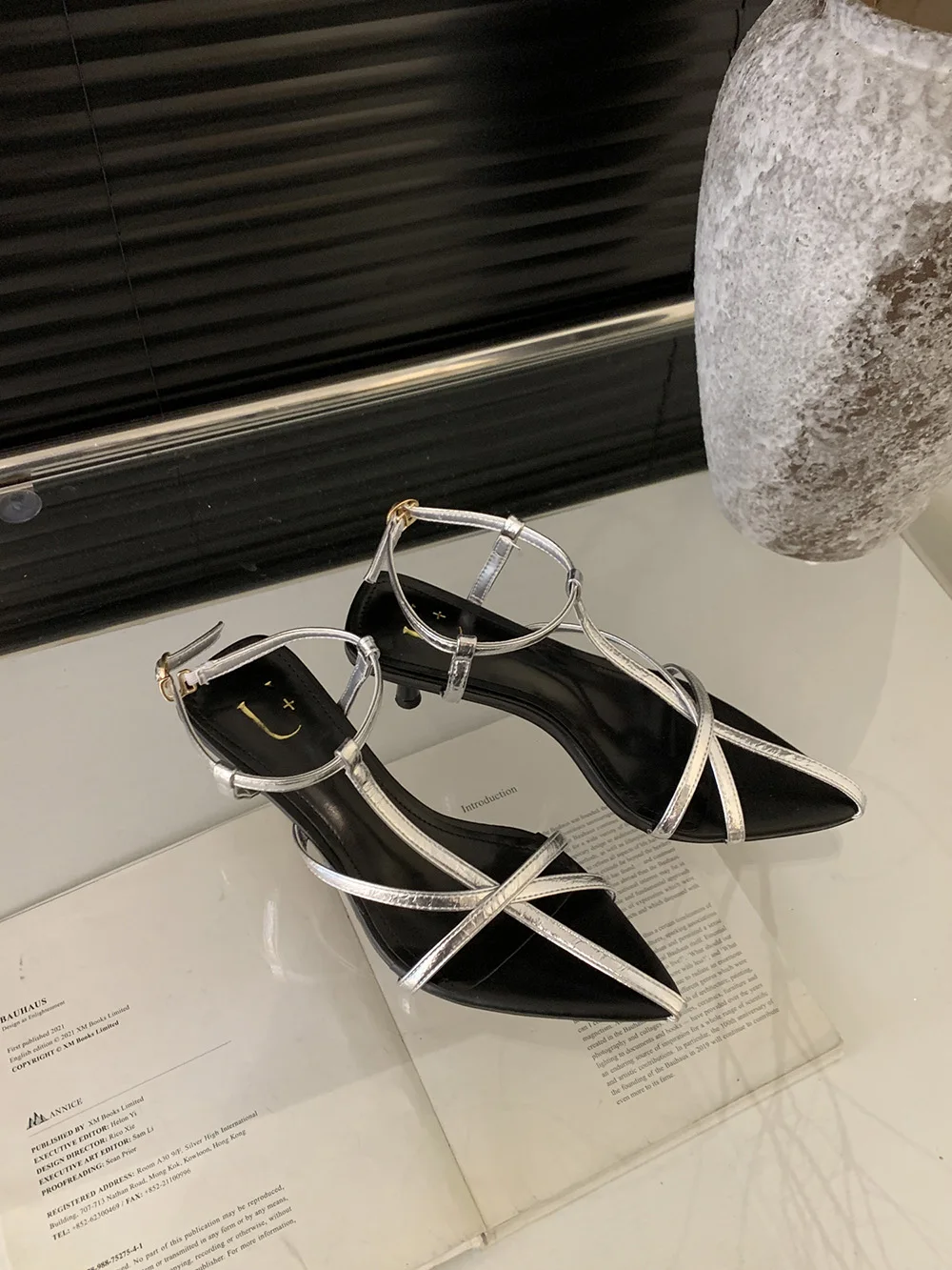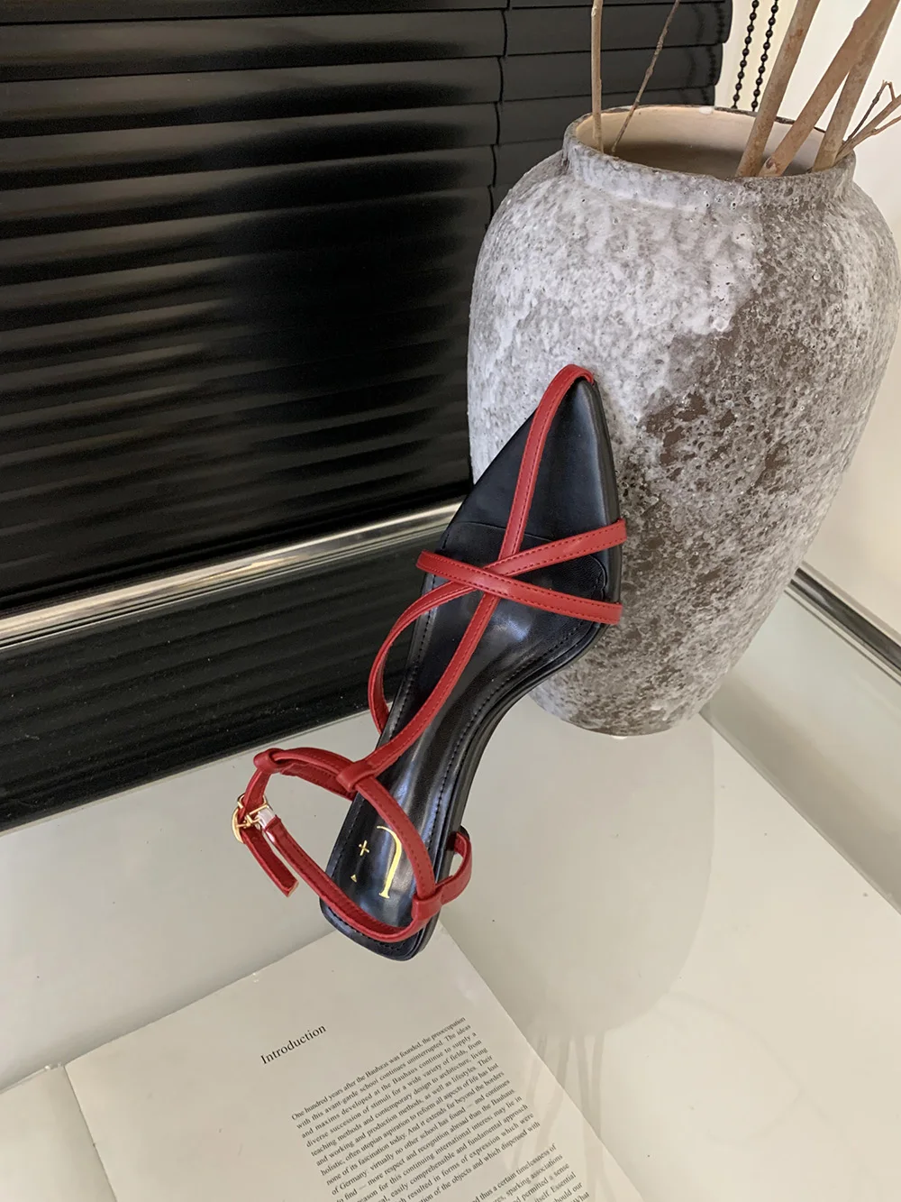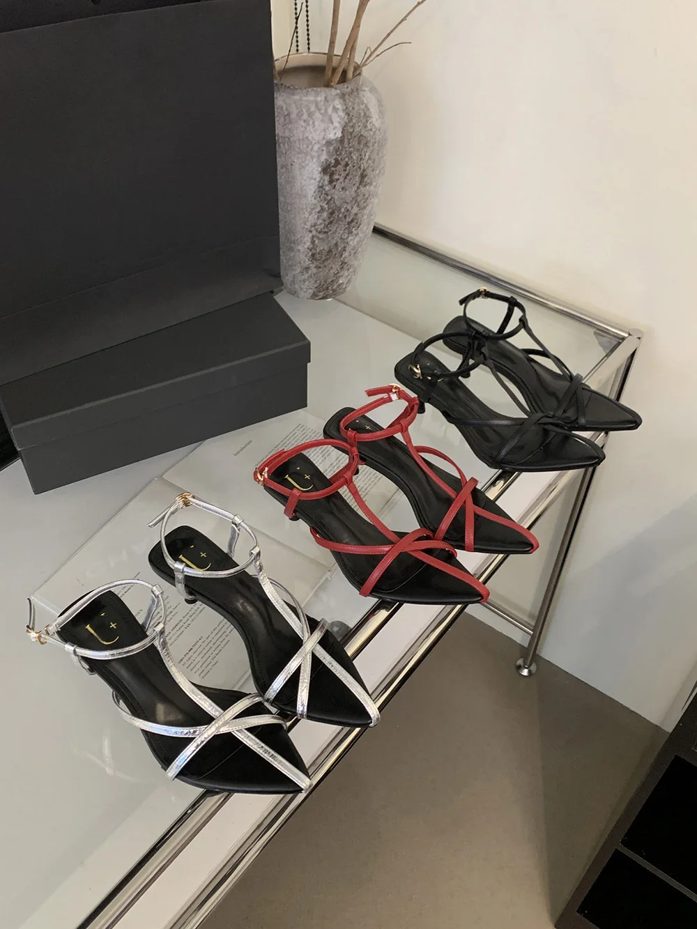LBSFY - Pointed Toe Women Sandals Fashion Dress Party Pumps Thin High Heels Ankle Strap Black Red Silver Hollow Design Wedding Pumps