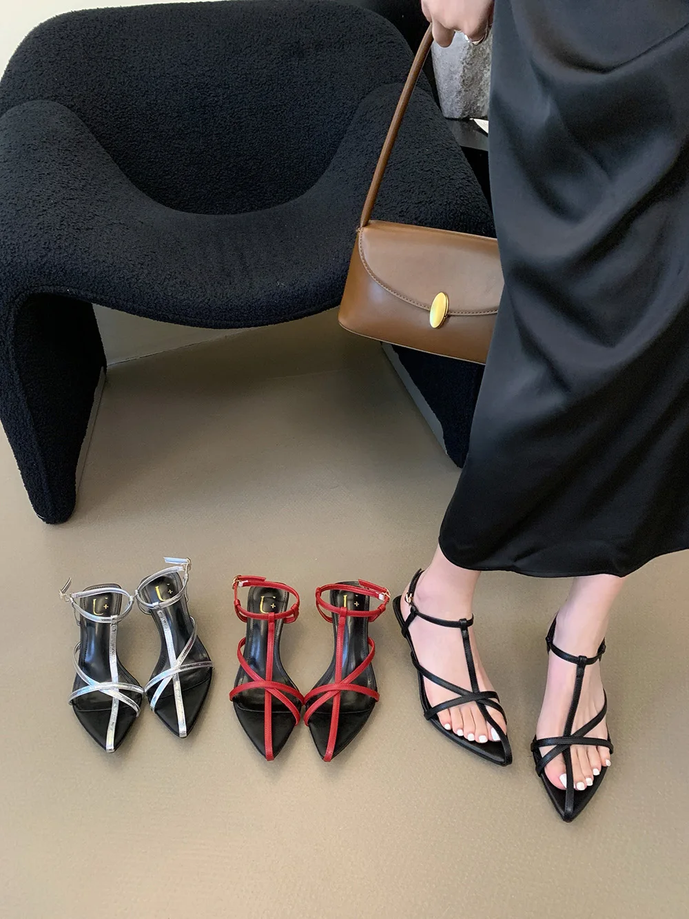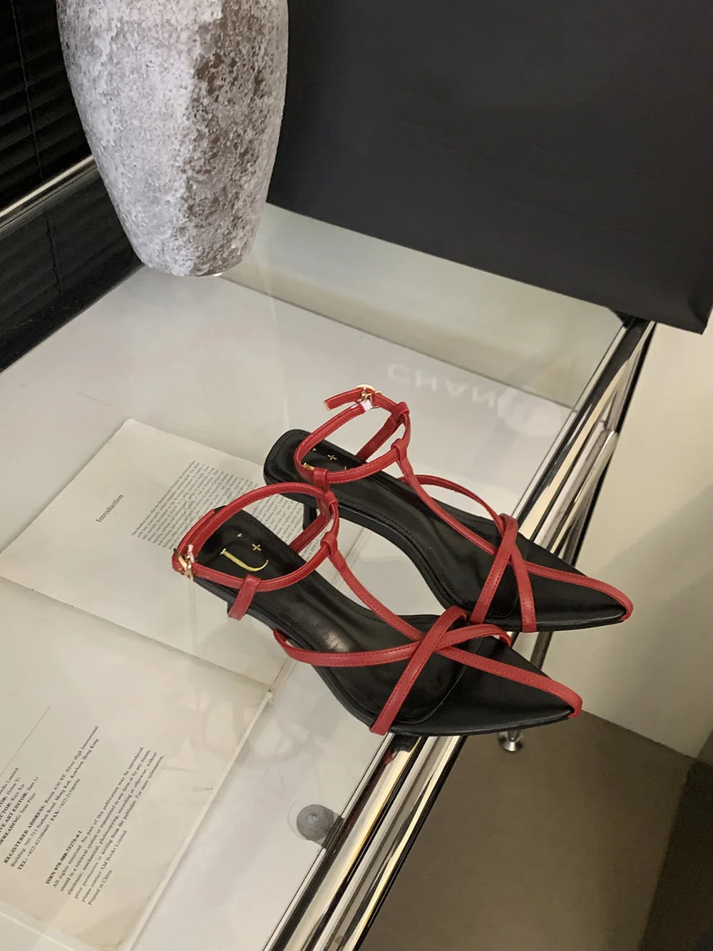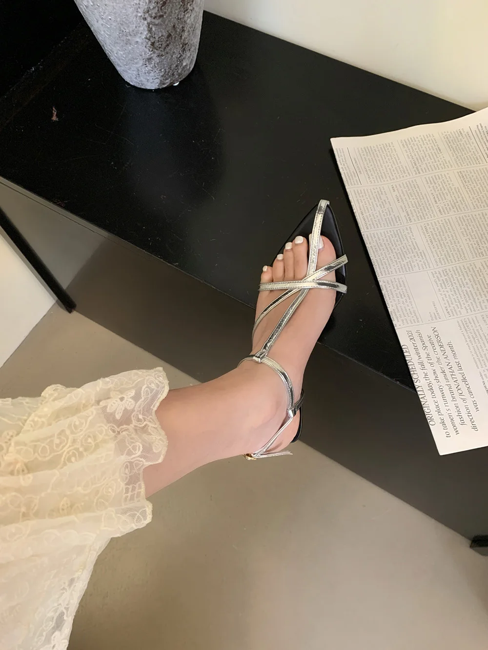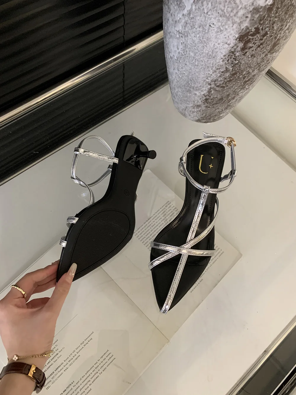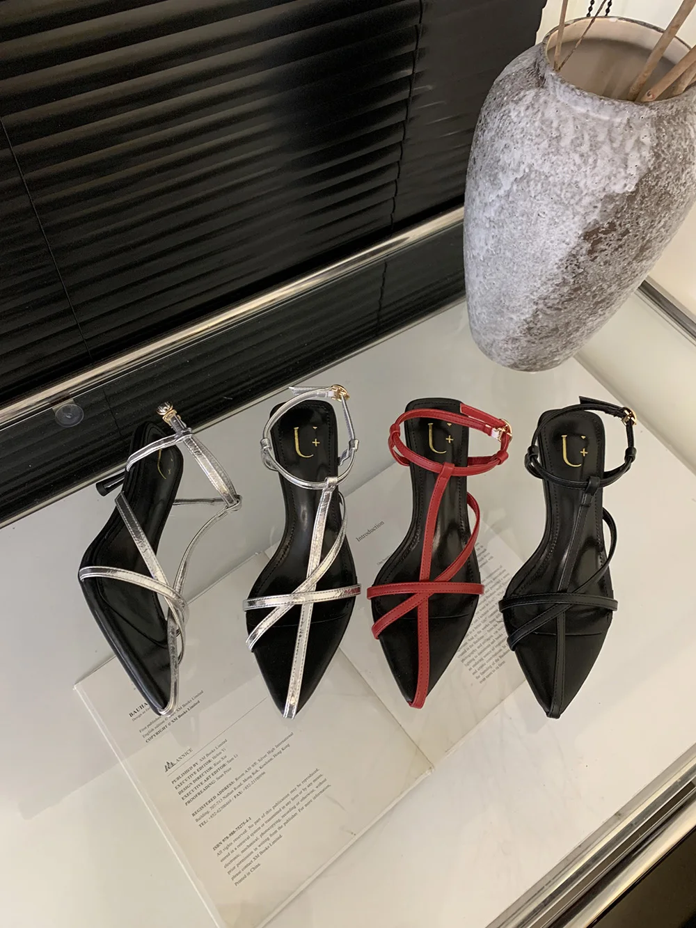 LBSFY - Pointed Toe Women Sandals Fashion Dress Party Pumps Thin High Heels Ankle Strap Black Red Silver Hollow Design Wedding Pumps
