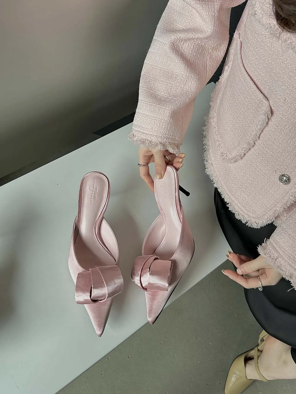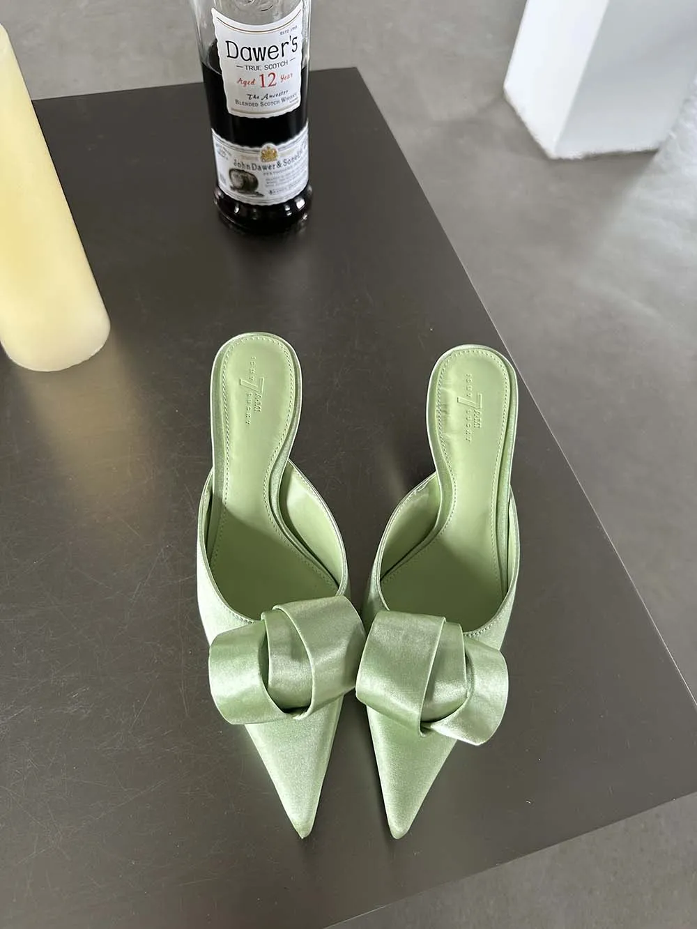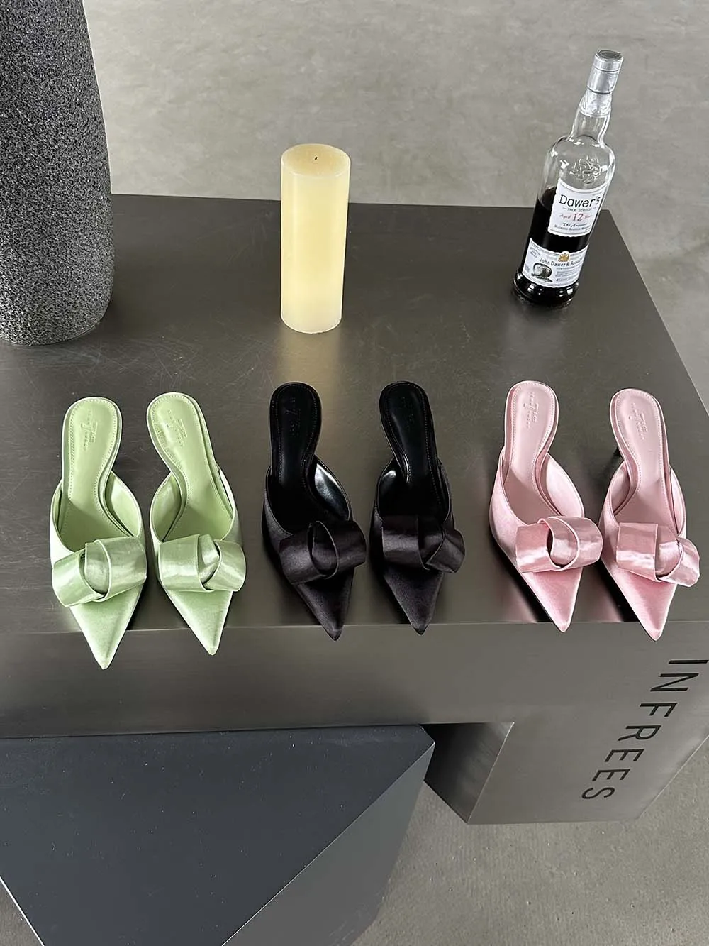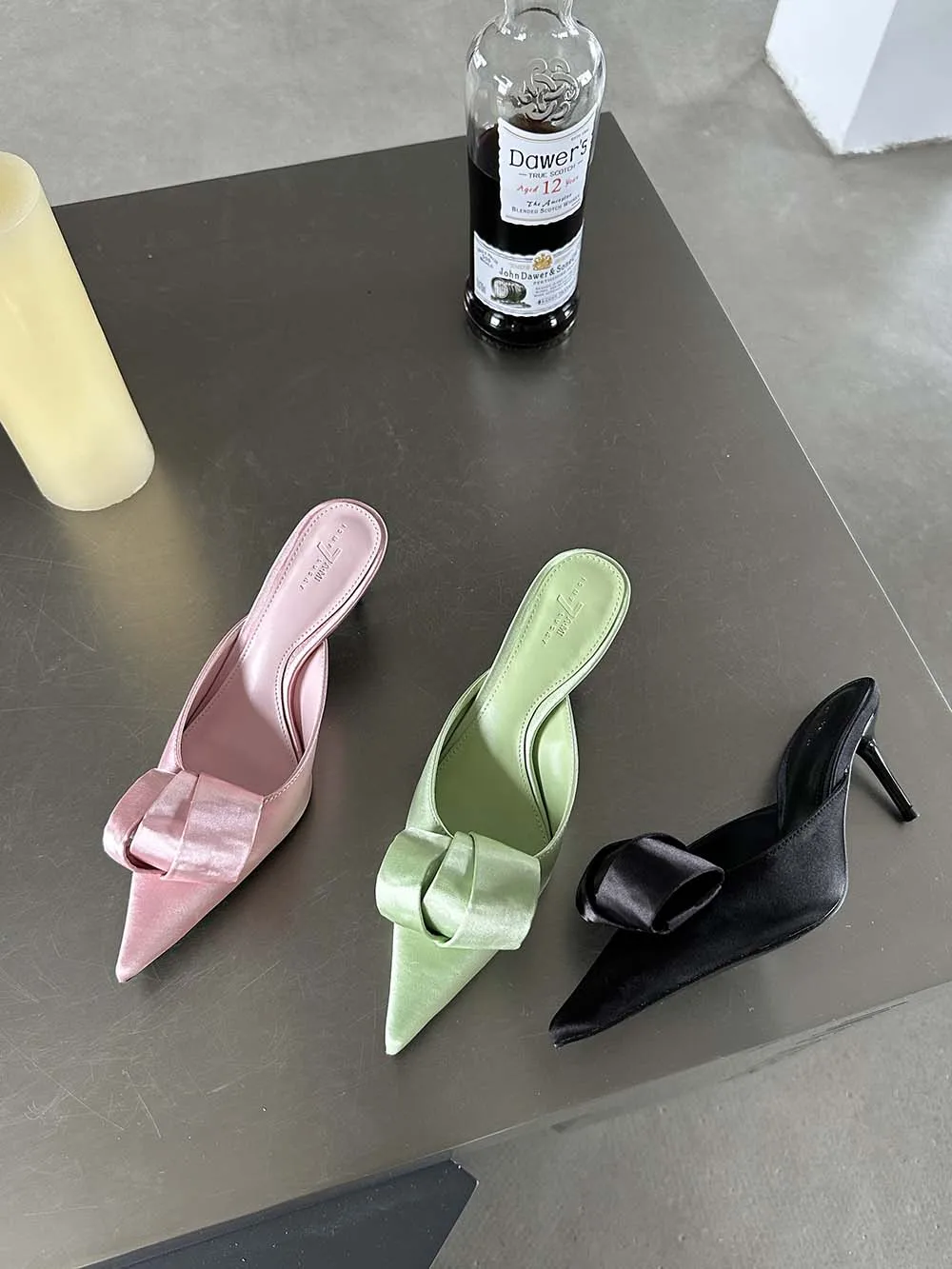 LBSFY - Pointed Toe Women Slides Slippers 2024 New Arrivals Fashion Shallow Slip On Party Pumps Stiletto Heels Bow Design Outside Mules