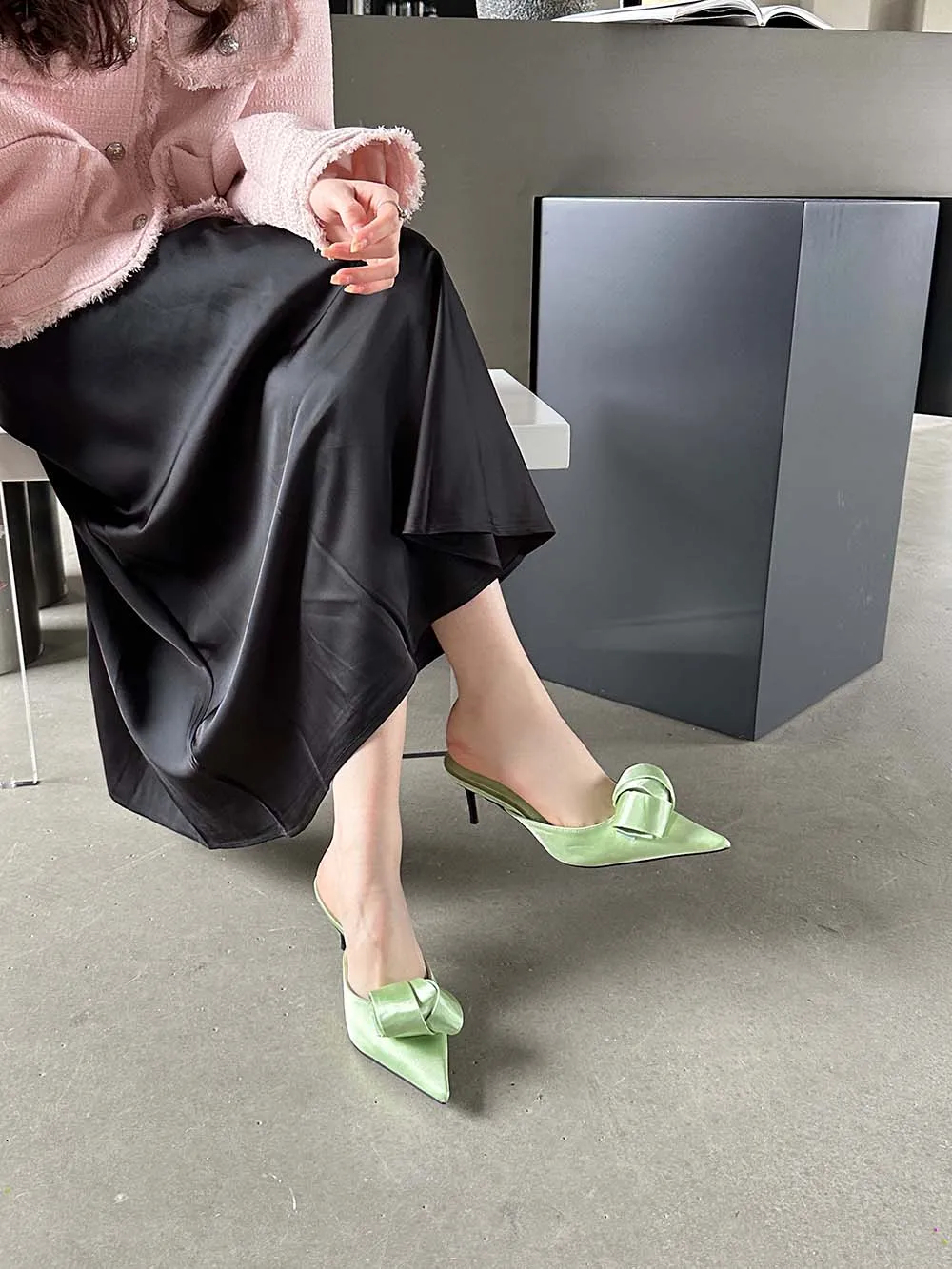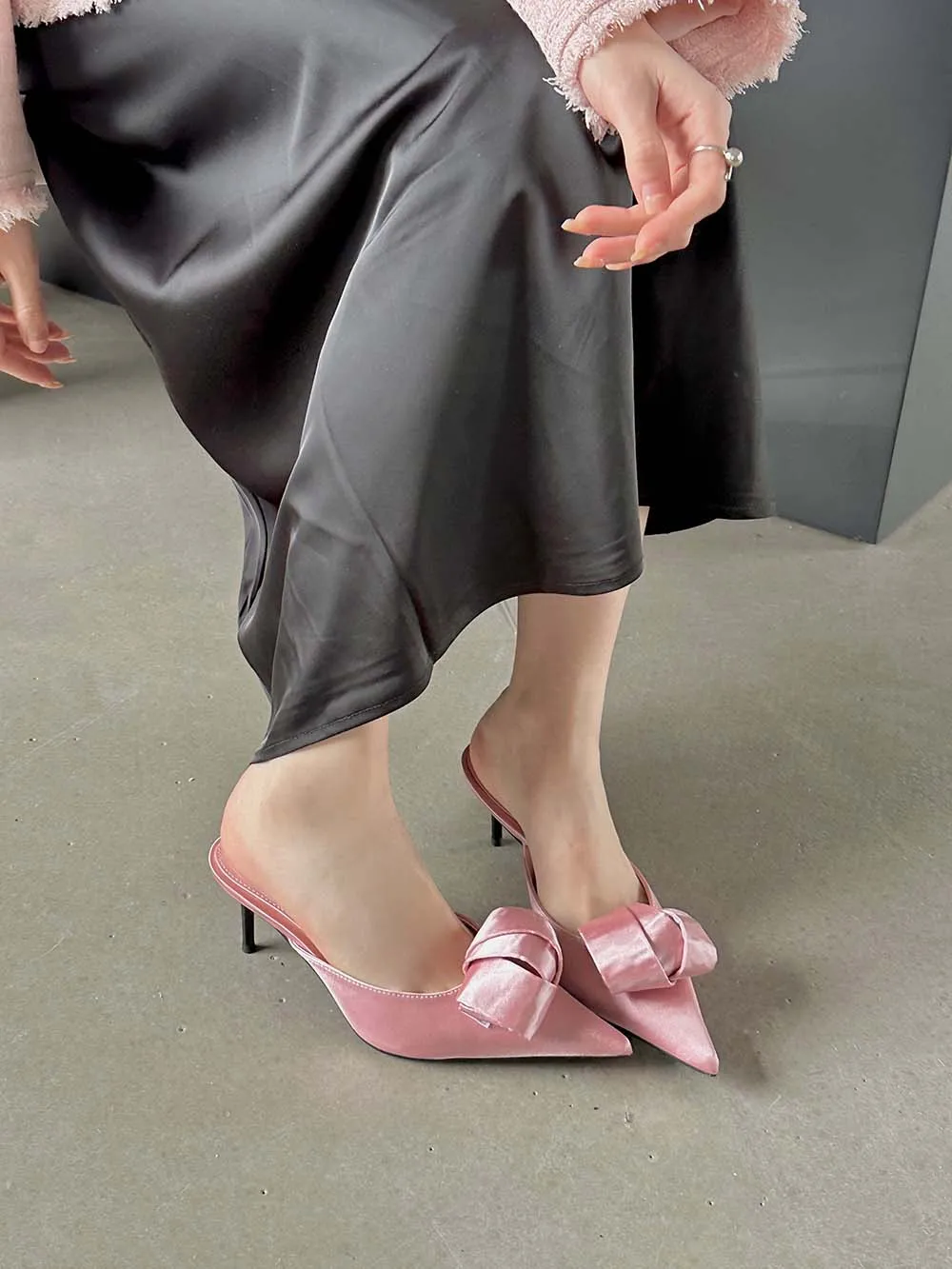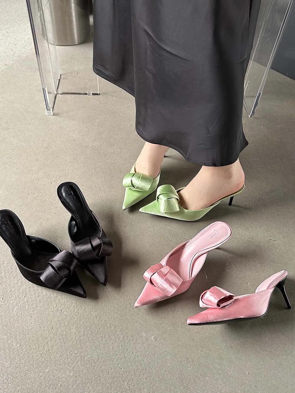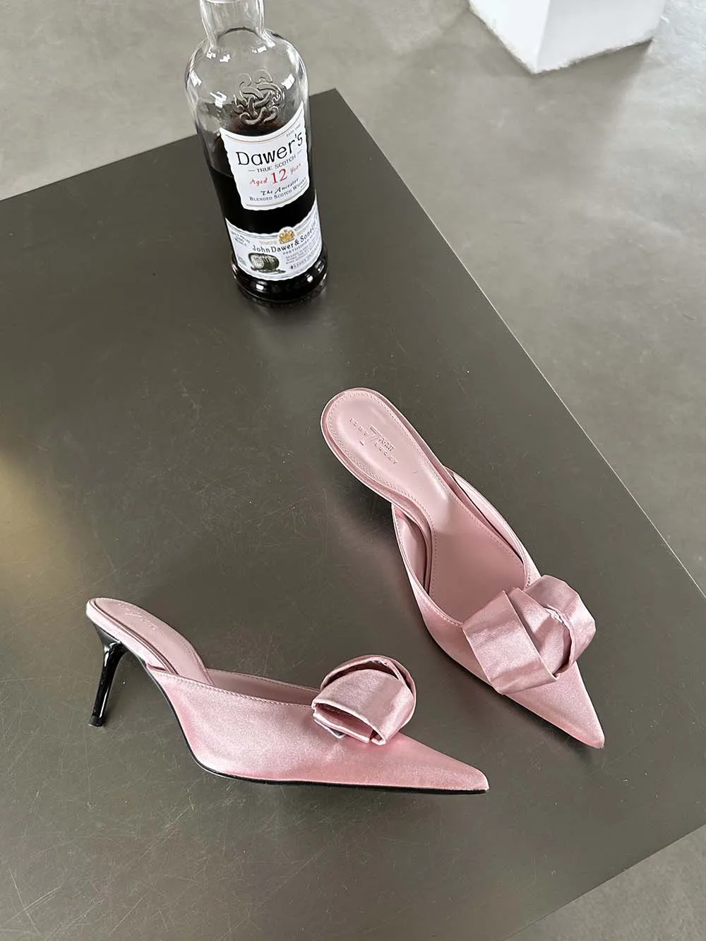 LBSFY - Pointed Toe Women Slides Slippers 2024 New Arrivals Fashion Shallow Slip On Party Pumps Stiletto Heels Bow Design Outside Mules