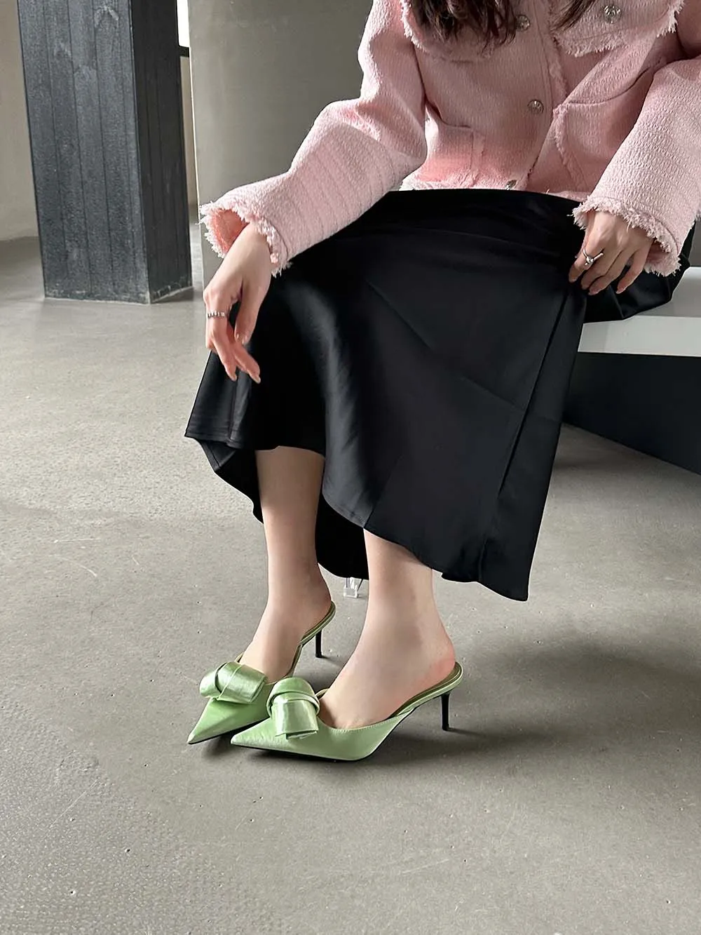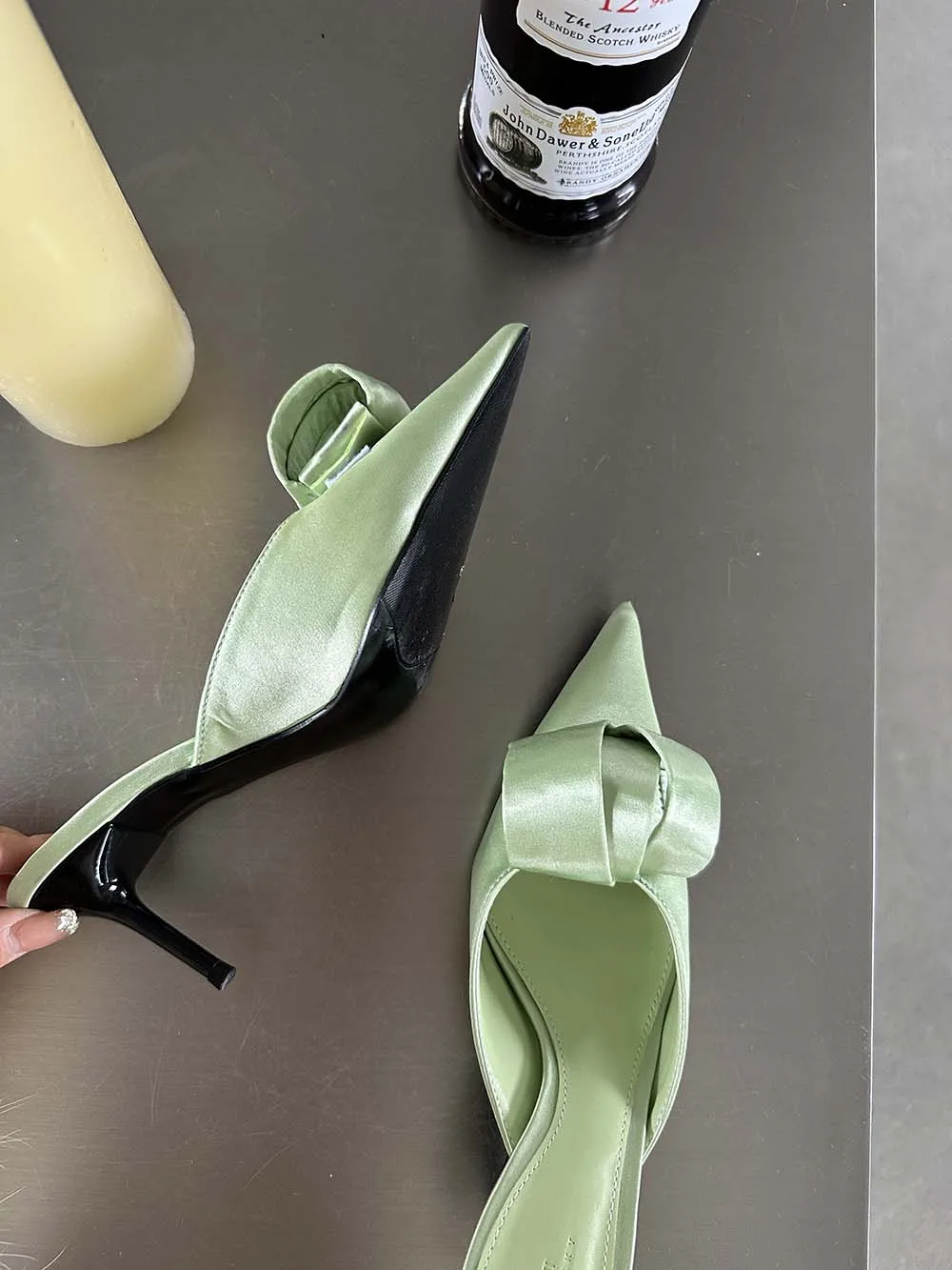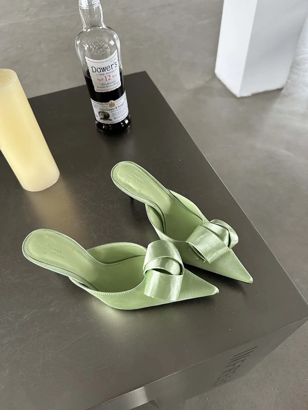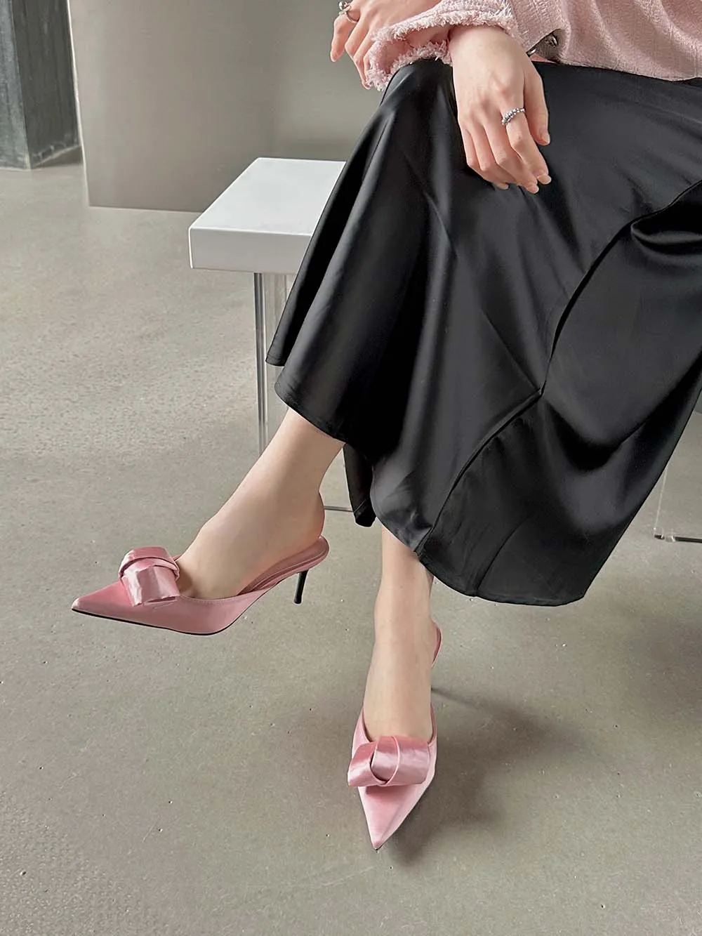 LBSFY - Pointed Toe Women Slides Slippers 2024 New Arrivals Fashion Shallow Slip On Party Pumps Stiletto Heels Bow Design Outside Mules