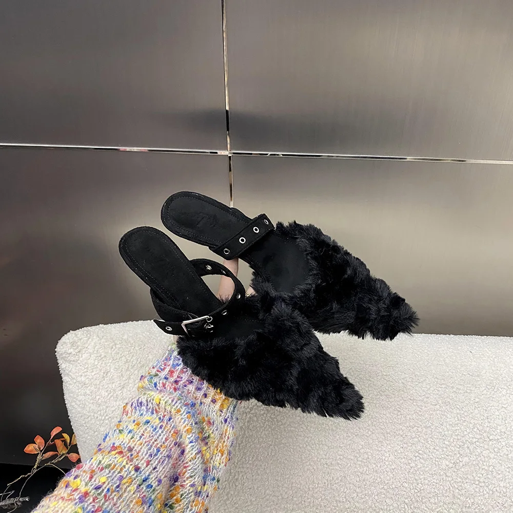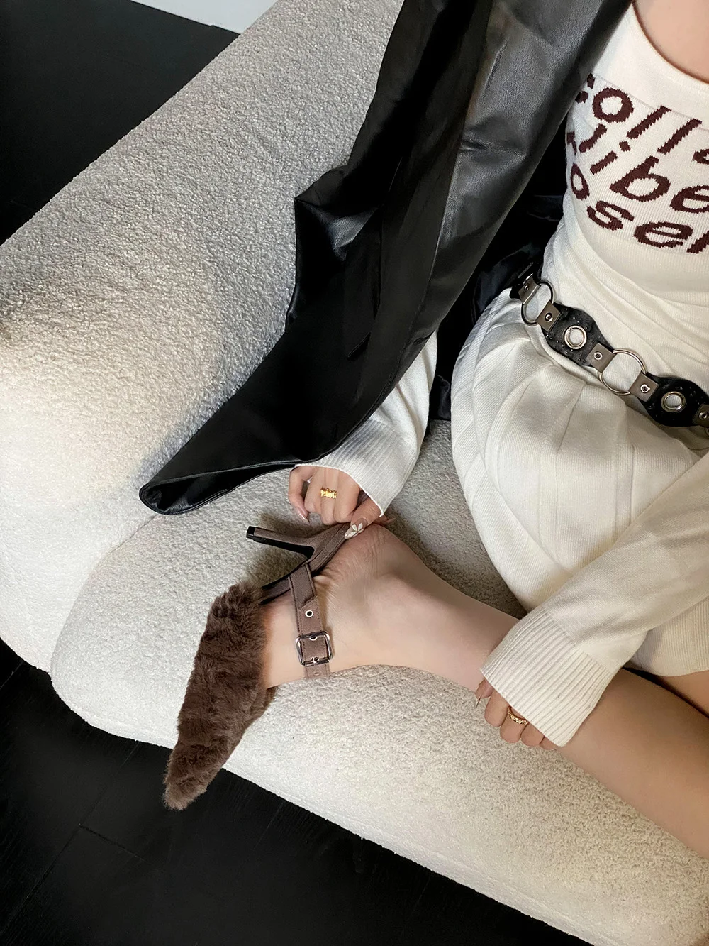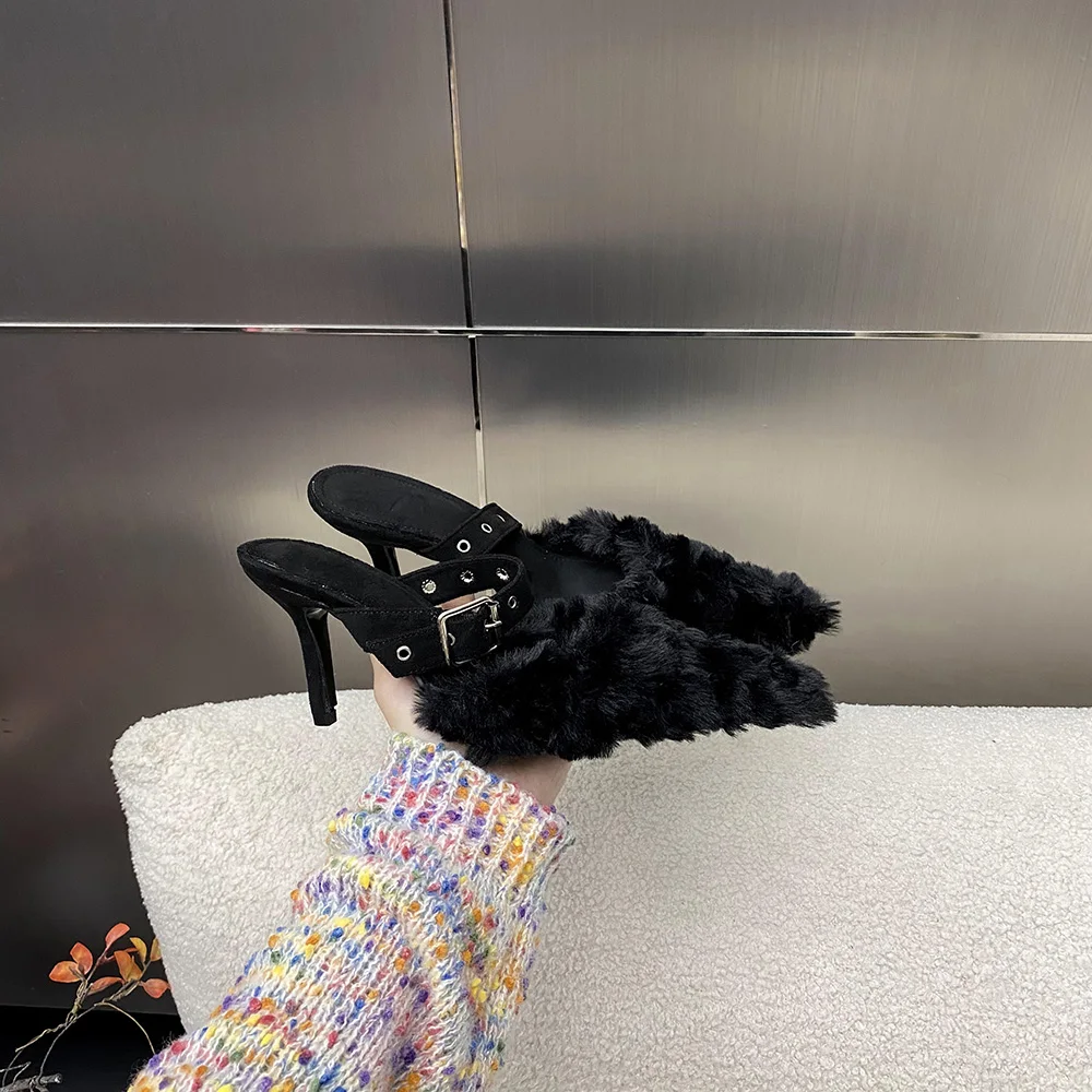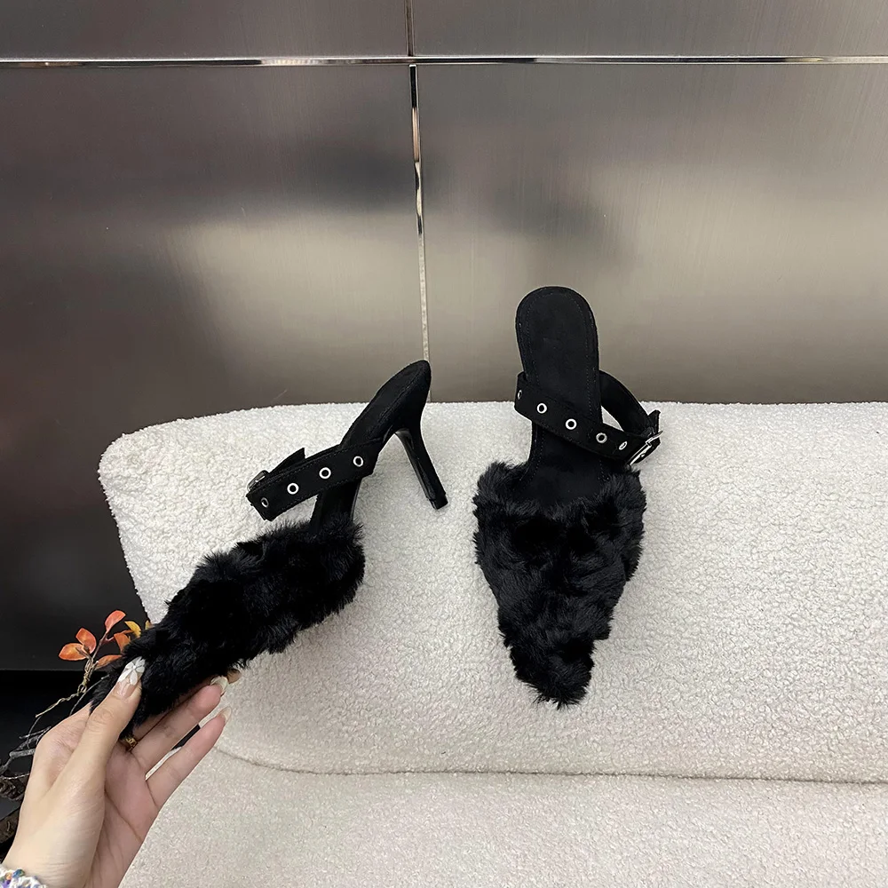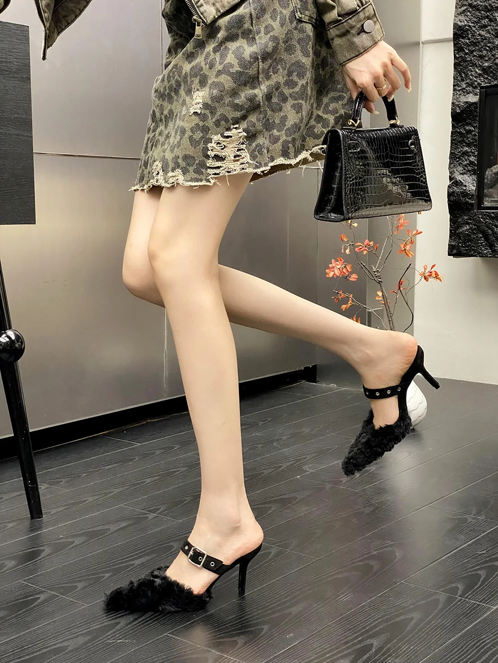 LBSFY - Pointed Toe Women Slides Slippers Black Brown Beige Narrow Belt Buckle Summer Outside Mule Shoes Thin High Heels Party Pumps 40