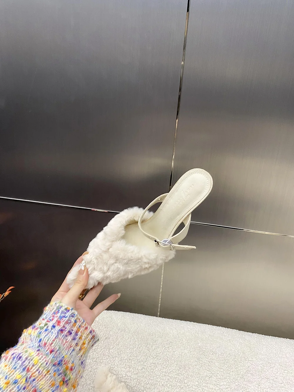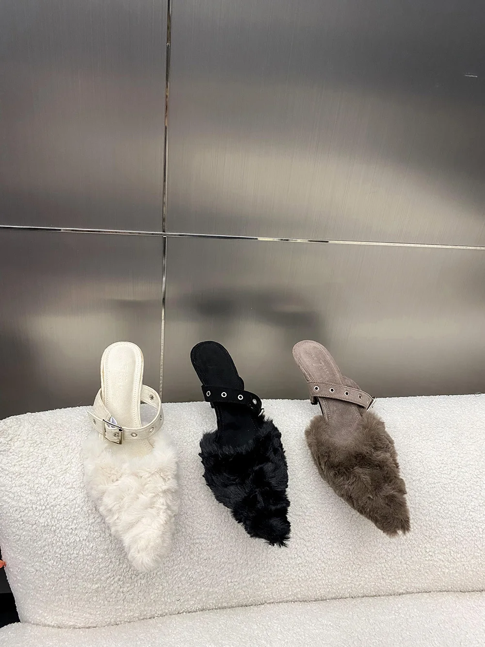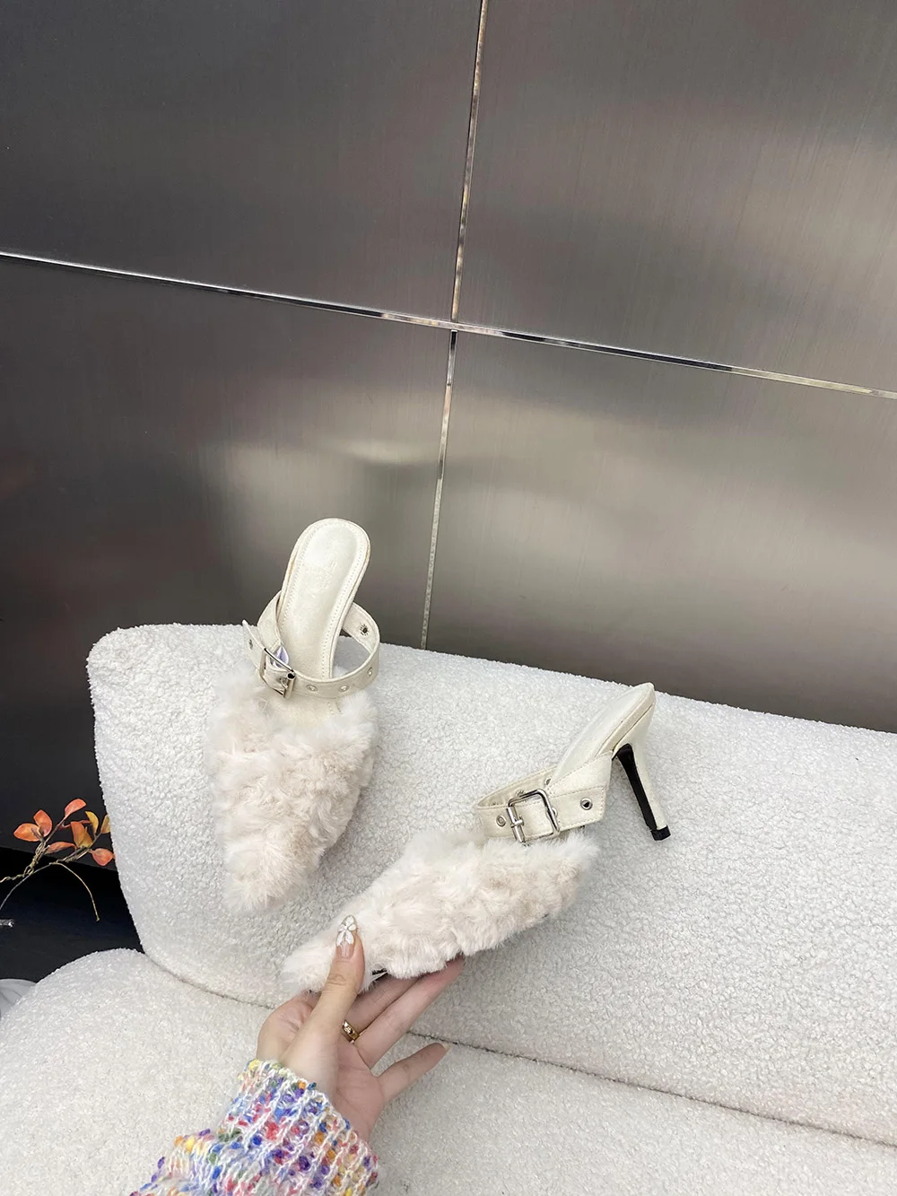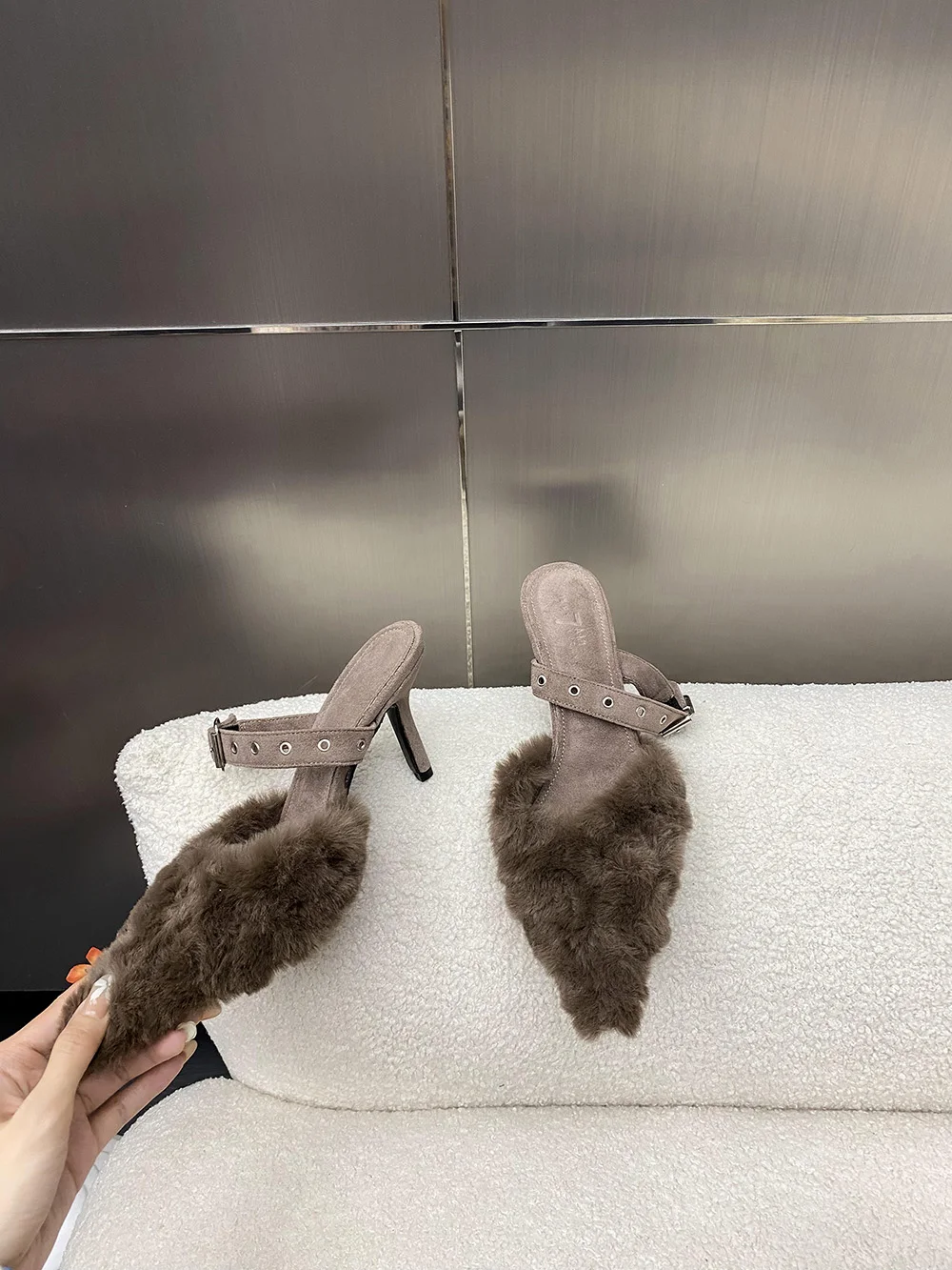 LBSFY - Pointed Toe Women Slides Slippers Black Brown Beige Narrow Belt Buckle Summer Outside Mule Shoes Thin High Heels Party Pumps 40