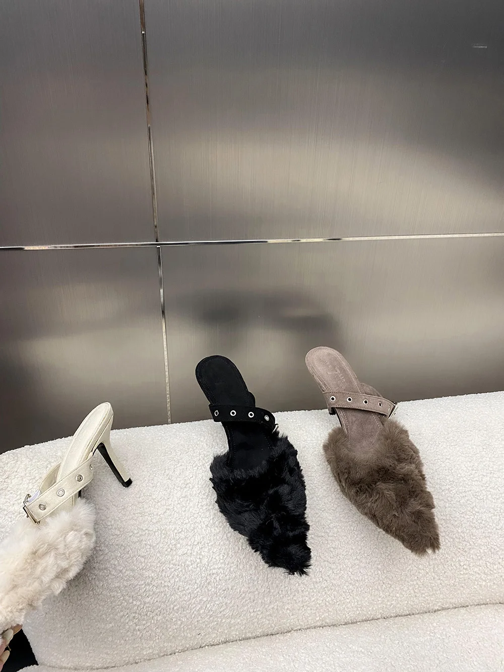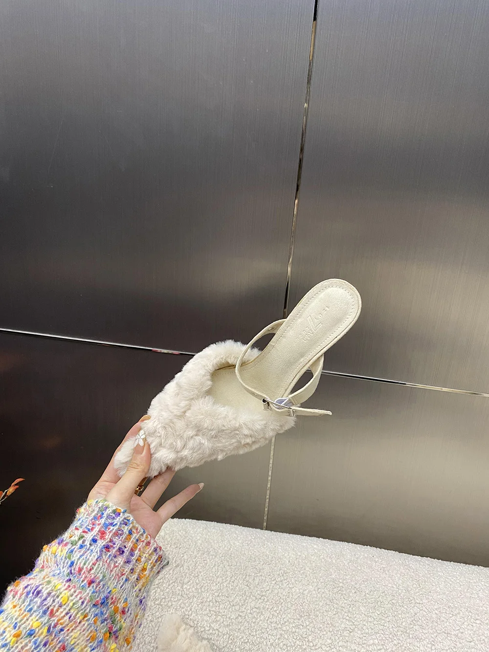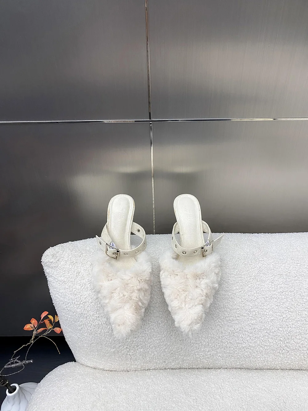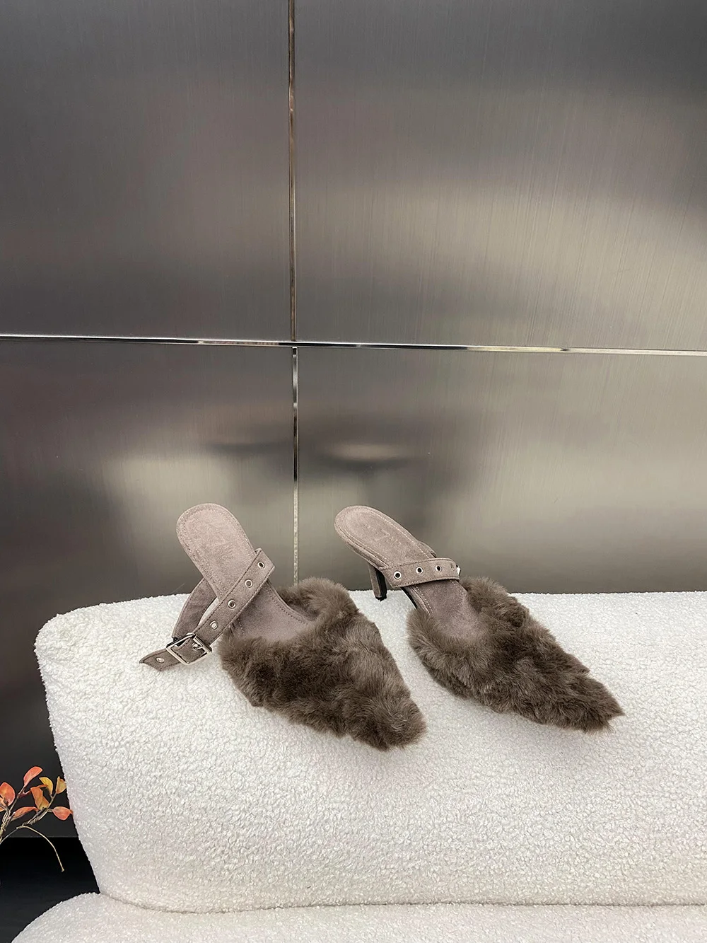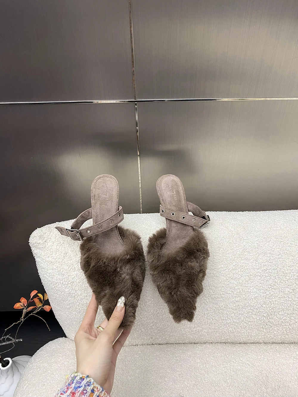 LBSFY - Pointed Toe Women Slides Slippers Black Brown Beige Narrow Belt Buckle Summer Outside Mule Shoes Thin High Heels Party Pumps 40