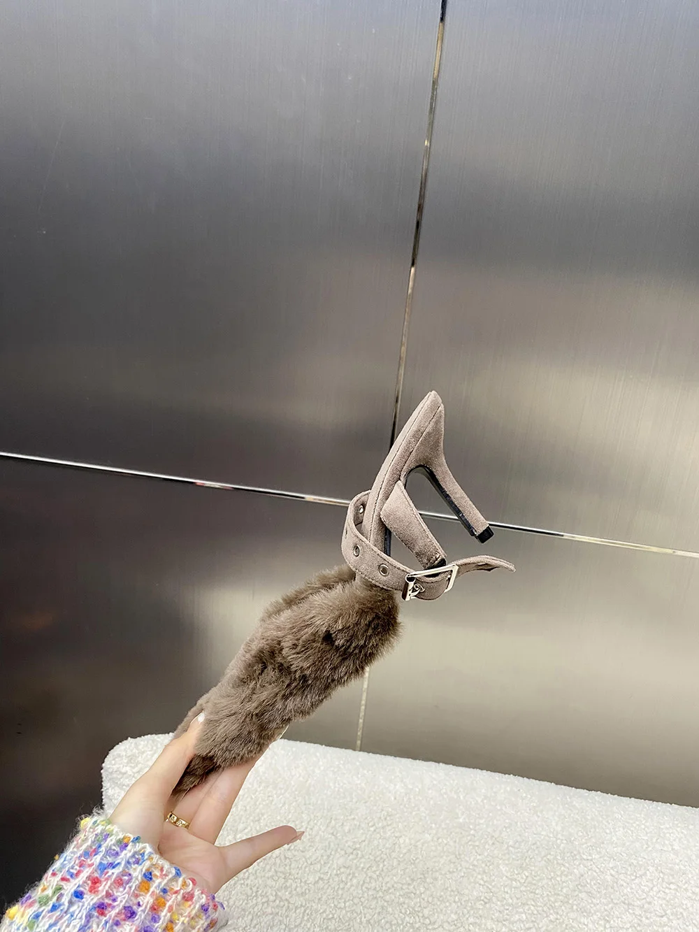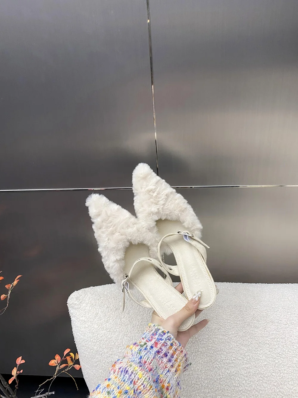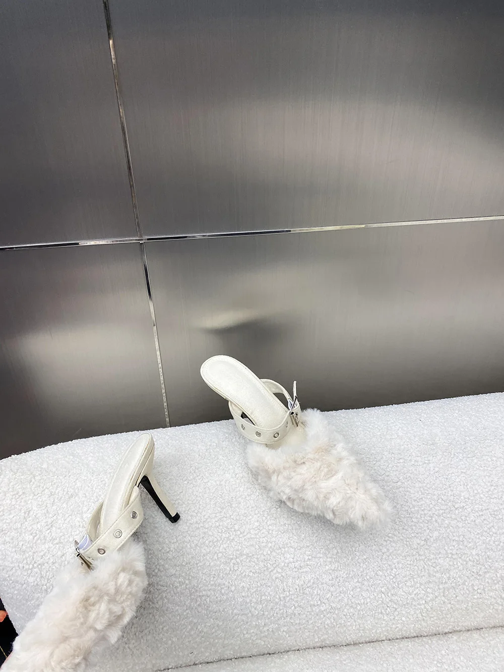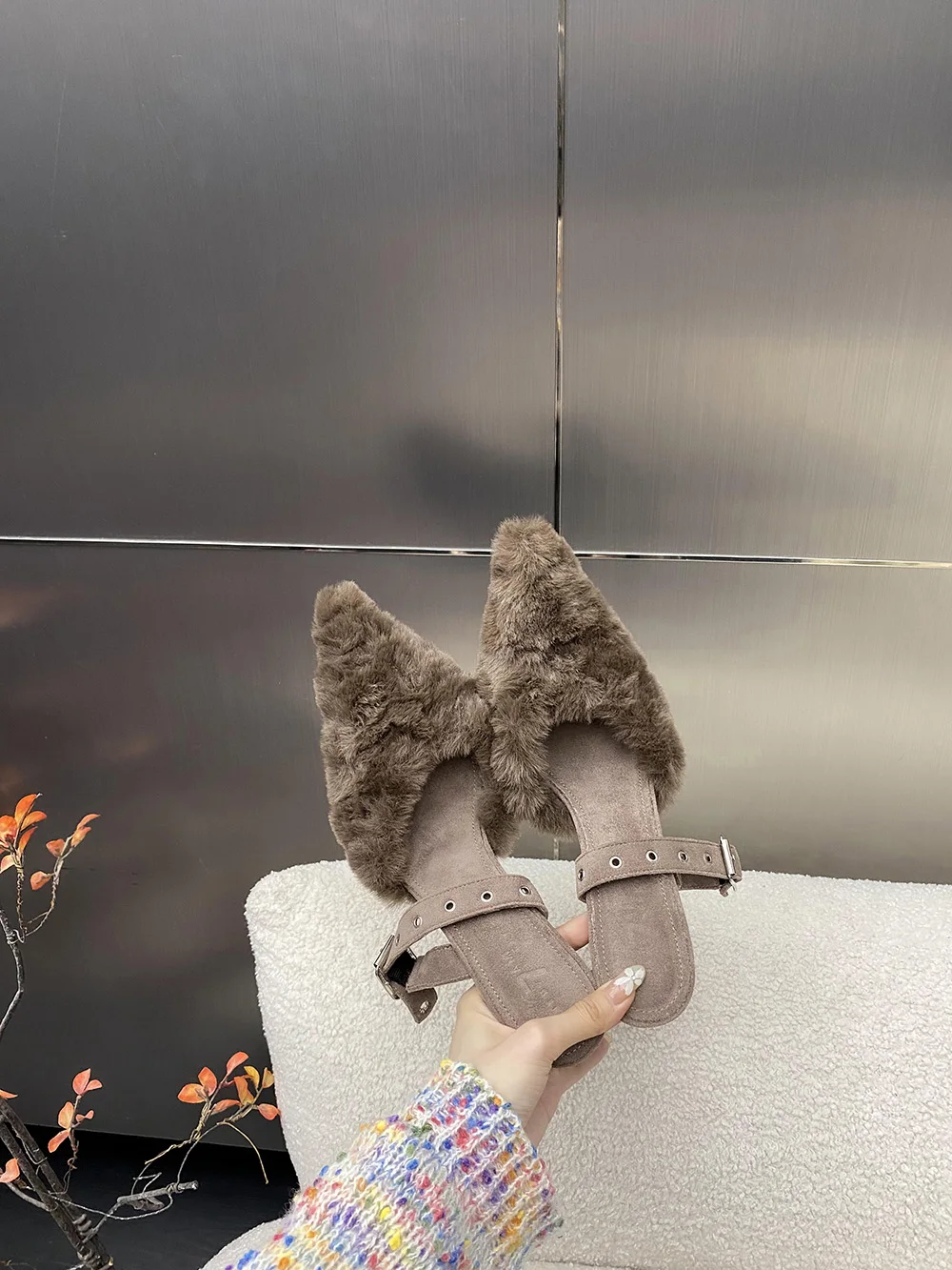 LBSFY - Pointed Toe Women Slides Slippers Black Brown Beige Narrow Belt Buckle Summer Outside Mule Shoes Thin High Heels Party Pumps 40