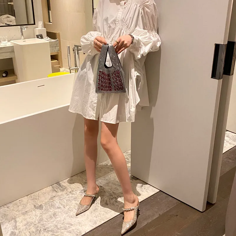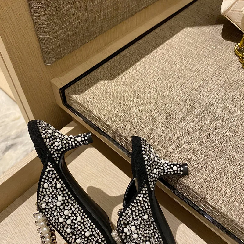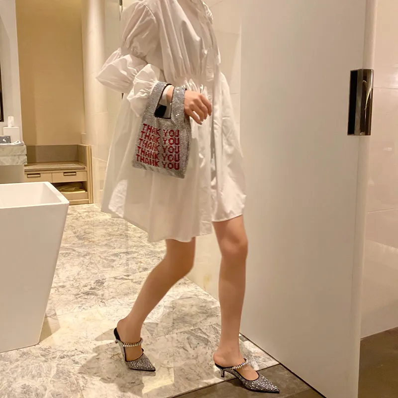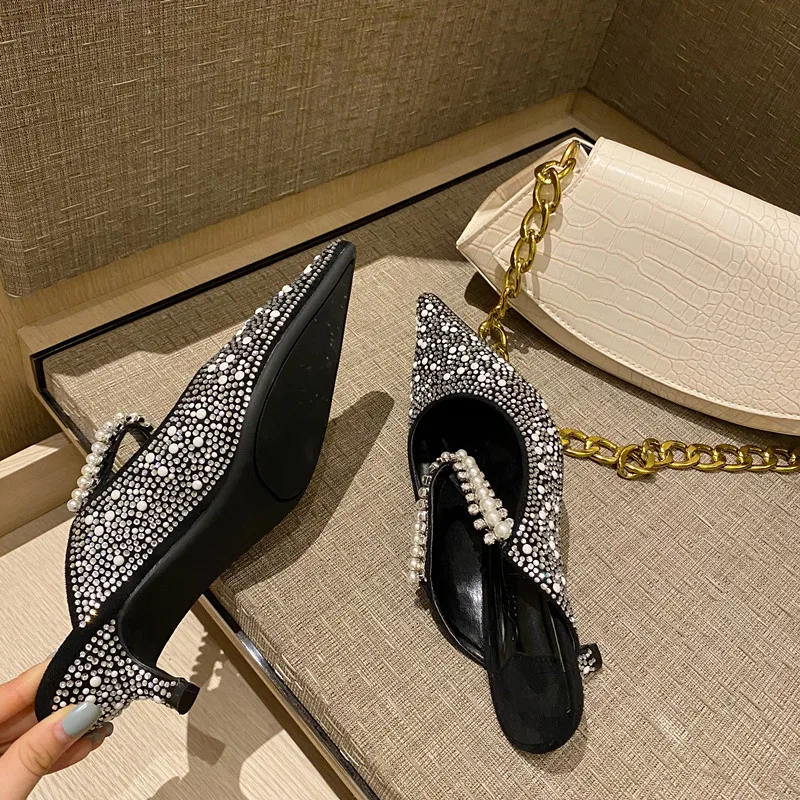 LBSFY - Pointed Toe Women Slippers Rhinestone Design Black Thin Bling Full Crystal Thin Low Heels Hollow Design Summer Sandals Slides 40