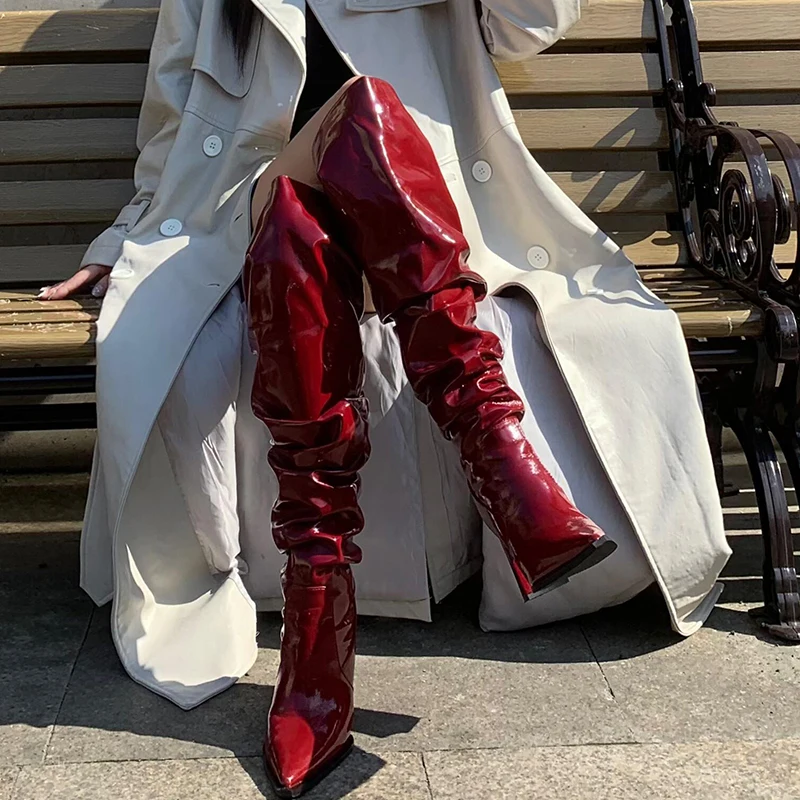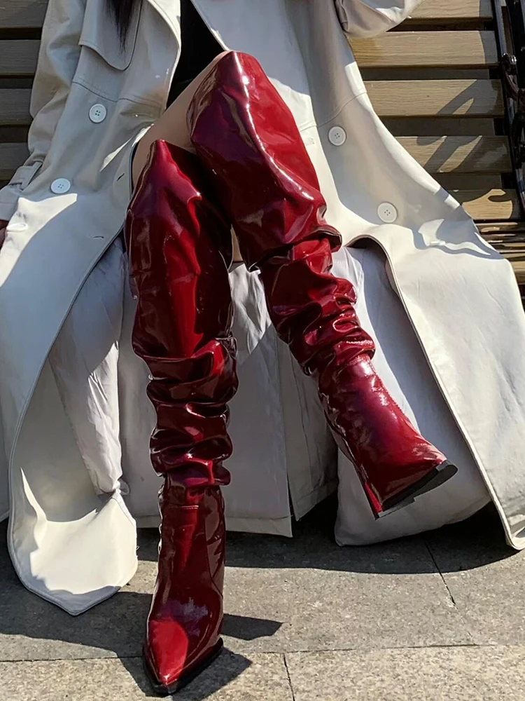 LBSFY - Red Patent Leather Wrinkles Boots Block High Heels Loose Sexy Ladies Dress Party Daily Casual Over The Knee Boots Classic