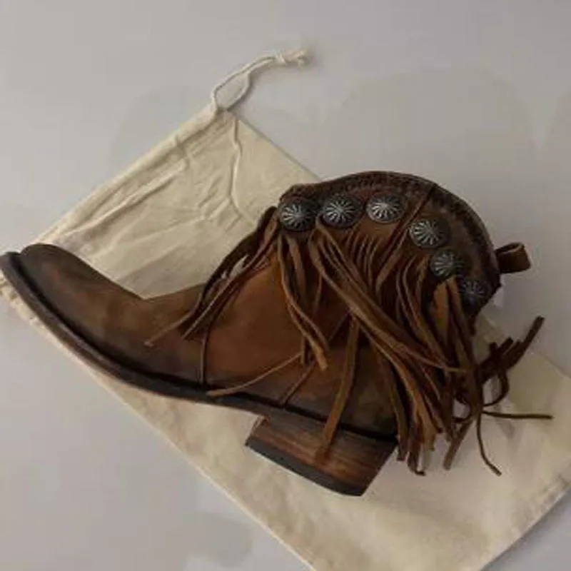 LBSFY - Retro Girls Ethnic Style Metal Tassel Round Toe Low Heels Slip On Short Boots Female Holidays Ankle Boots Shoes Drop Shipping
