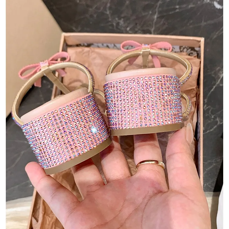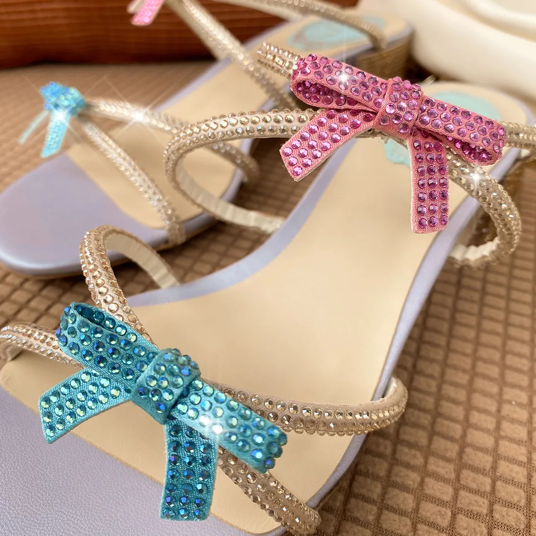 LBSFY - Rhinestone Bow Luxury Sandals Women Designers Flip Flops Female Open Toe Chunky Heel Slides Lady Shiny Fashion Slippers Women