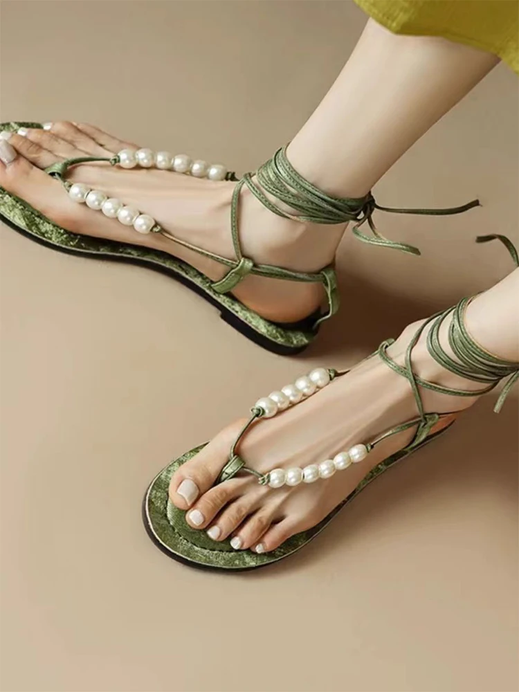 LBSFY - Rome Clip Toe Sandals Women Beaded Flats Shoes 2024 Fashion New Summer Slippers Designer Trend Casual Dress Female Flip Flops