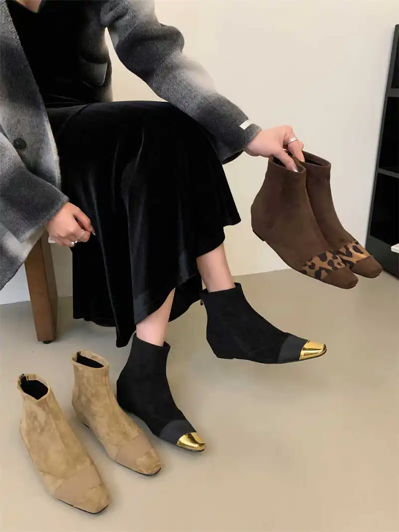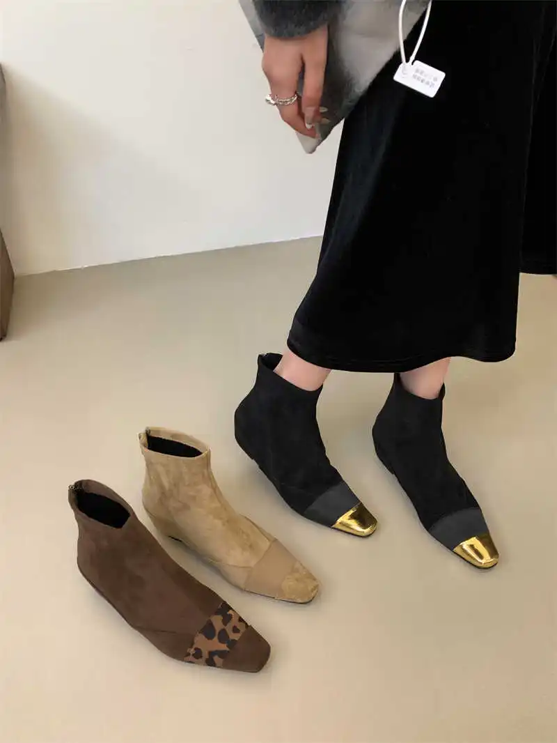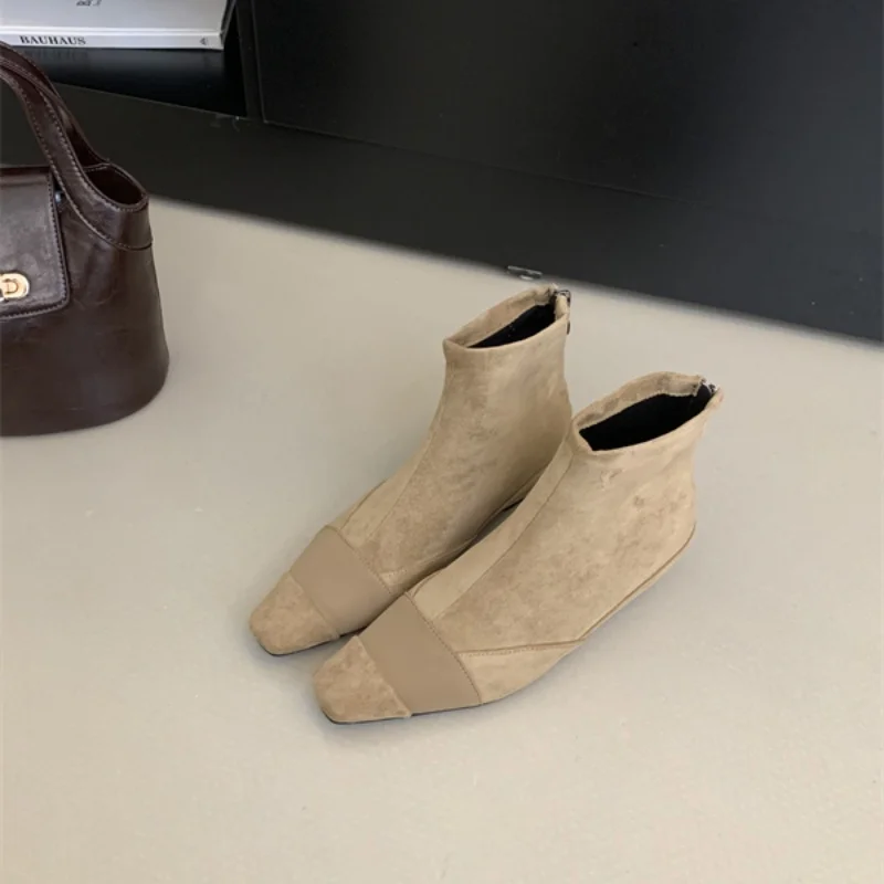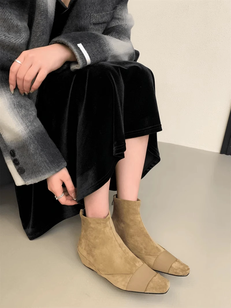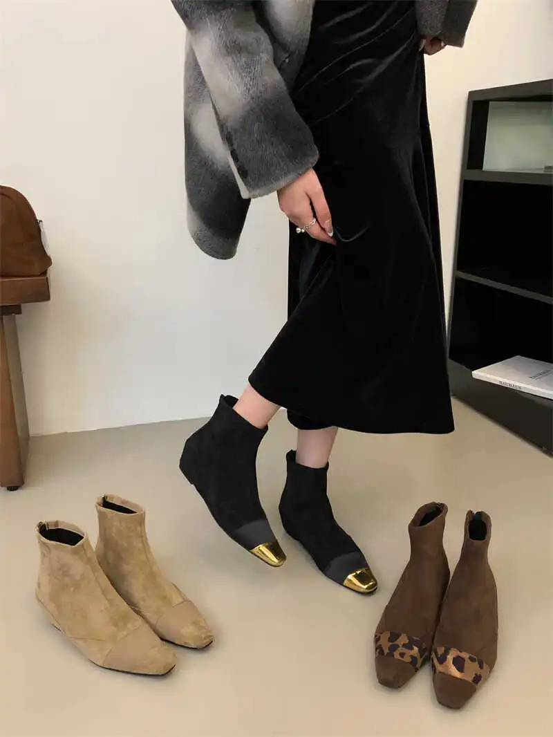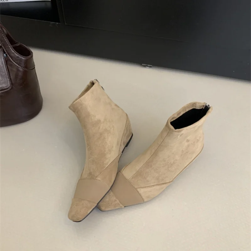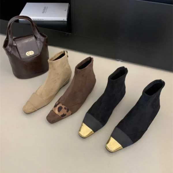 LBSFY - Round Toe Women Ankle Boots Flock Sock Botas Wedge Mid Heels Fashion Short Boots Side Zipper Black Brown Khaki Dress Sh