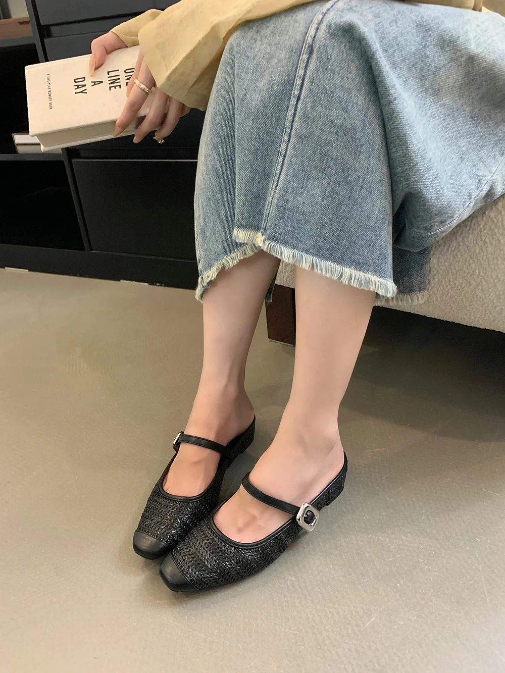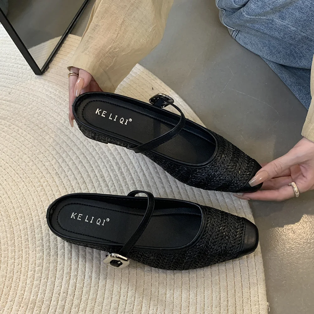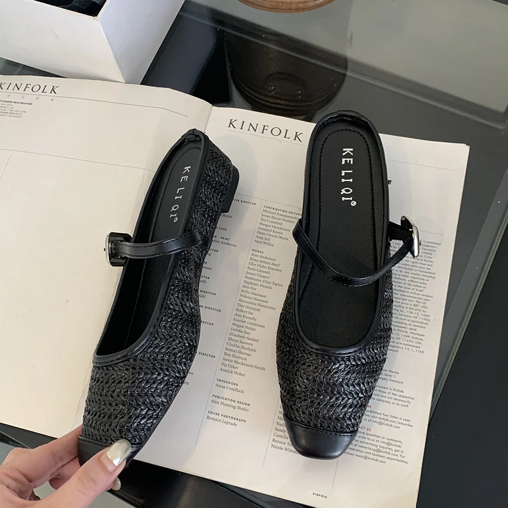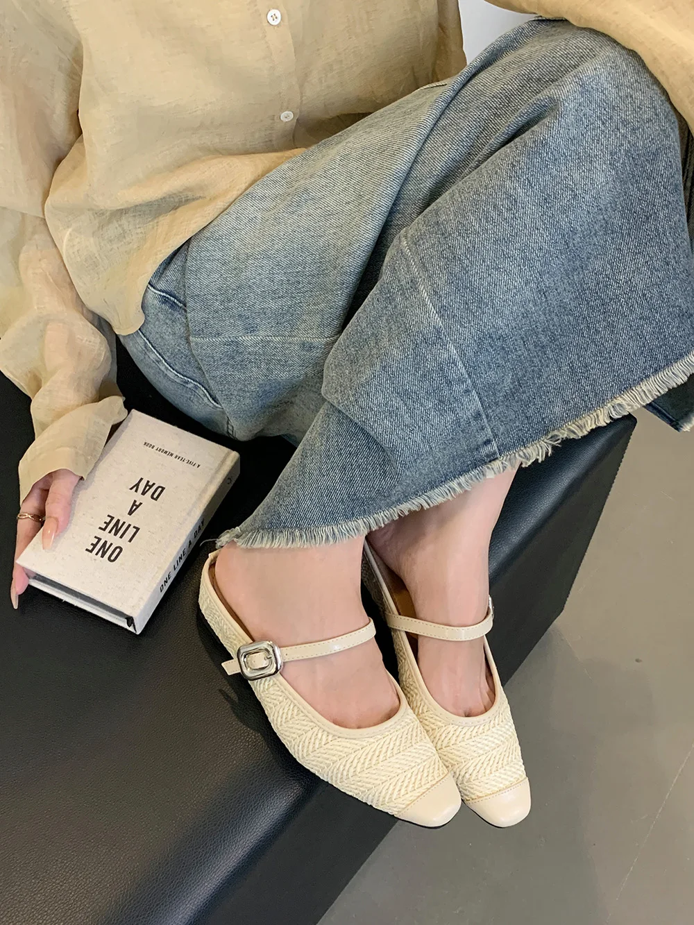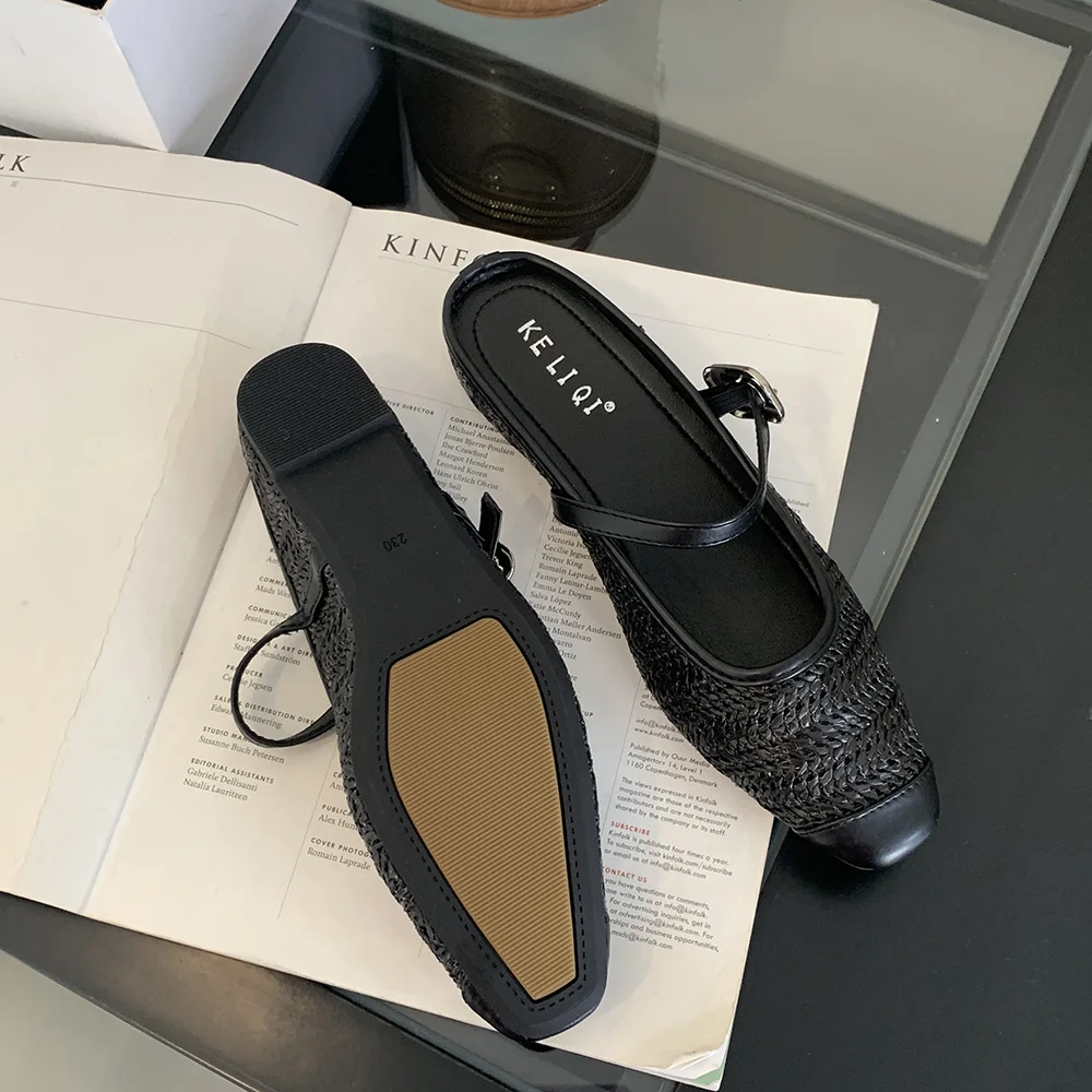 LBSFY - Round Toe Women Flats 2024 New Arrivals Belt Buckle Black Beige Khaki Low Flat Heeled Weave Design Casual Outside Mules Loafers