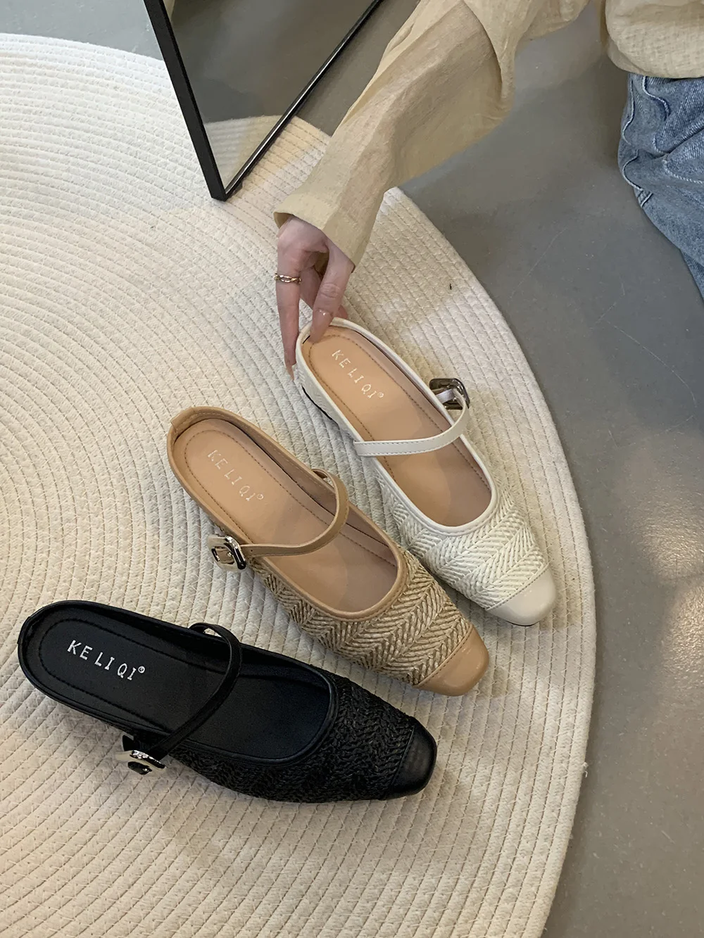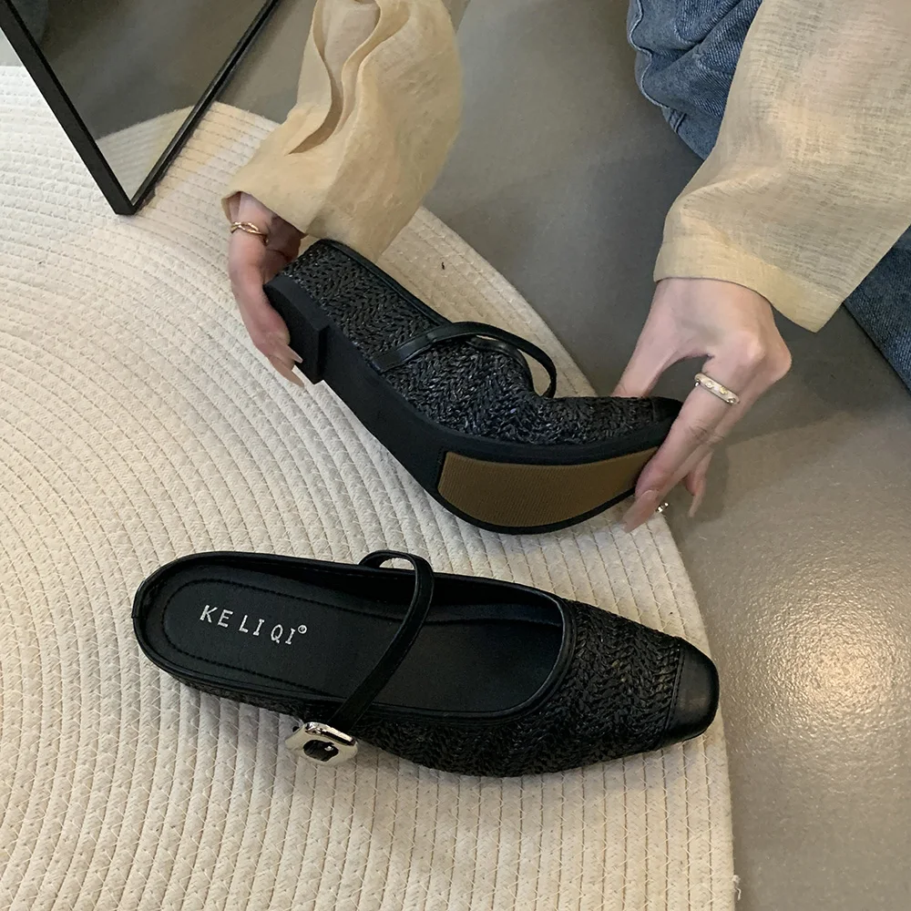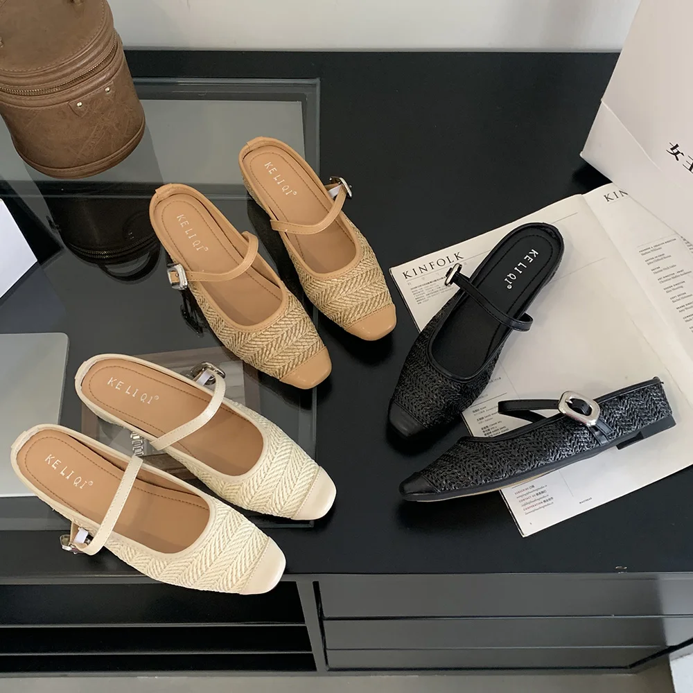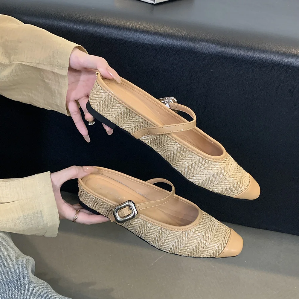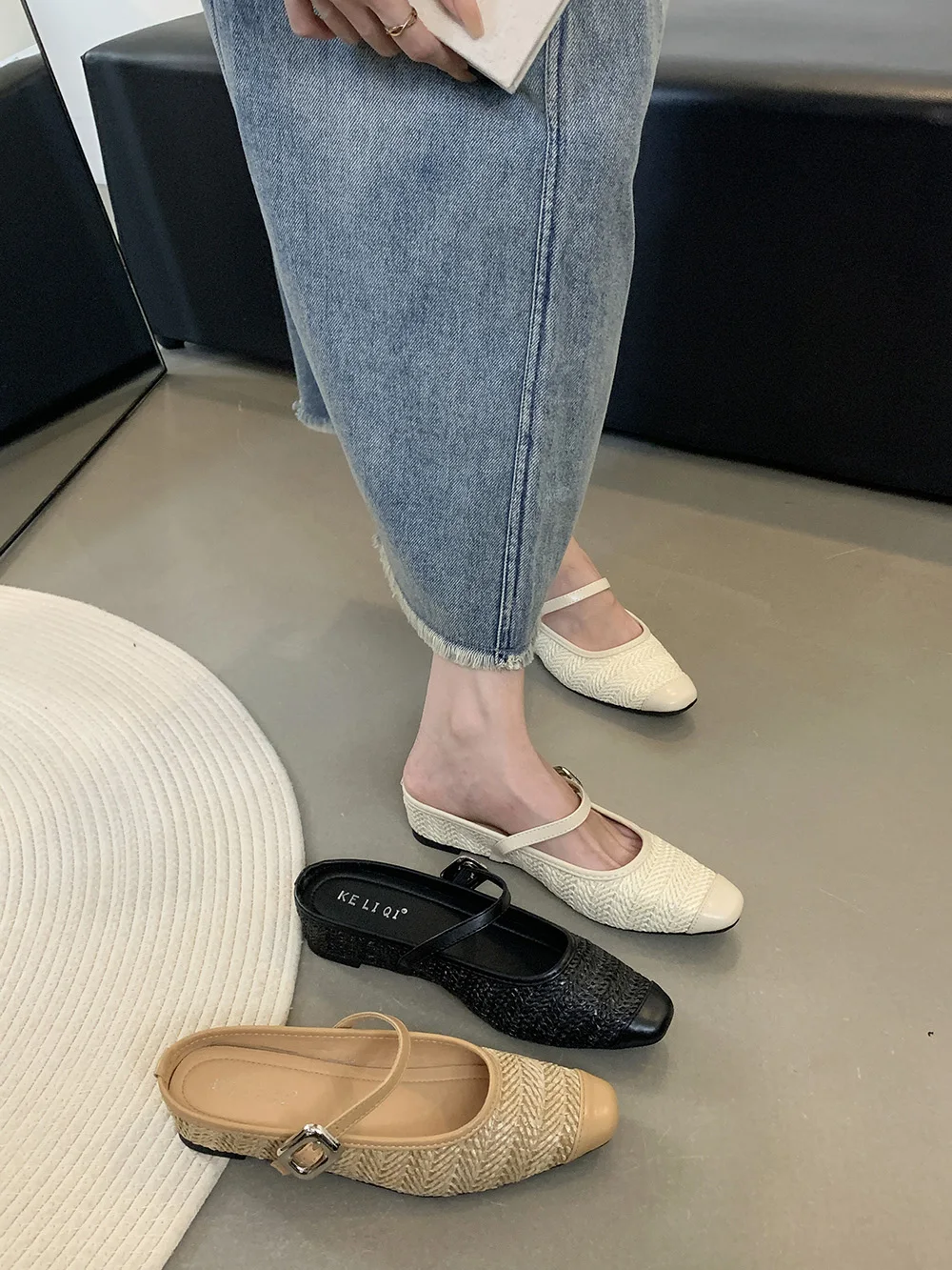 LBSFY - Round Toe Women Flats 2024 New Arrivals Belt Buckle Black Beige Khaki Low Flat Heeled Weave Design Casual Outside Mules Loafers