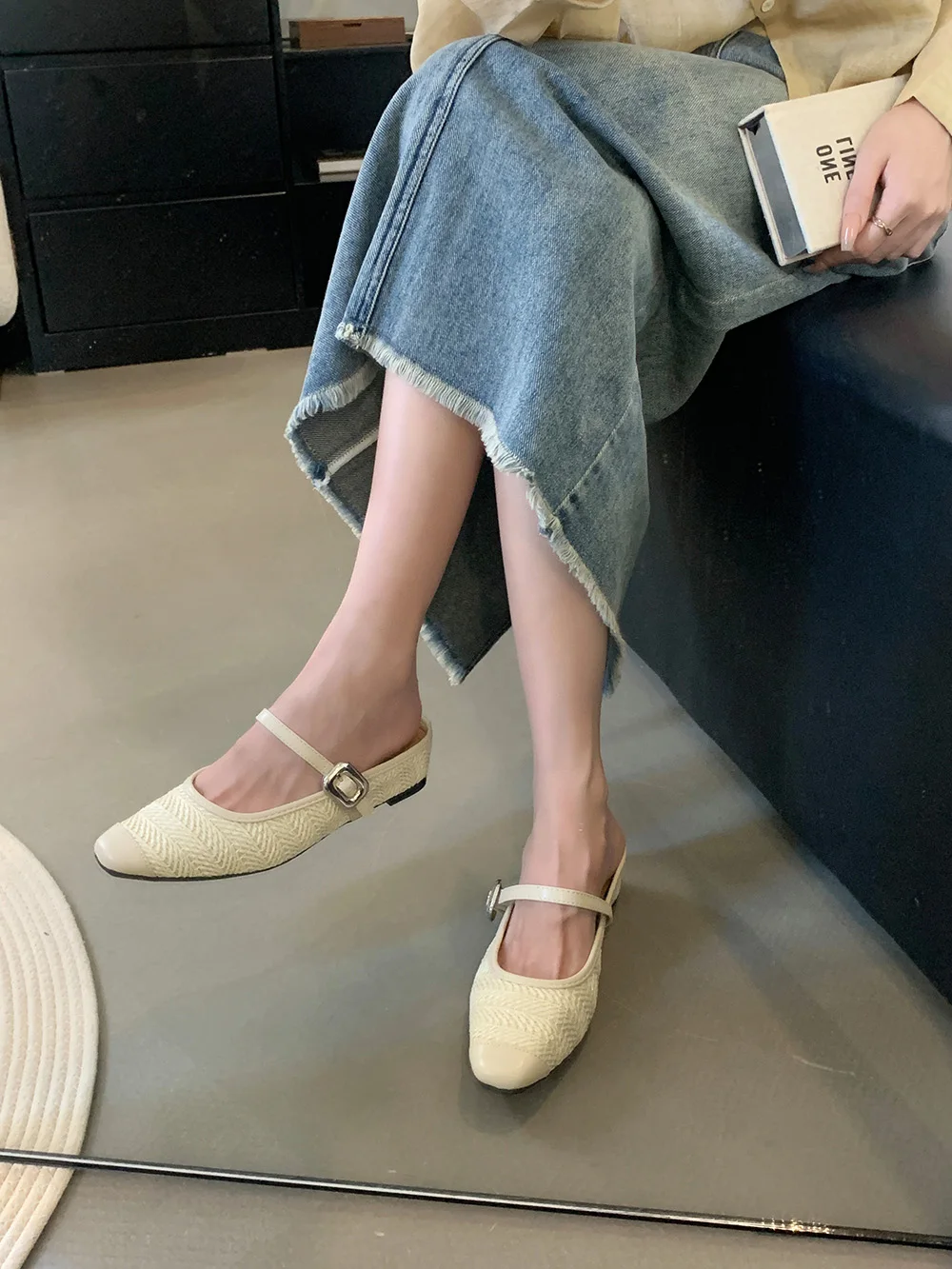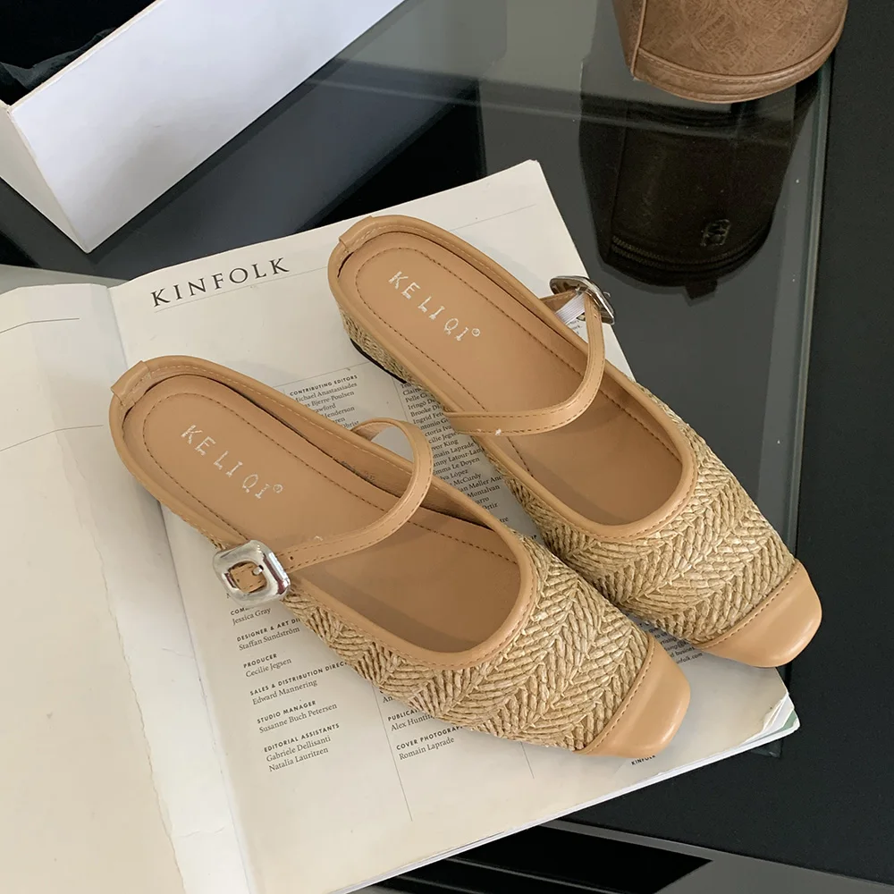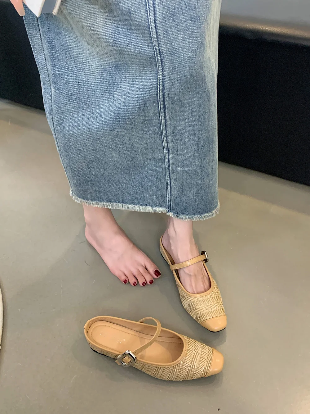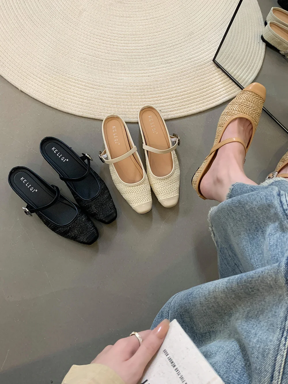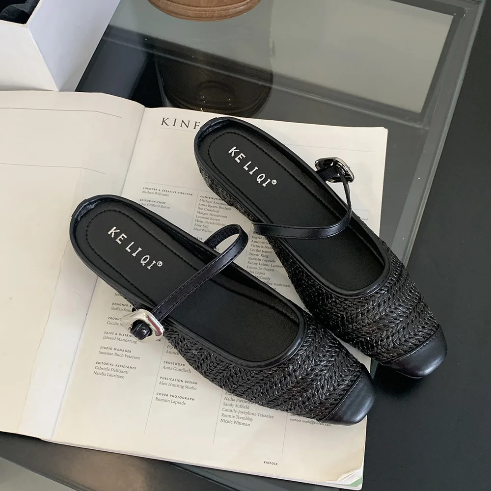 LBSFY - Round Toe Women Flats 2024 New Arrivals Belt Buckle Black Beige Khaki Low Flat Heeled Weave Design Casual Outside Mules Loafers