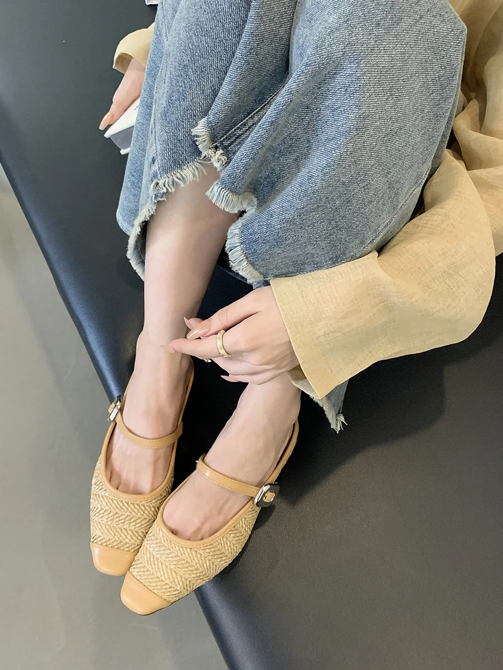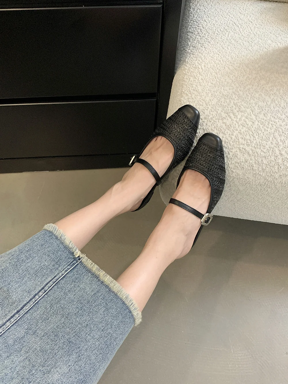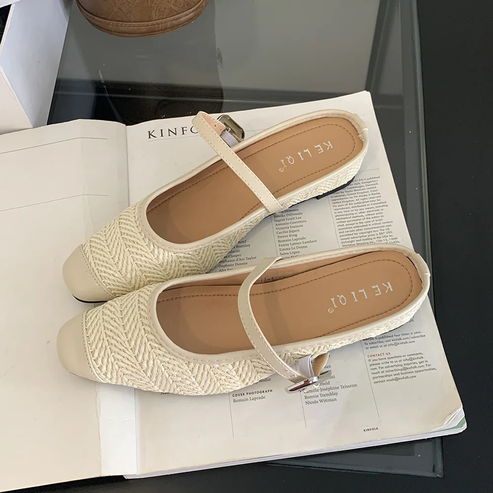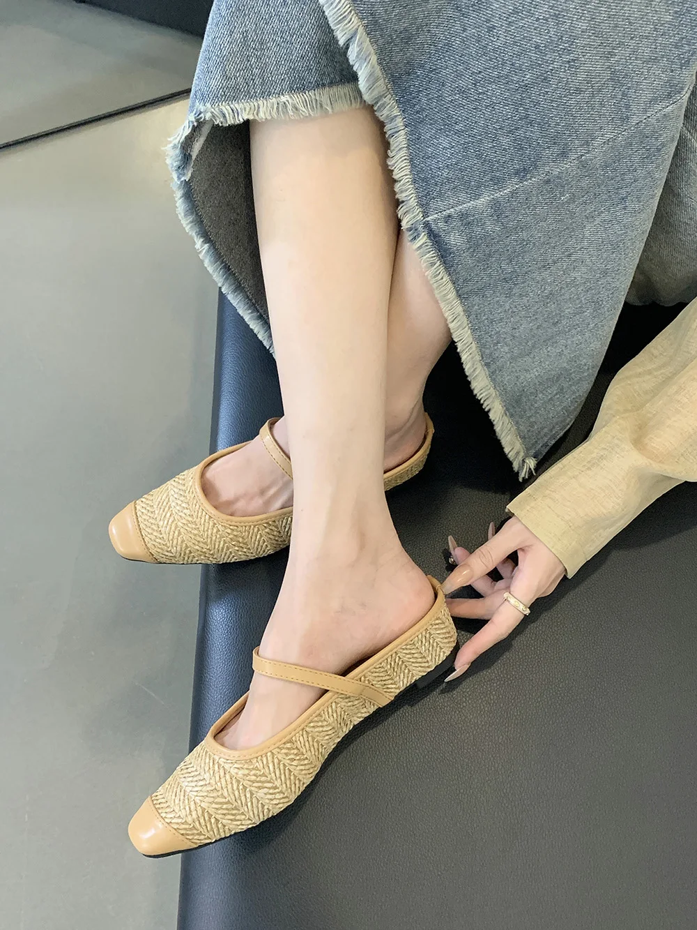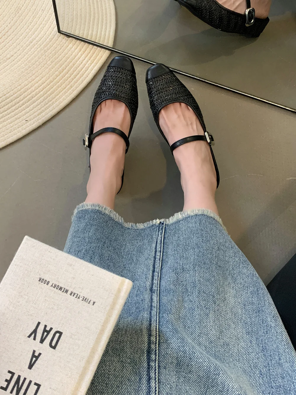LBSFY - Round Toe Women Flats 2024 New Arrivals Belt Buckle Black Beige Khaki Low Flat Heeled Weave Design Casual Outside Mules Loafers