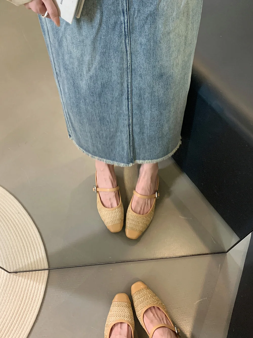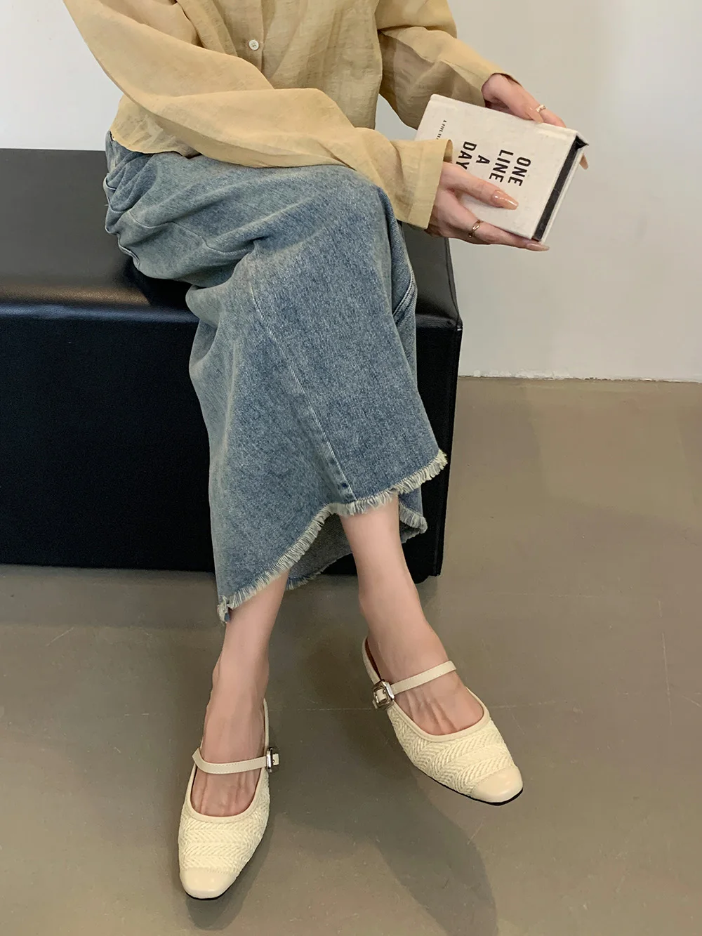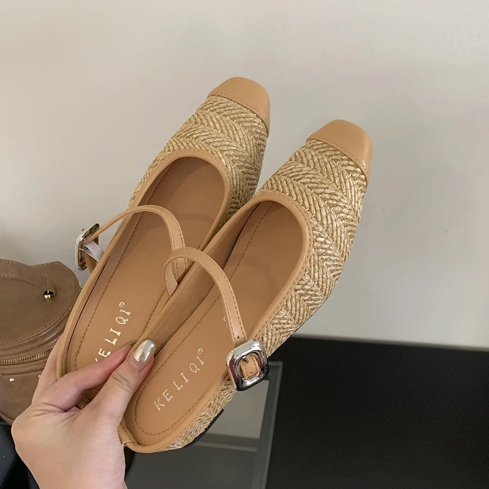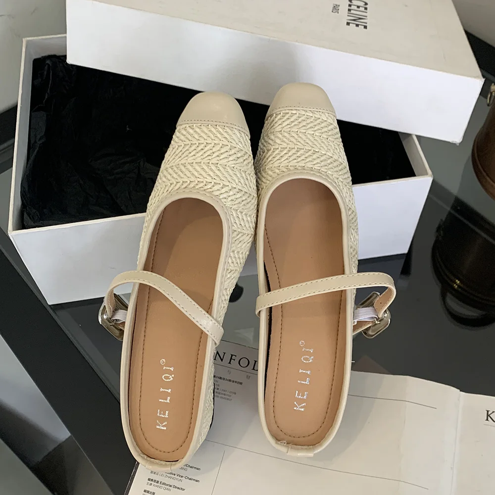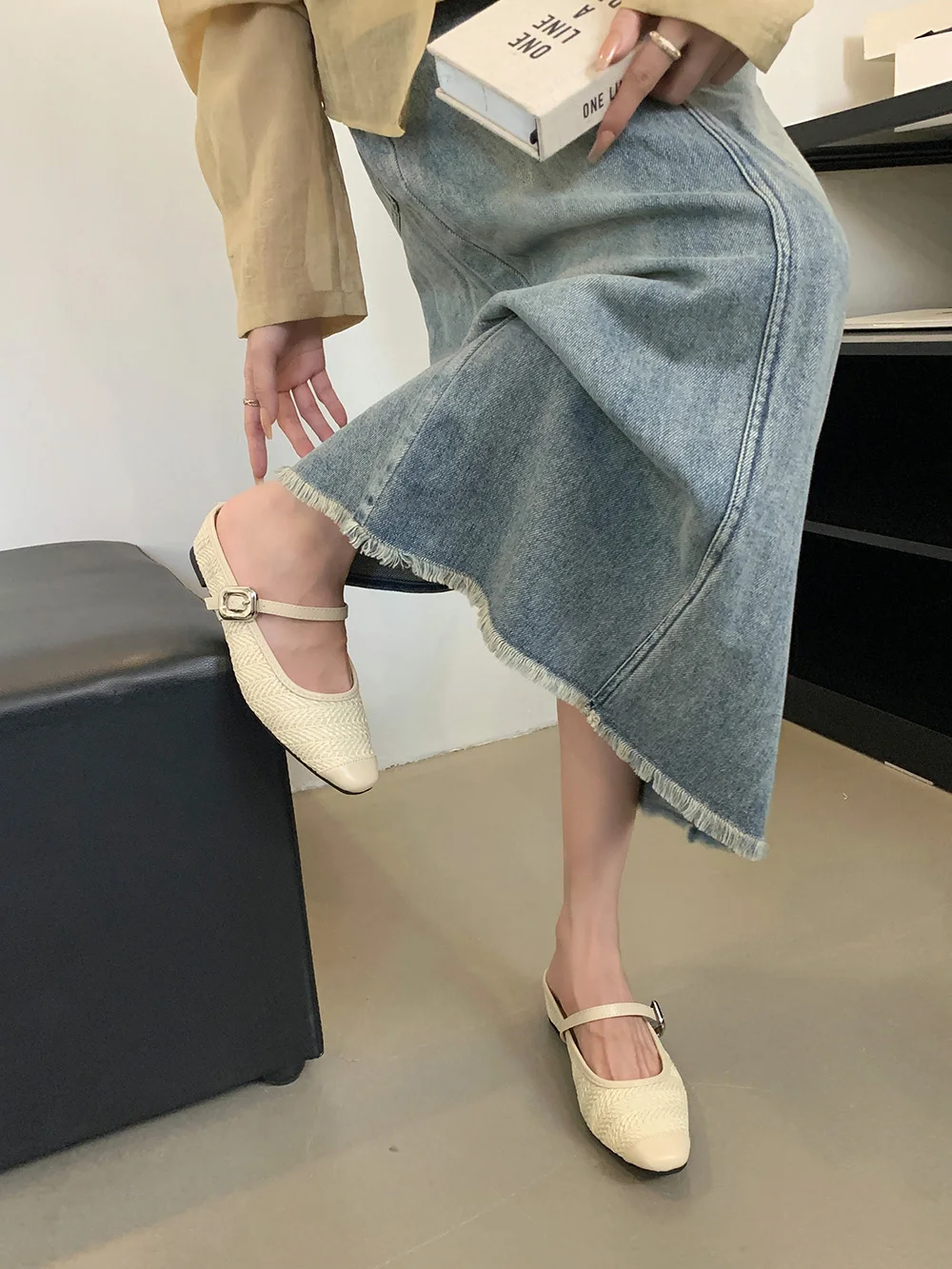 LBSFY - Round Toe Women Flats 2024 New Arrivals Belt Buckle Black Beige Khaki Low Flat Heeled Weave Design Casual Outside Mules Loafers