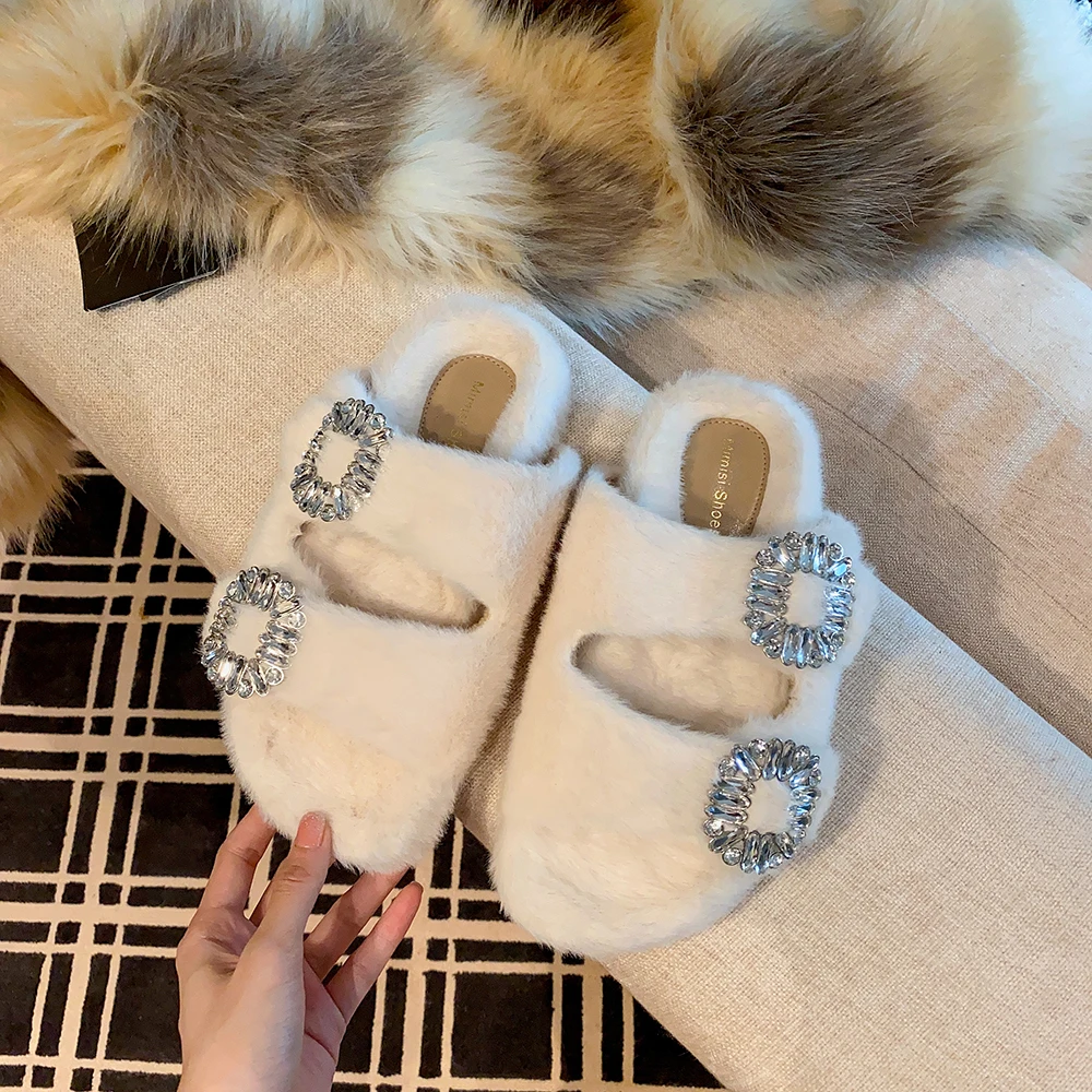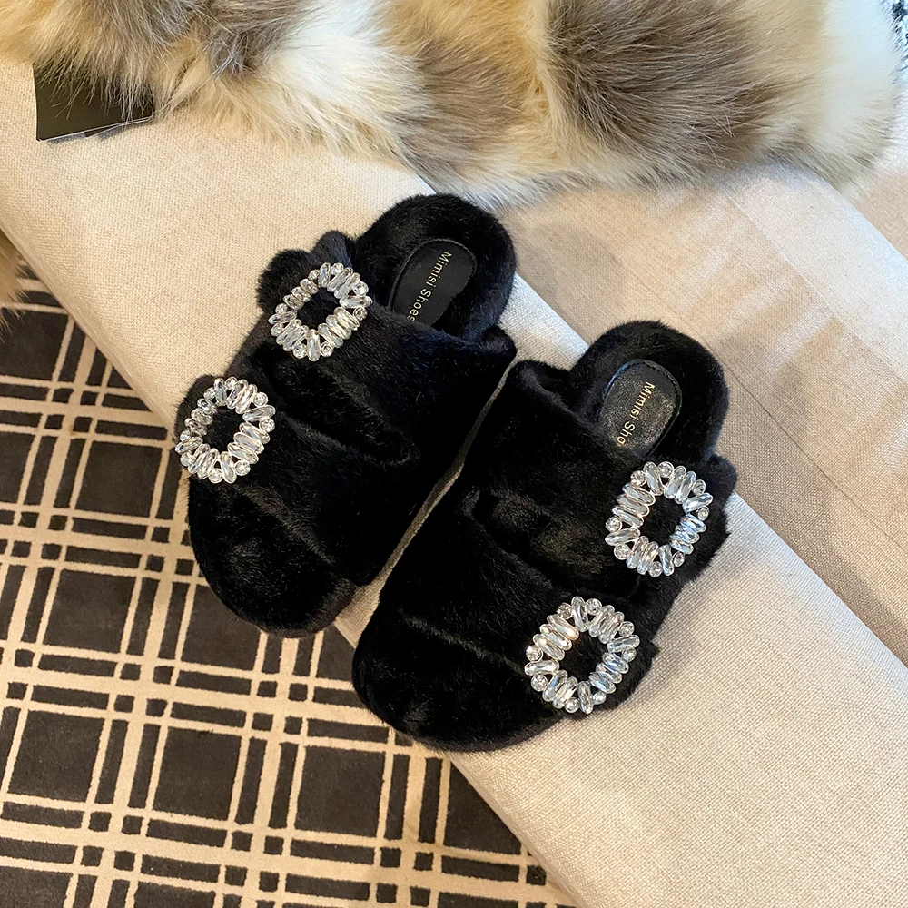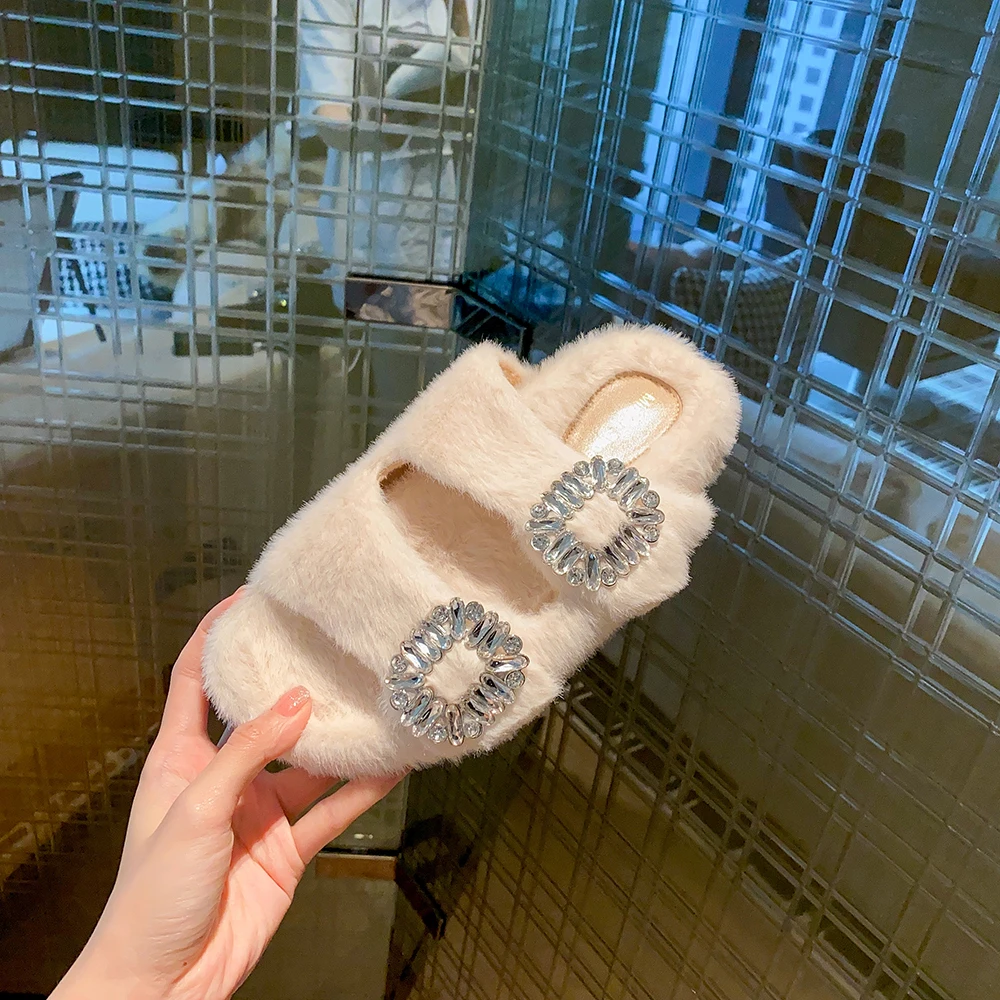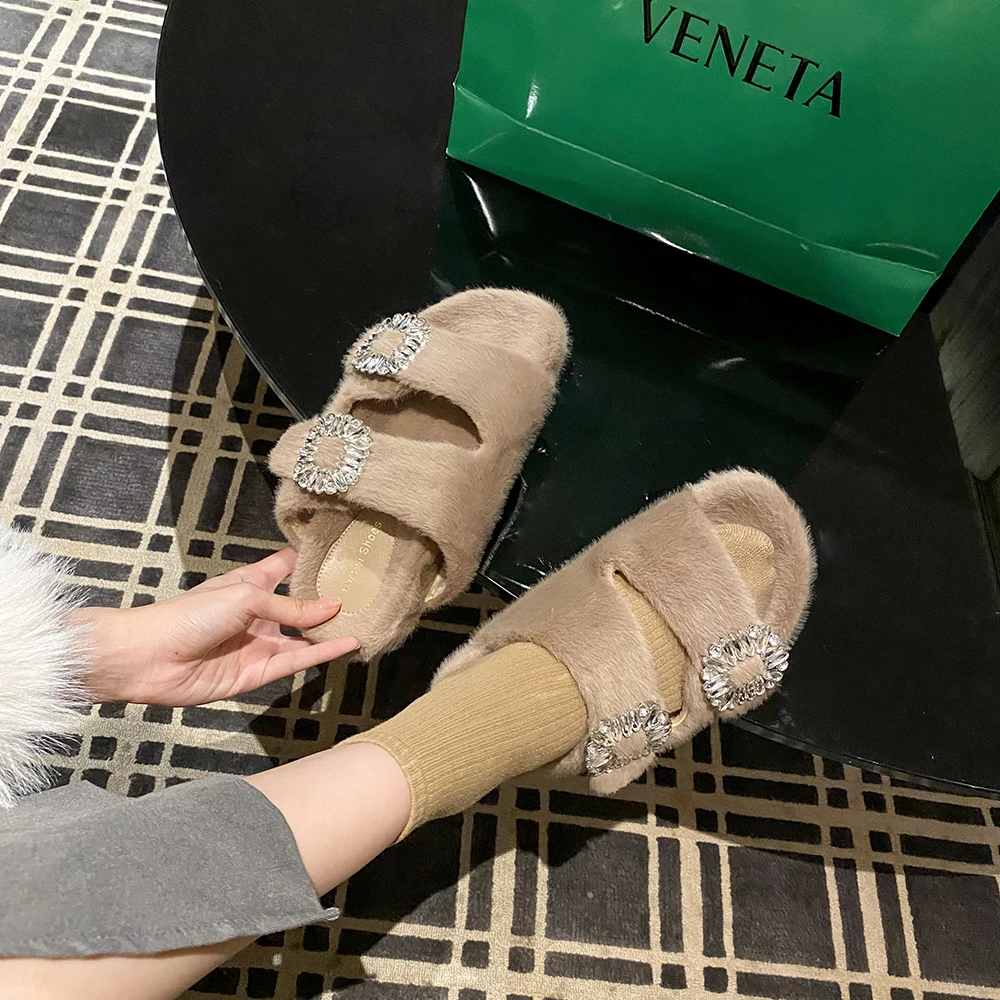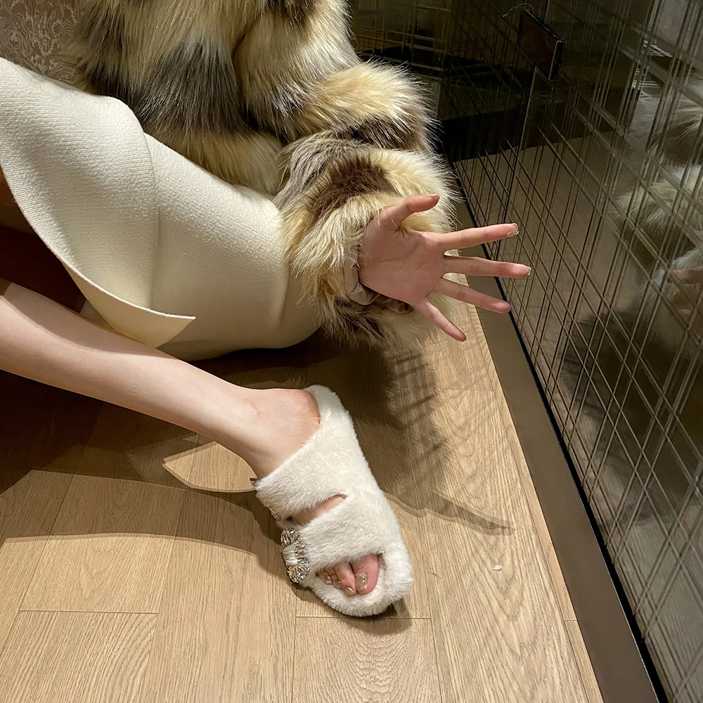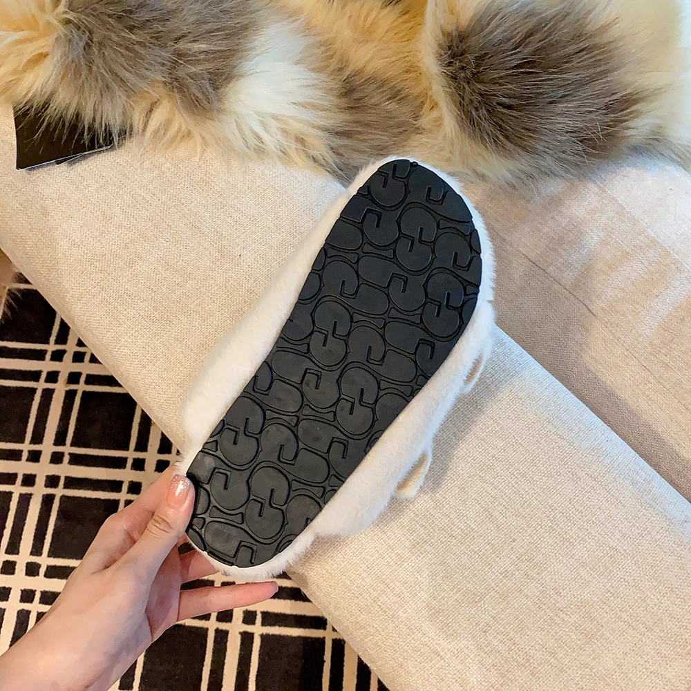 LBSFY - Round Toe Women Slides Slippers Open Toe Fur Summer Dress Shoes Flat Low Heels Black Beige White Slip On Casual Party Pumps 39