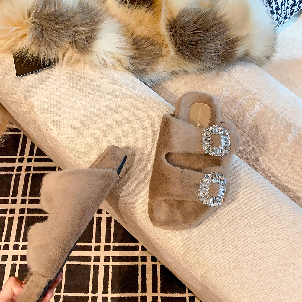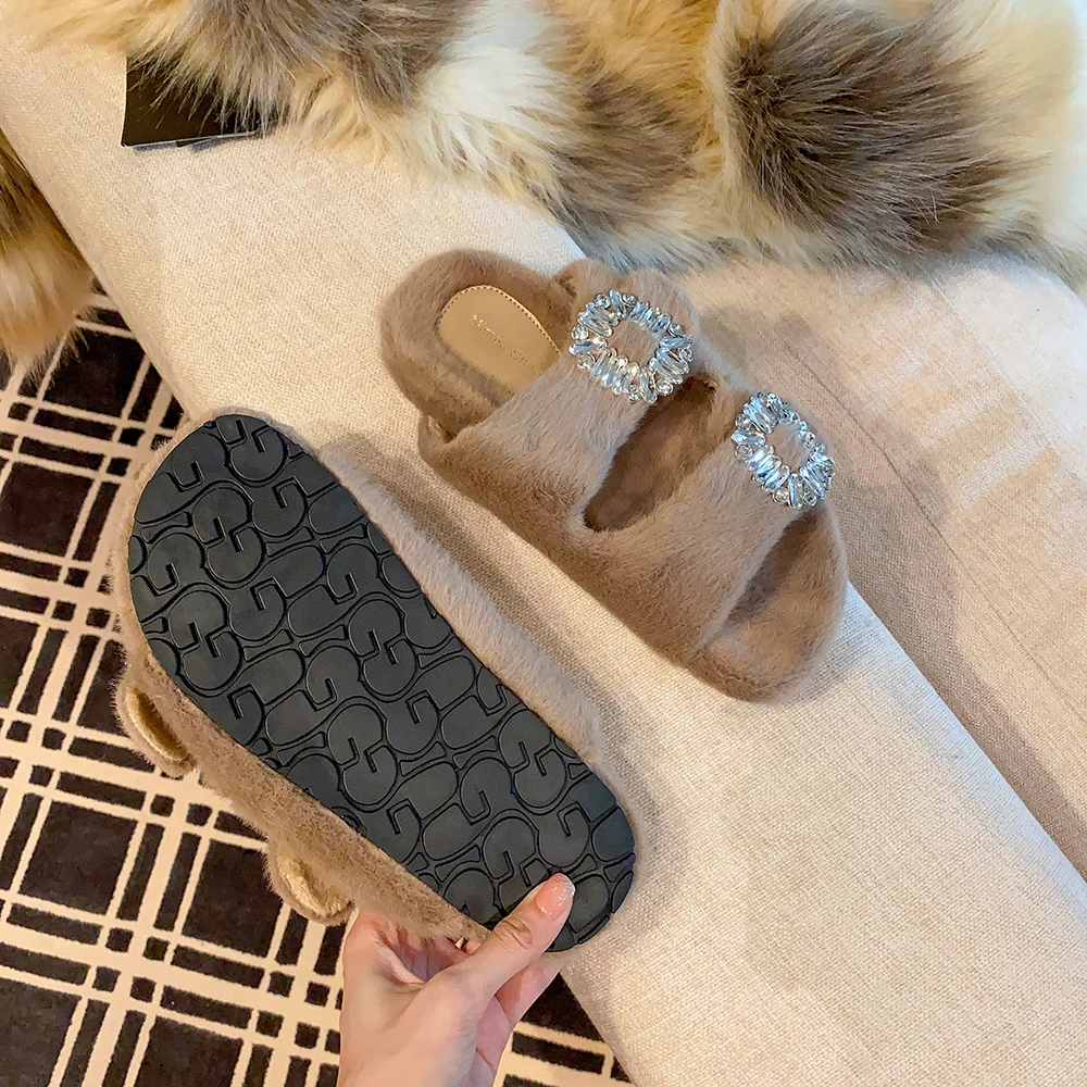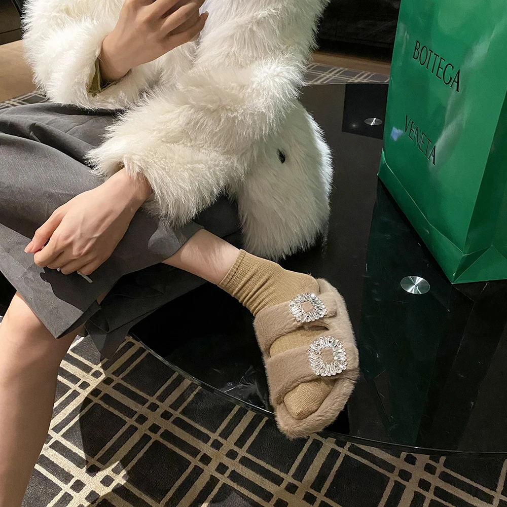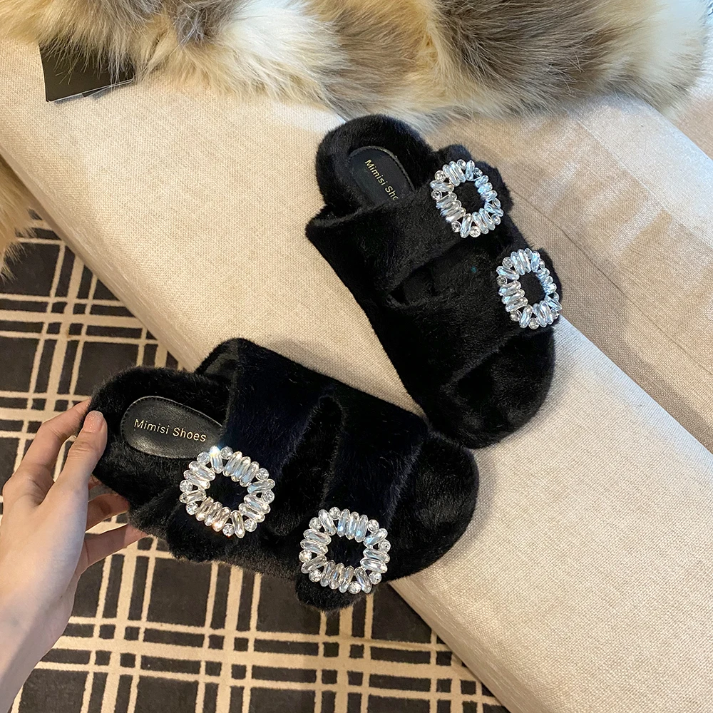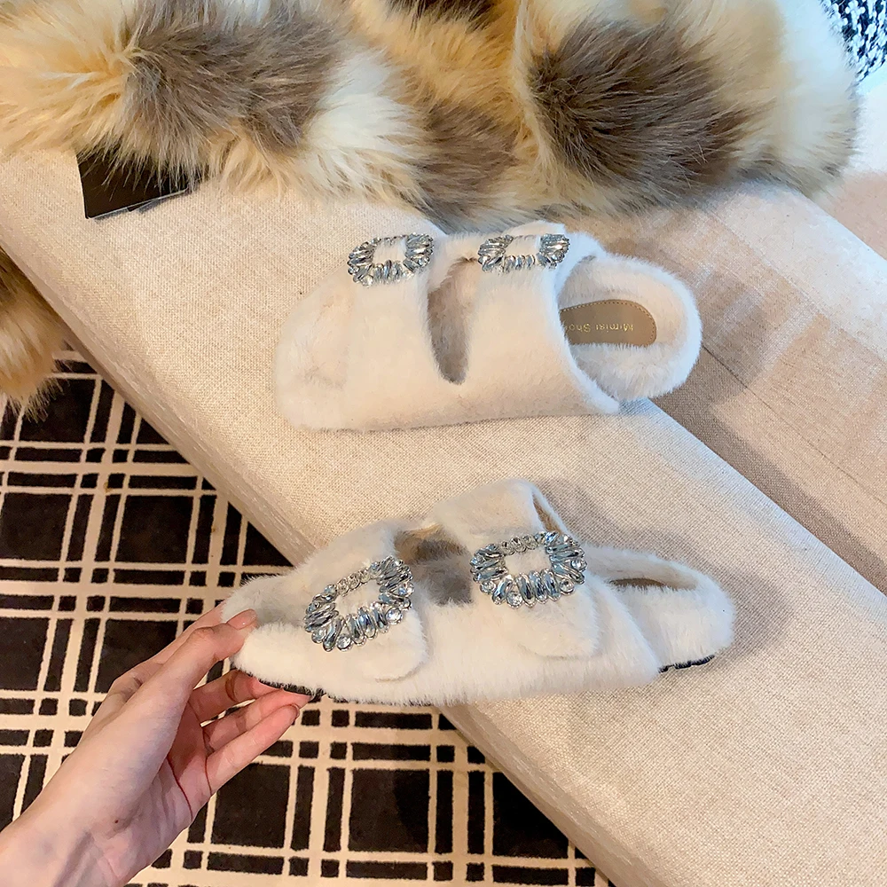 LBSFY - Round Toe Women Slides Slippers Open Toe Fur Summer Dress Shoes Flat Low Heels Black Beige White Slip On Casual Party Pumps 39