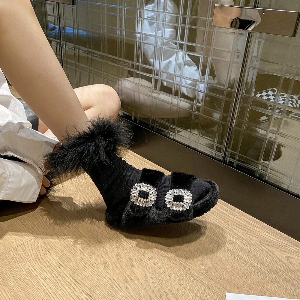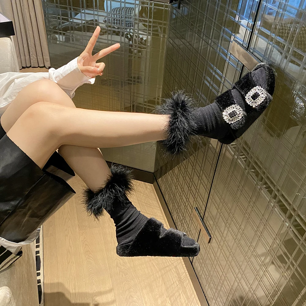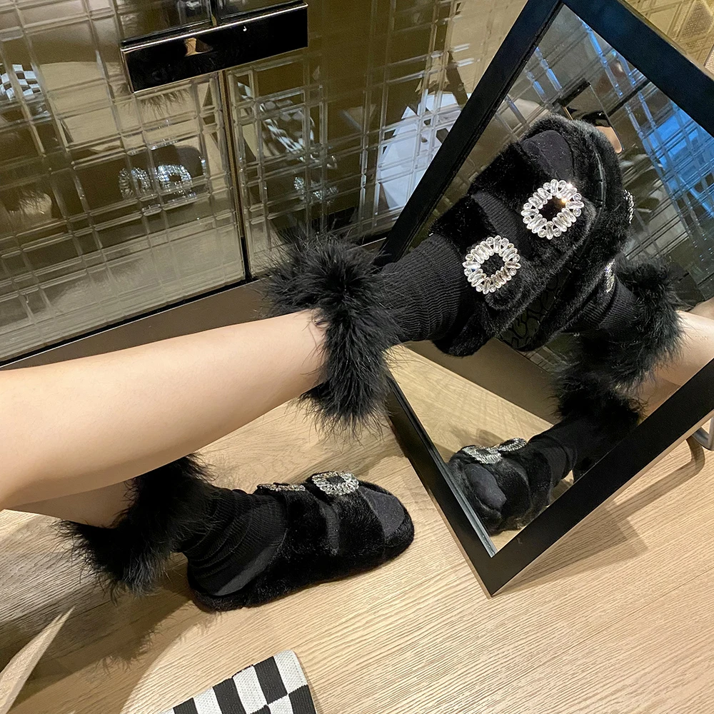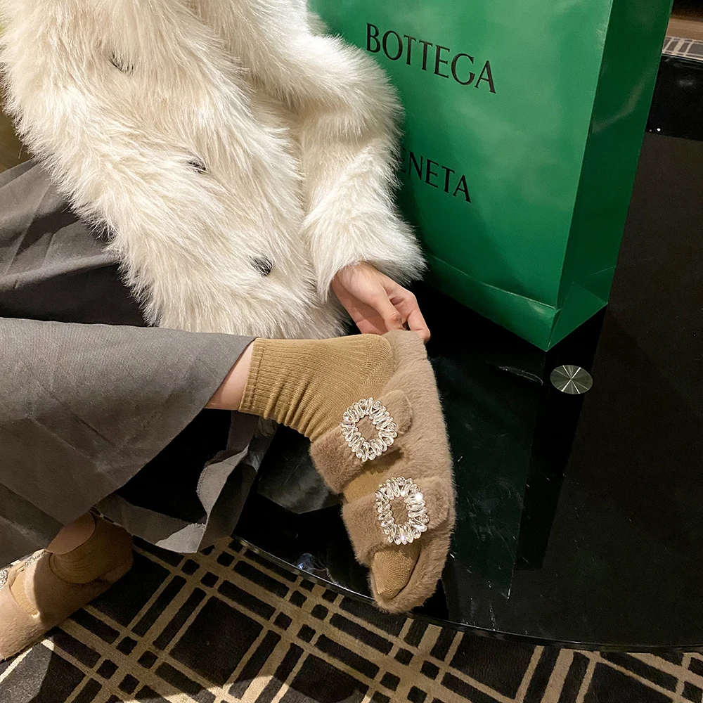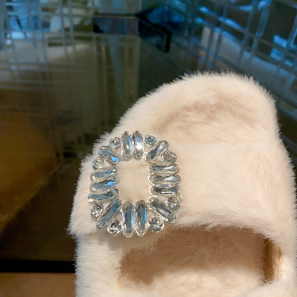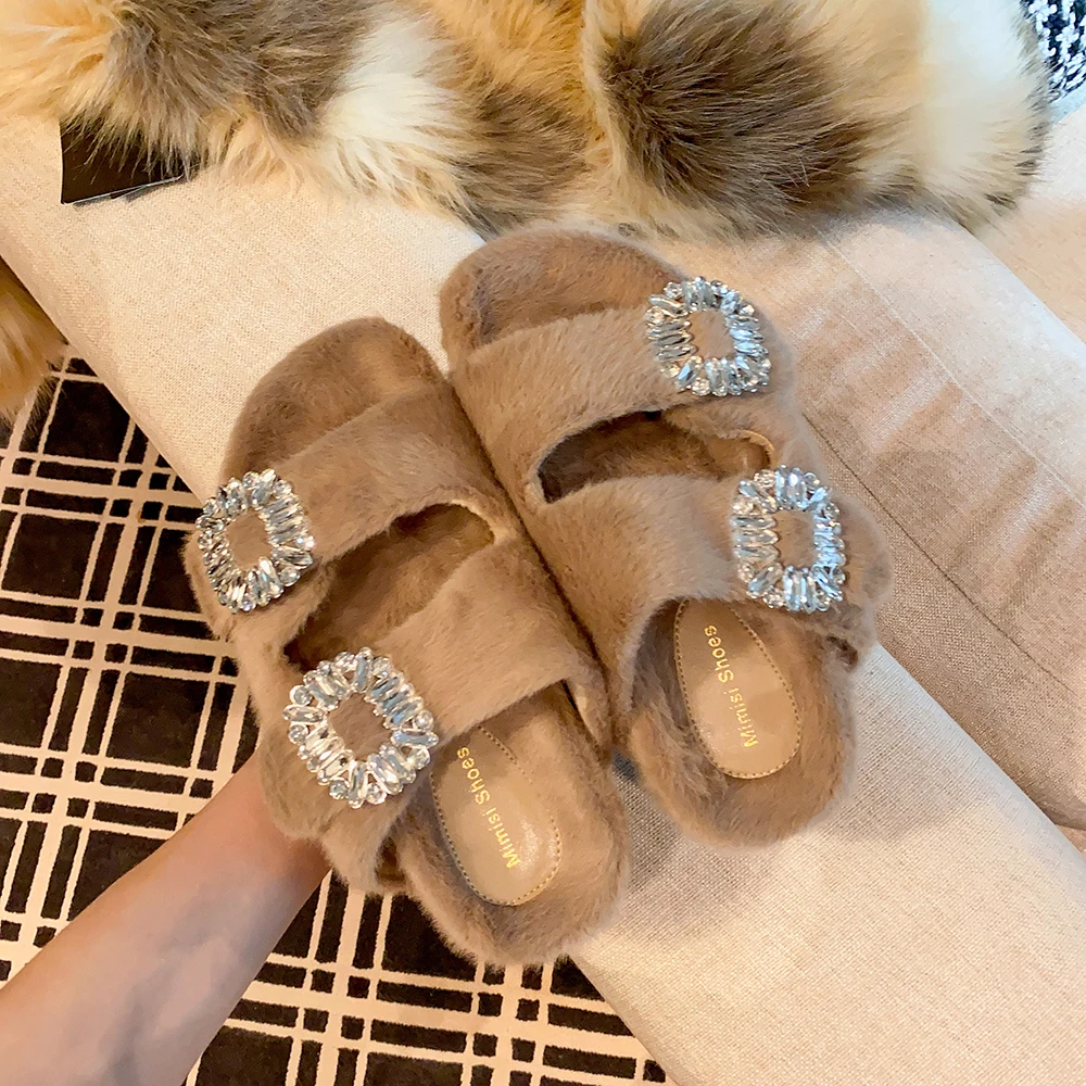 LBSFY - Round Toe Women Slides Slippers Open Toe Fur Summer Dress Shoes Flat Low Heels Black Beige White Slip On Casual Party Pumps 39