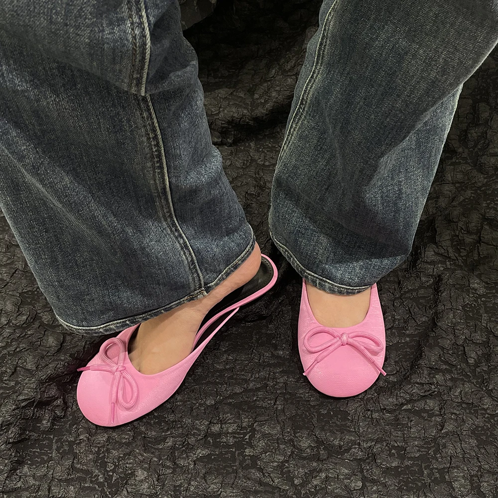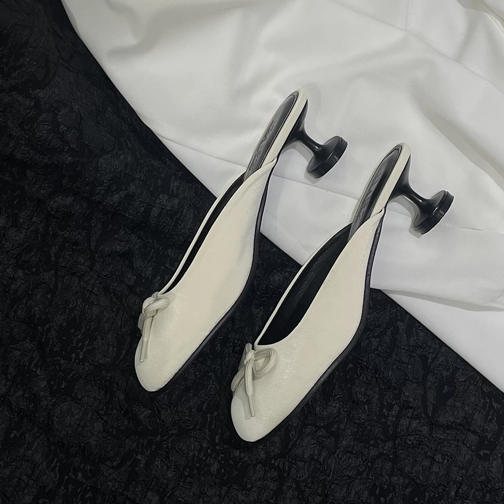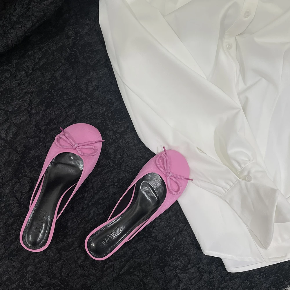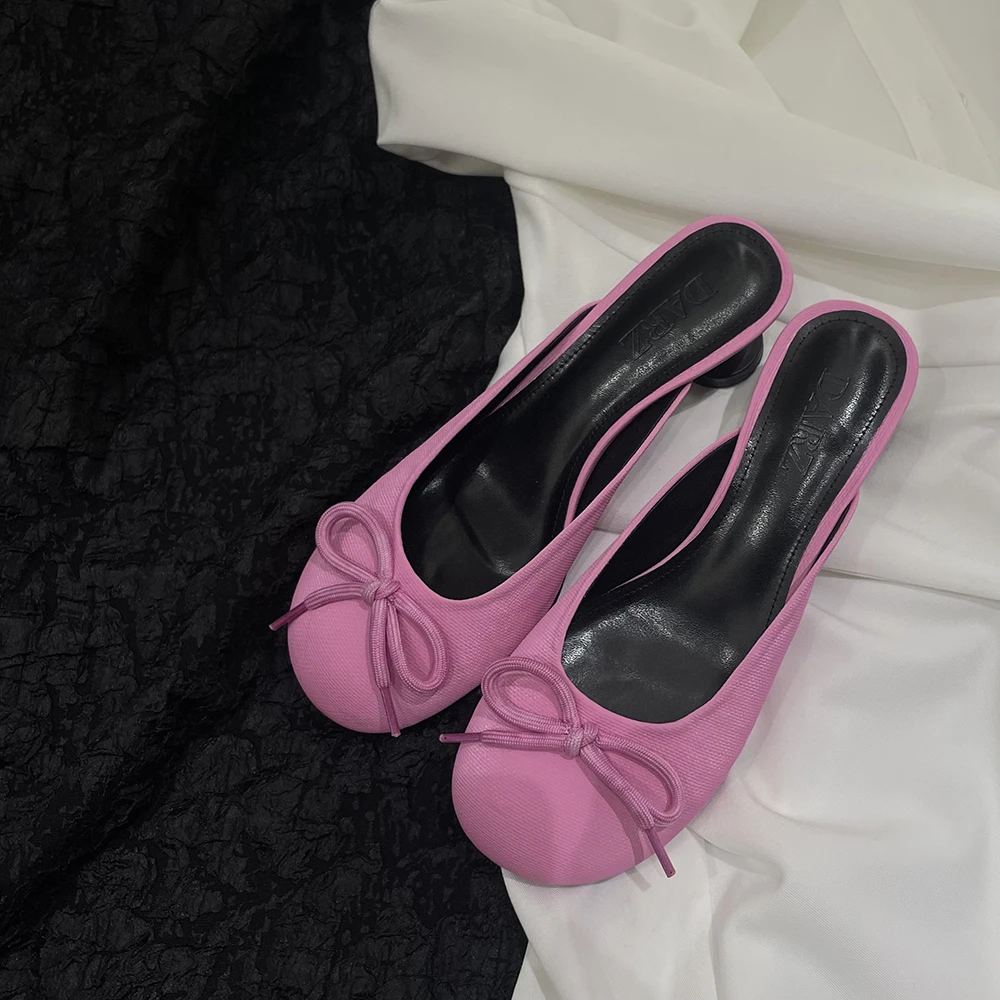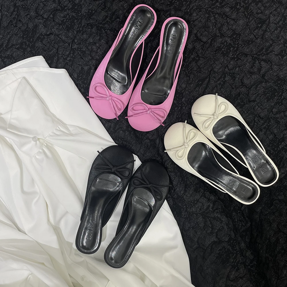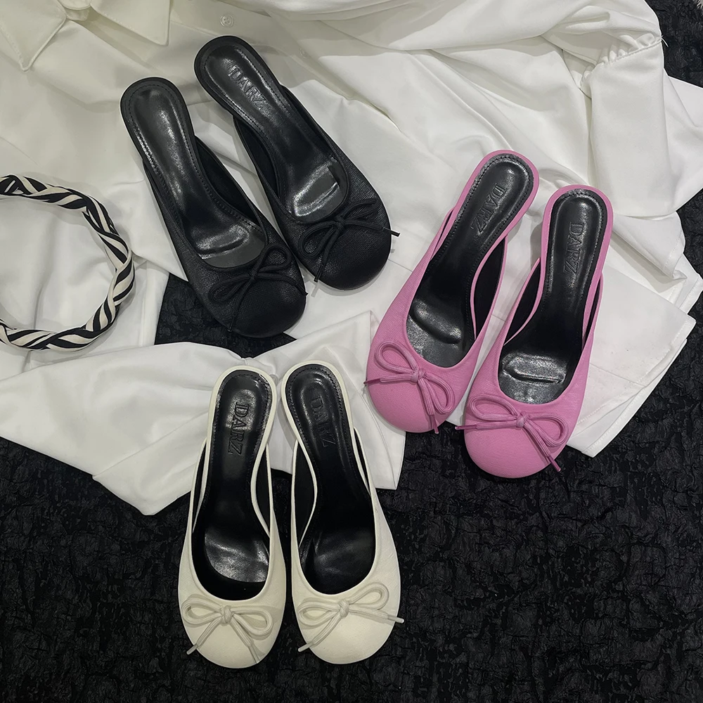 LBSFY - Round Toe Women Slippers 2024 New Arrivals Black White Pink Bow Design Thin Mid Heels Shallow Slip On Party Pumps Casual Mules