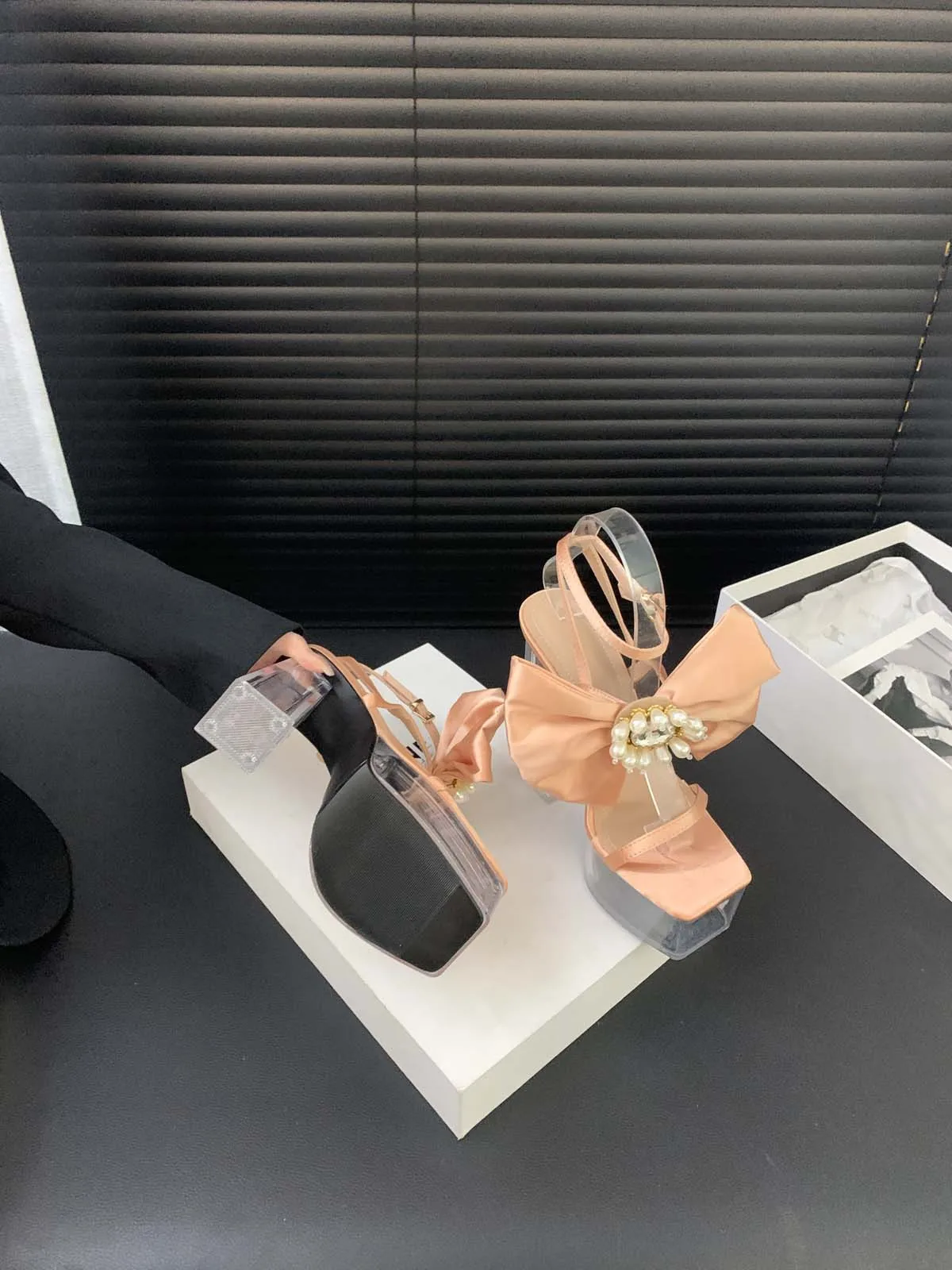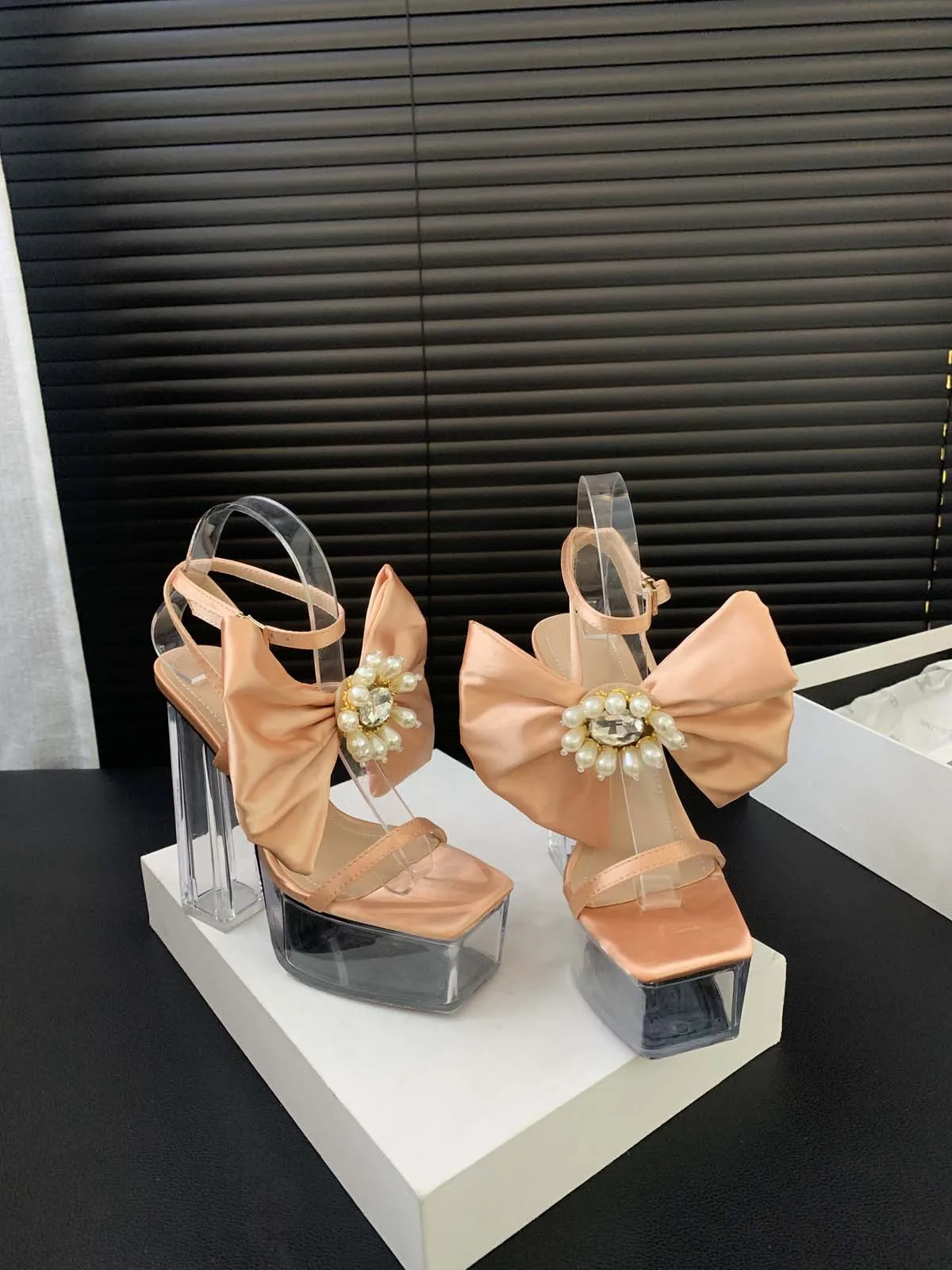 LBSFY - Satin Bows Transparent Sandals Women Pumps Square Head Party Dress Bridal Shoes Summer Sexy Crystal Platform High Heels Ladies