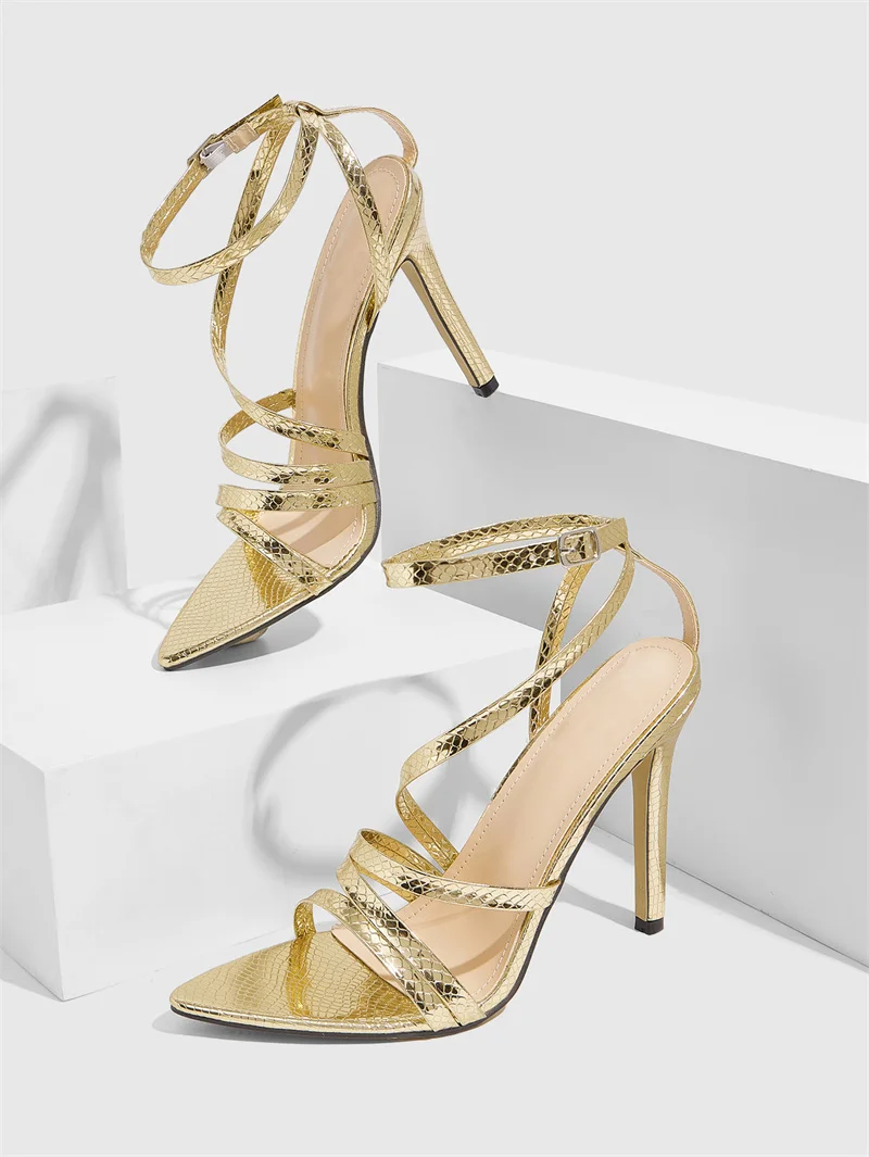LBSFY -Sexy Gold Snake Print Leather Ankle Strap Sandals Women Narrow Band Pointed Toe Stripper Heels Party Prom Shoes Size 36-42