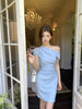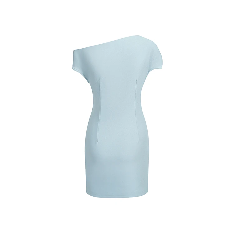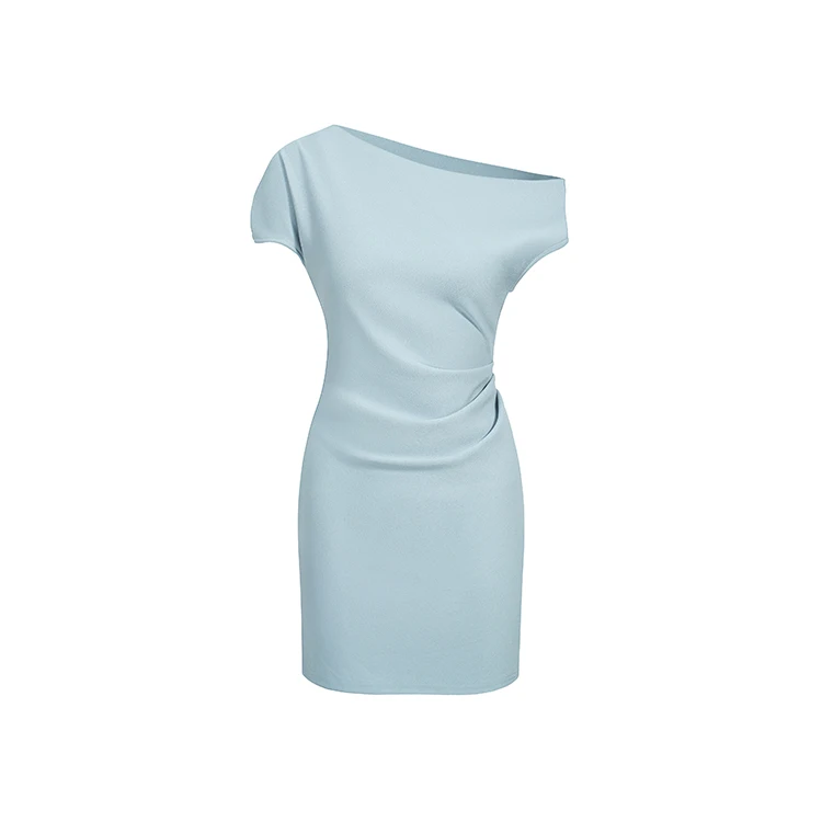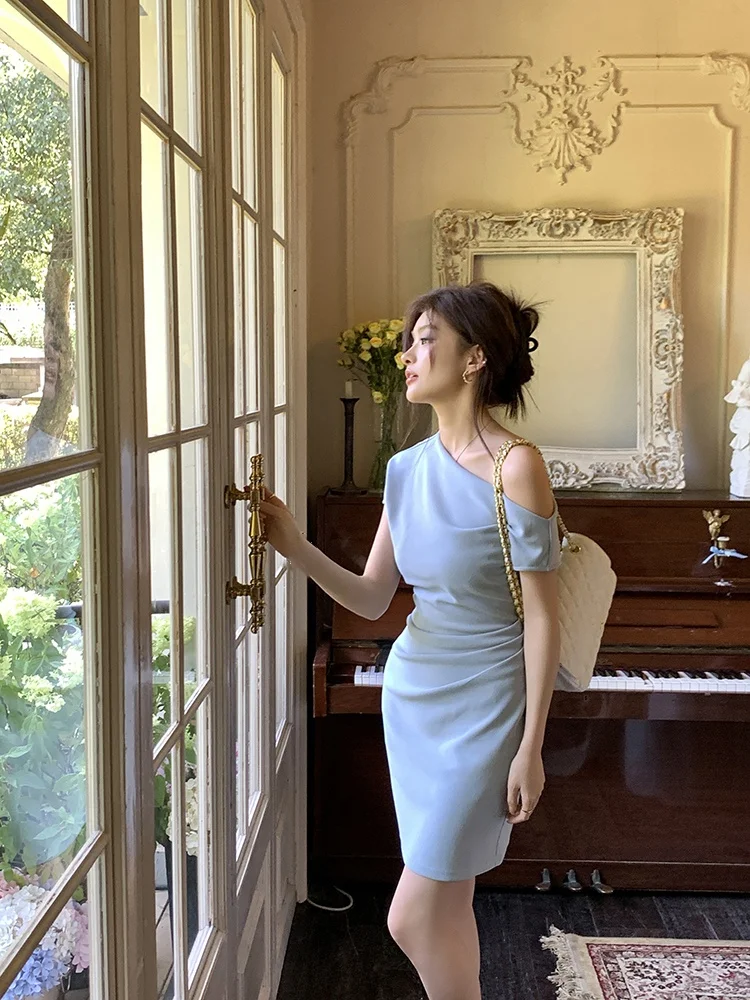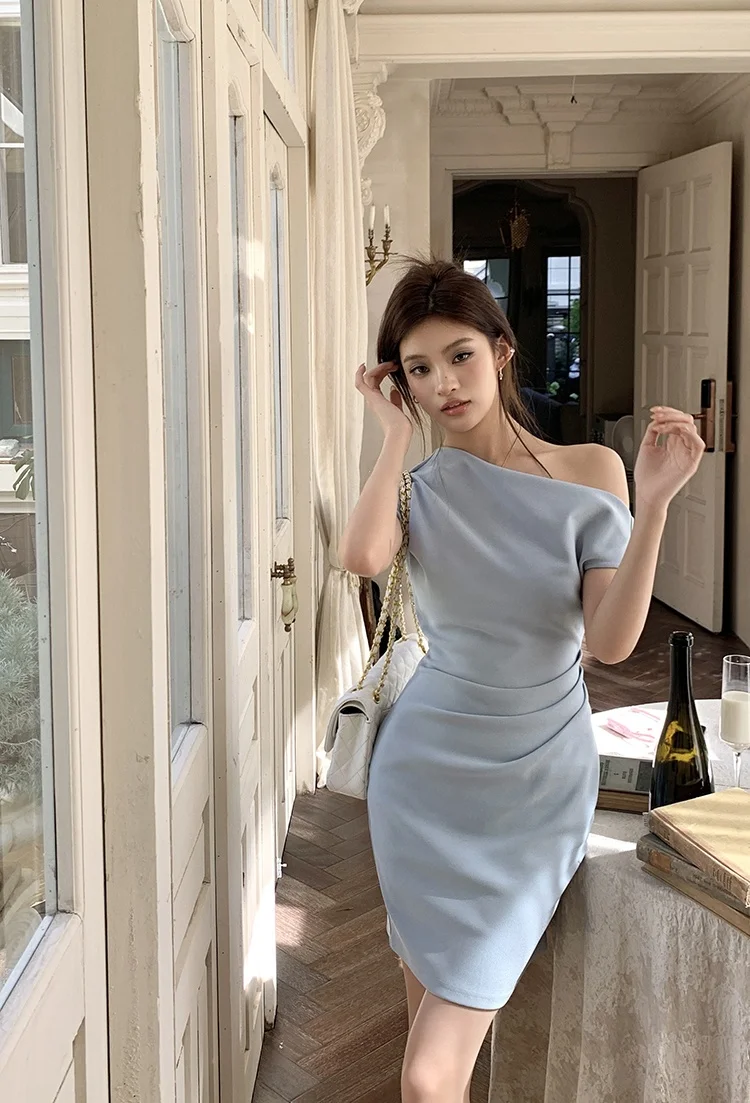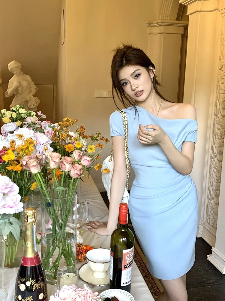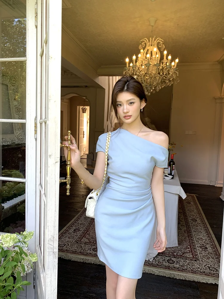 LBSFY -Sexy Korean Fashion Elegant Inclined-Shoulder Blue Short Dresses Backless Slim Pleated Party Dress Spring Summer New Vestidos
