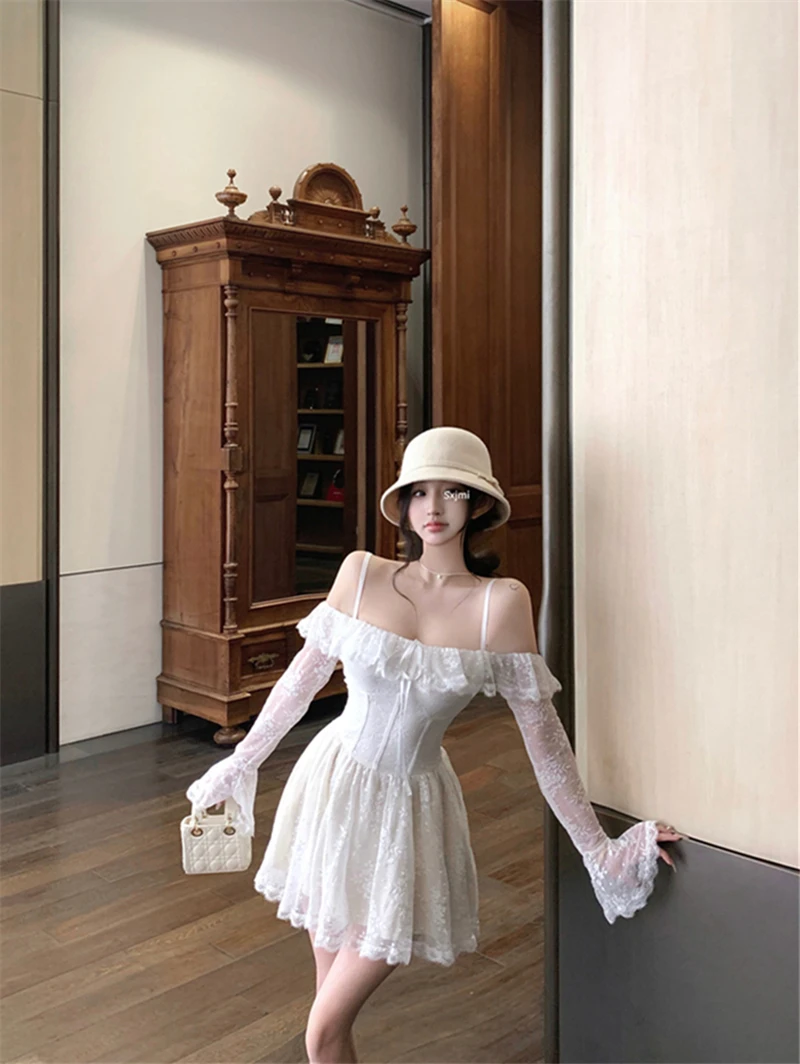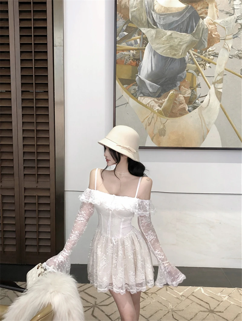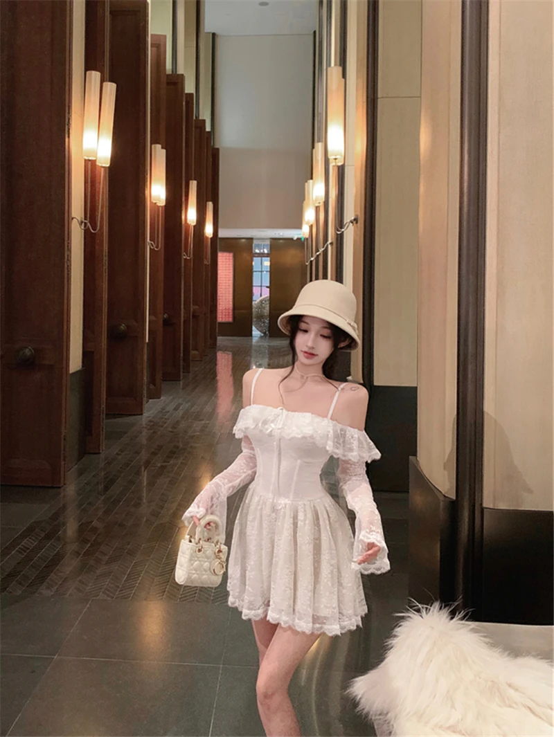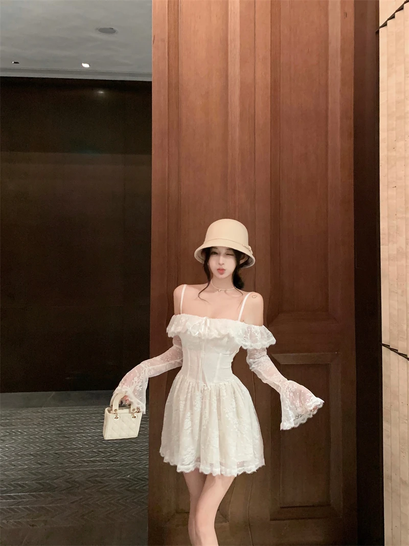 LBSFY -Sexy Lace Mini Dress for Women Sweet Slash Neck Spaghetti Strap Flare Long Sleeves Ruffle Slim Party Dresses Female Clothing New