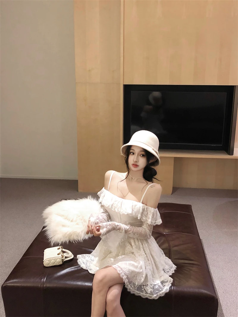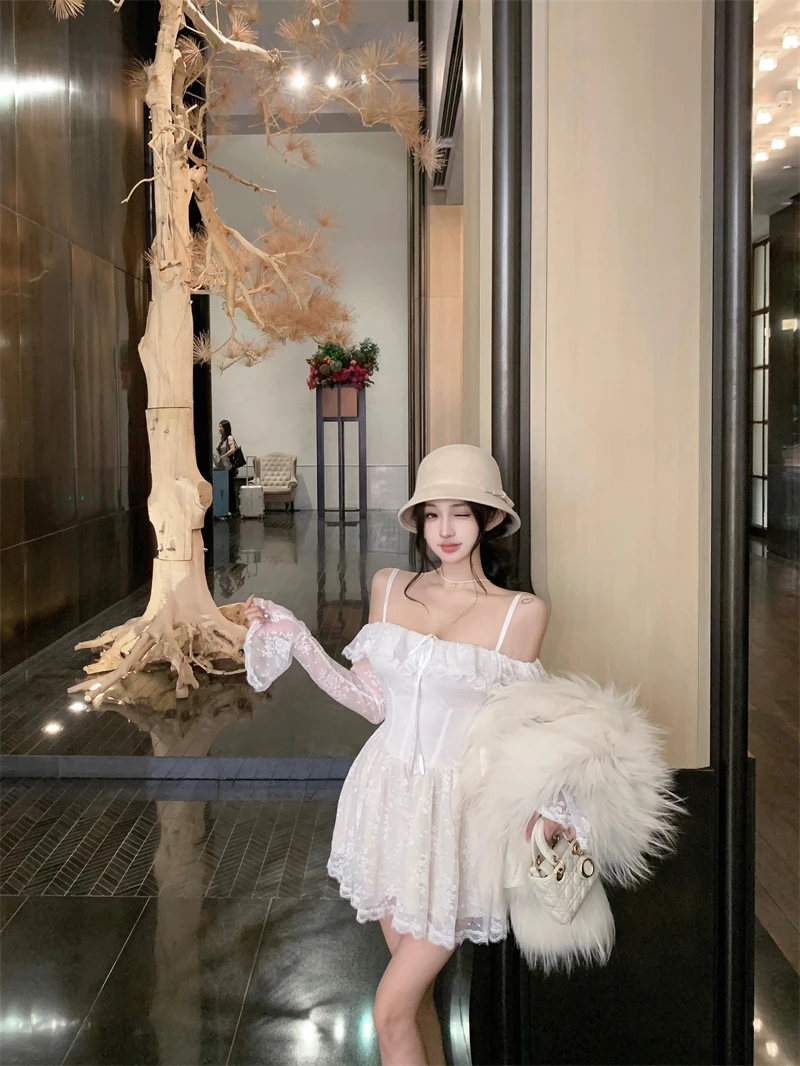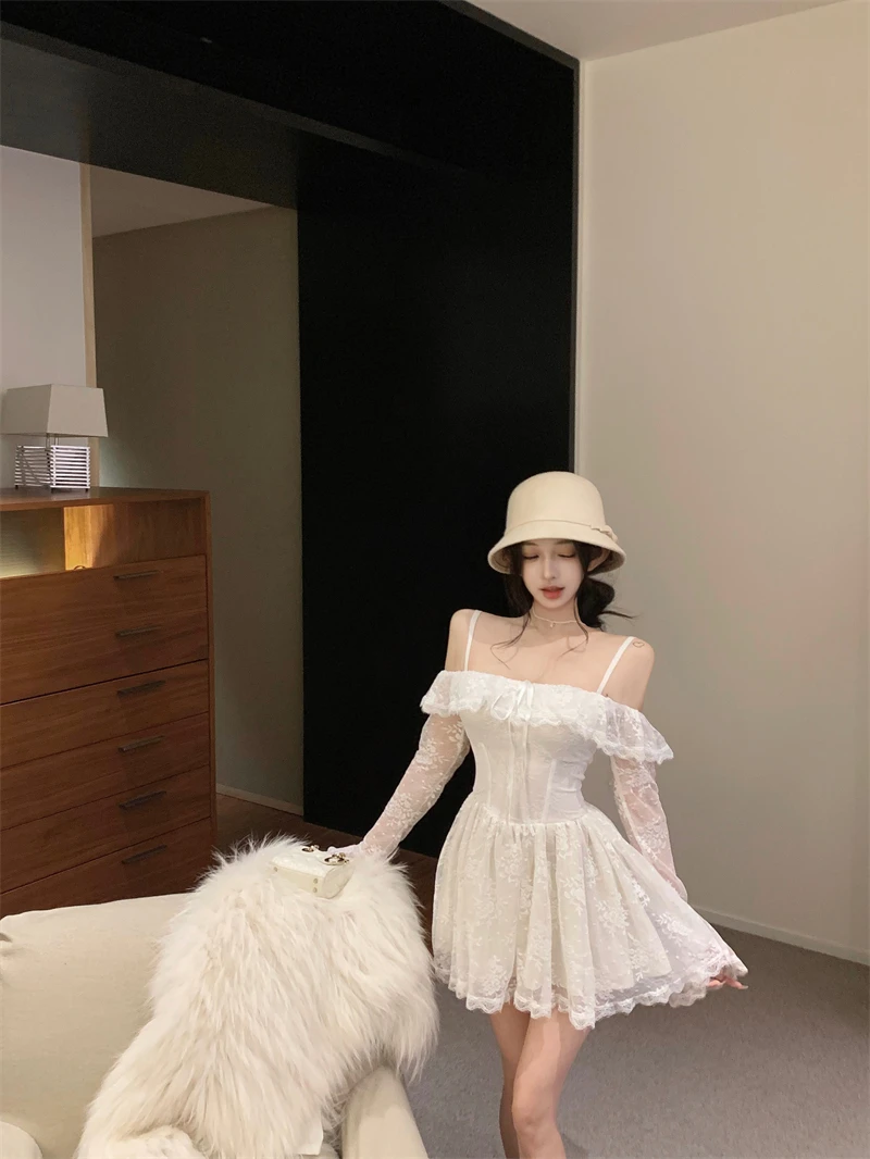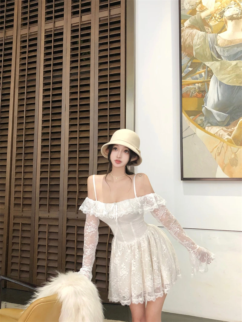 LBSFY -Sexy Lace Mini Dress for Women Sweet Slash Neck Spaghetti Strap Flare Long Sleeves Ruffle Slim Party Dresses Female Clothing New
