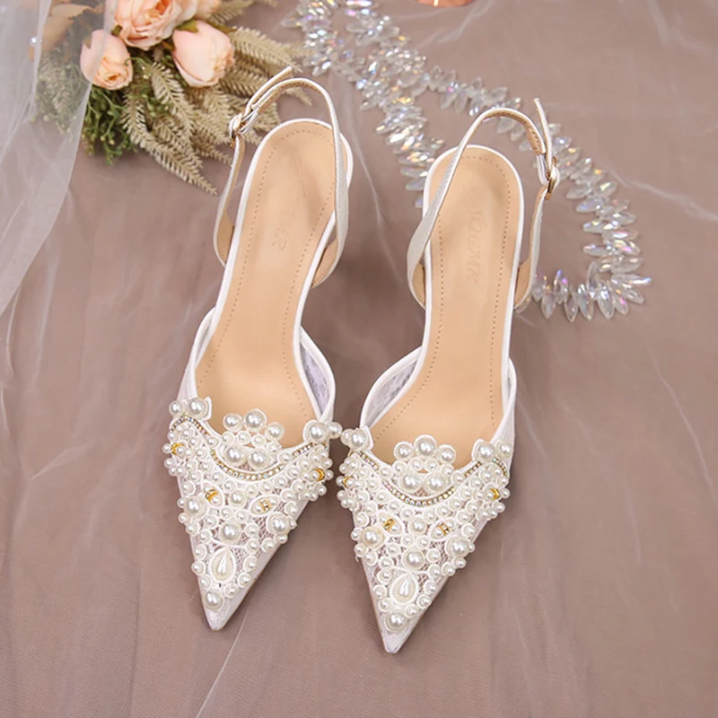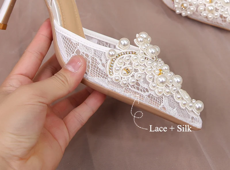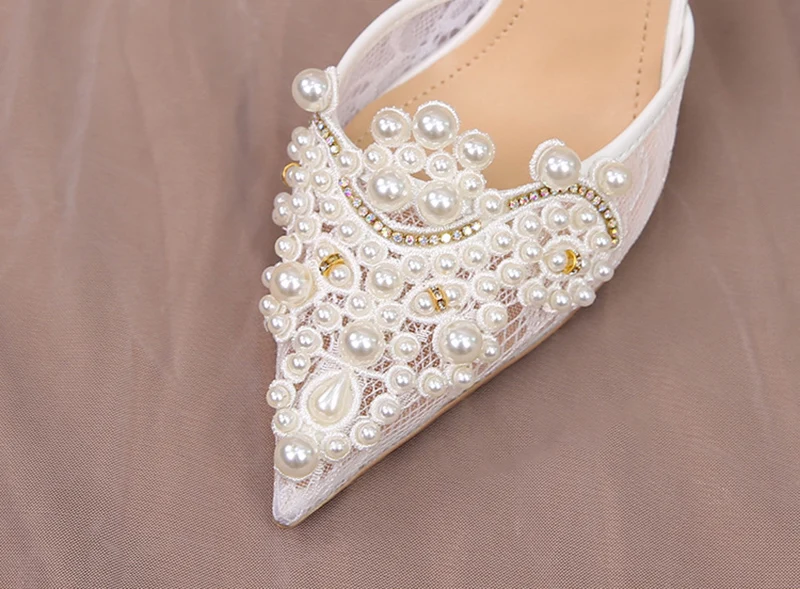LBSFY - Sexy Lace Thin Heels Sandals Women Elegant Pearl High Heels Pumps Woman Summer Pointed Toe Bling Crytsal Party Shoes