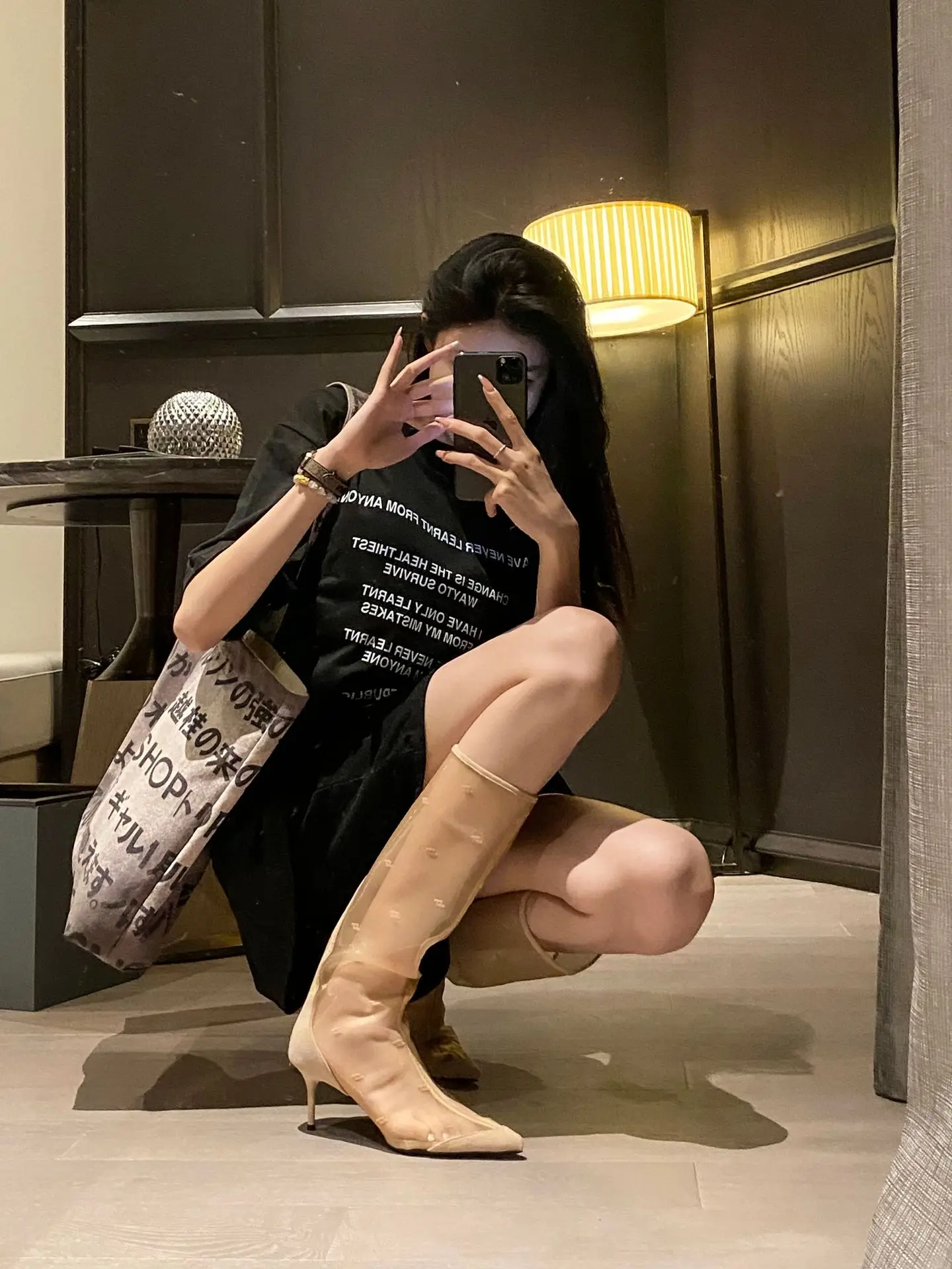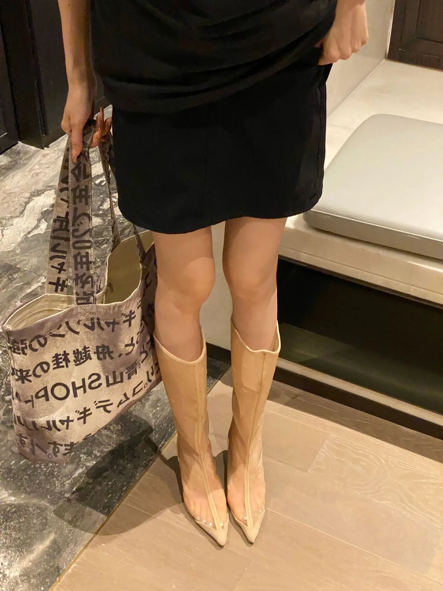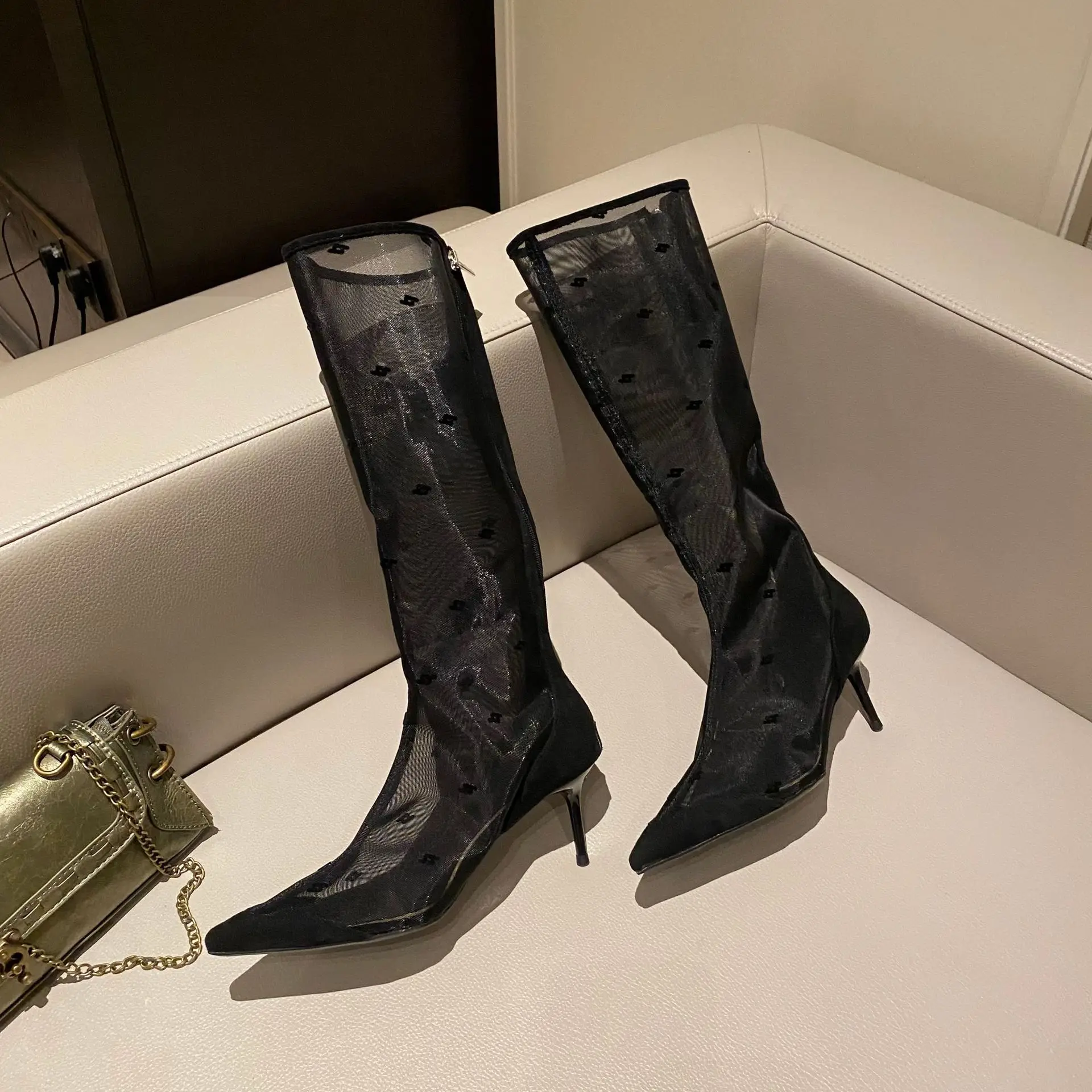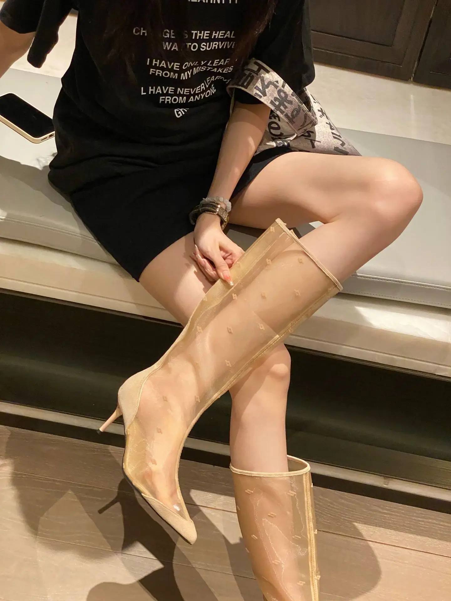 LBSFY - Sexy Mesh Pointed Thin Heel Long Boots for Women In The Summer of 2024, New Niche Long Tube Boots, Breathable Nude High Heels