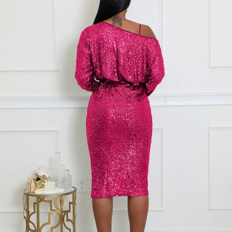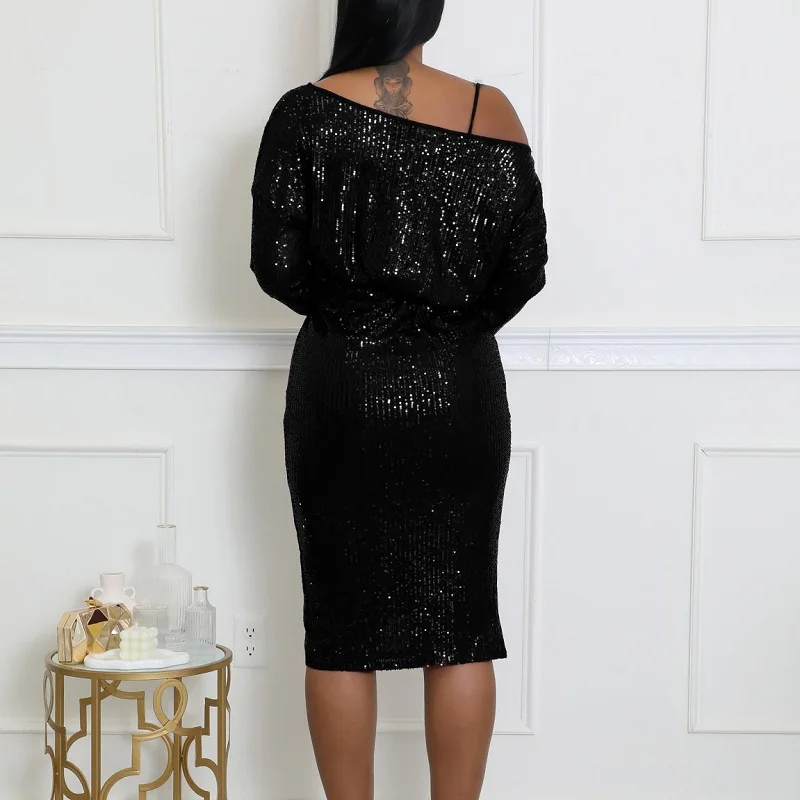 LBSFY - Sexy Shiny Sequins Club Evening Dress Fashion Hight Waist Solid Slim Party Dress Women Elegant Off Shoulder Lace-up Midi Dresses