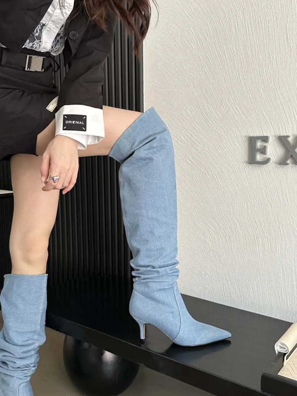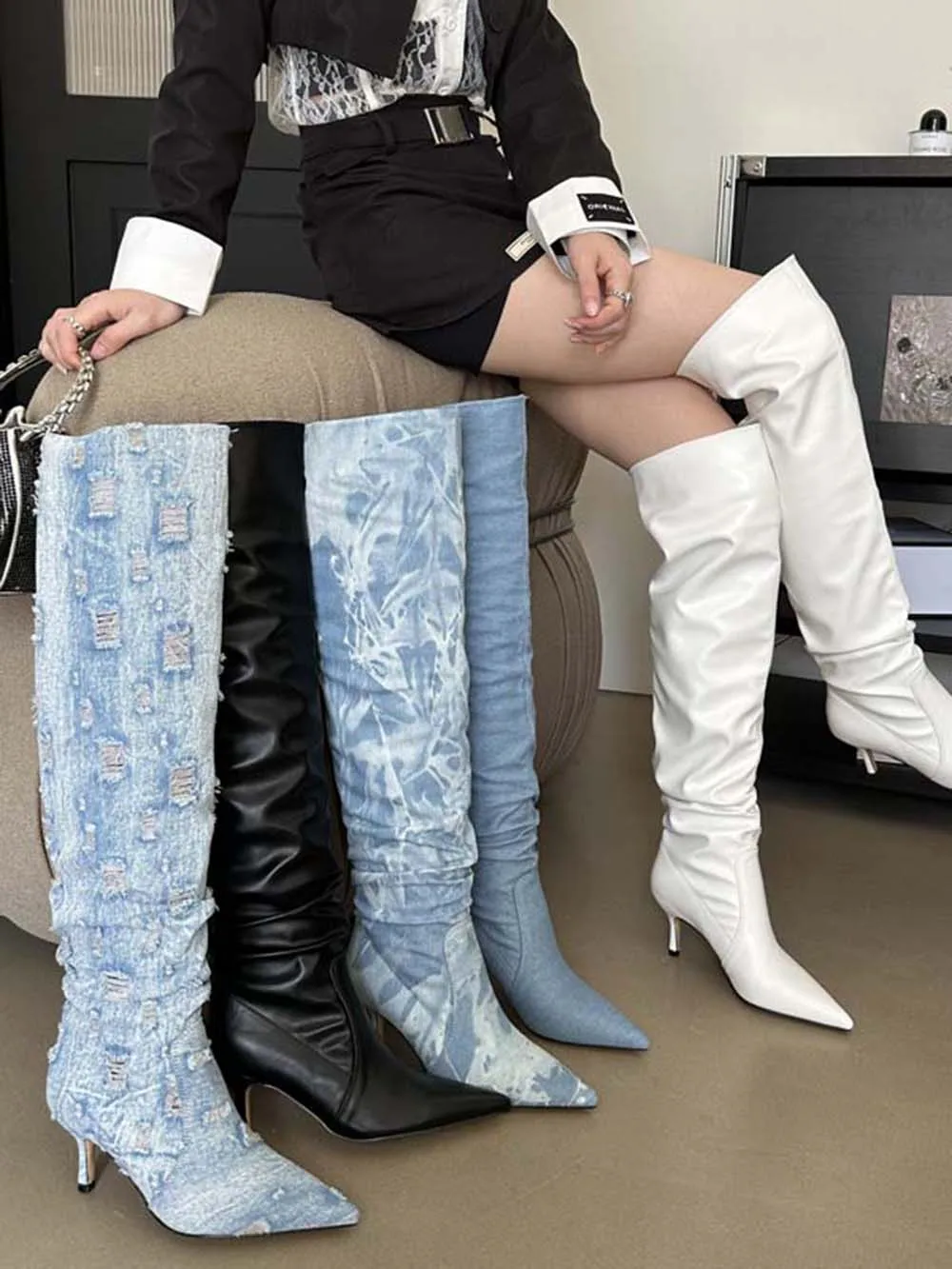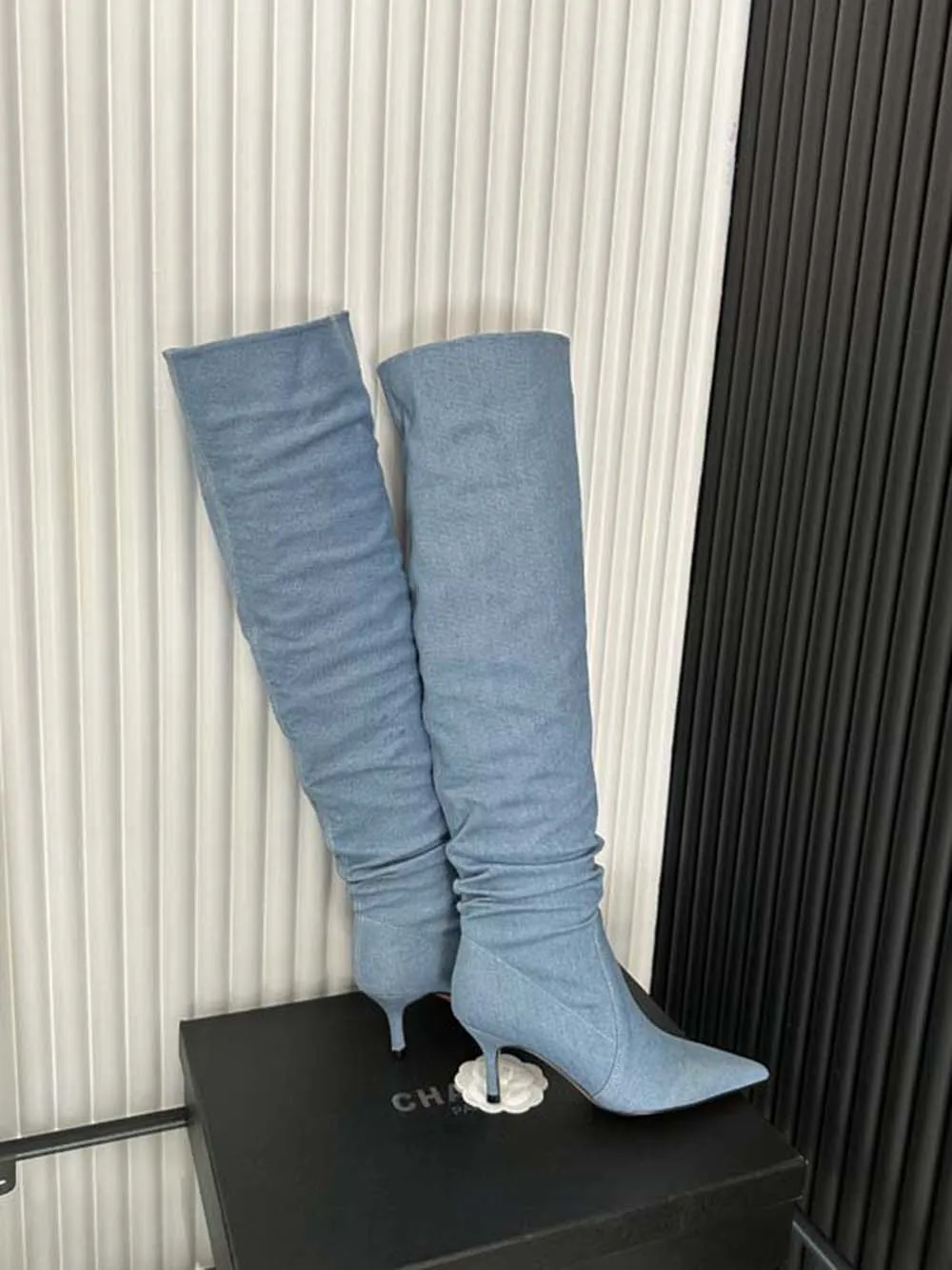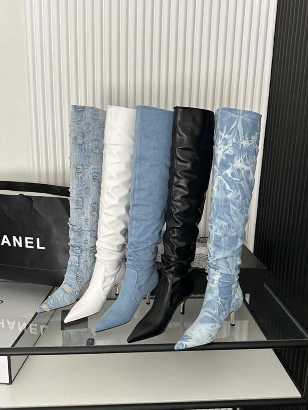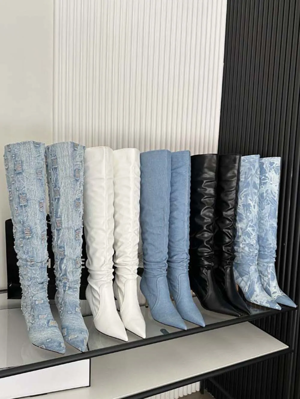 LBSFY - Sexy Women Over The Knee Boots Chelsea Booties Pointed Toe Blue Black White Denim Cloth Winter Dress Shoes Slip On Autumn Boots