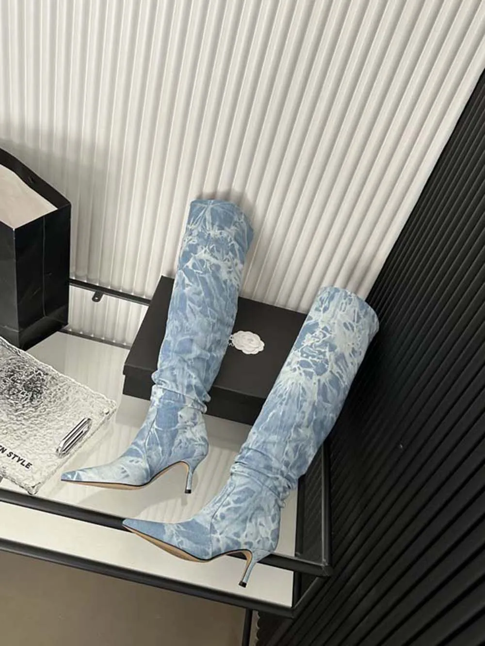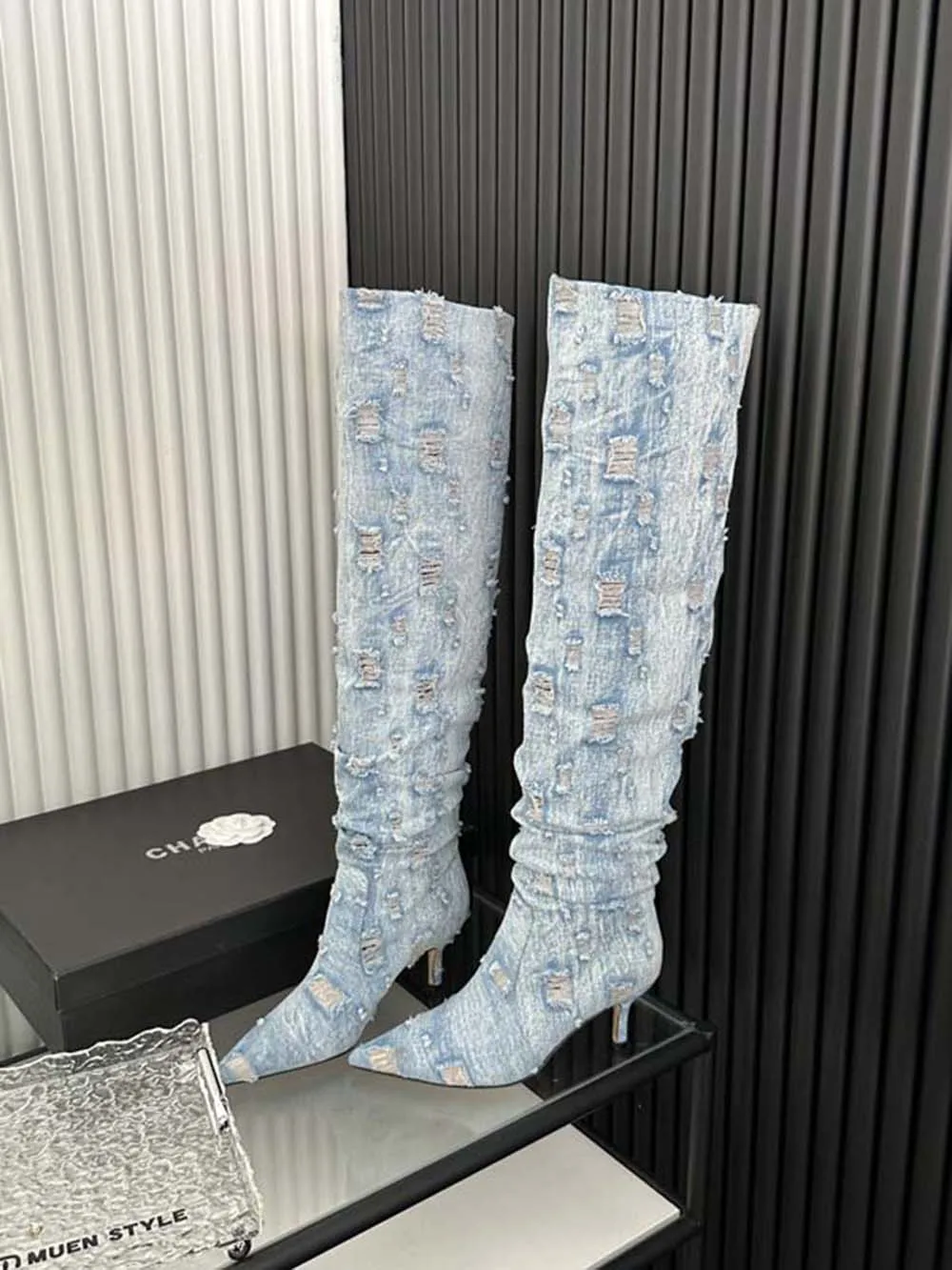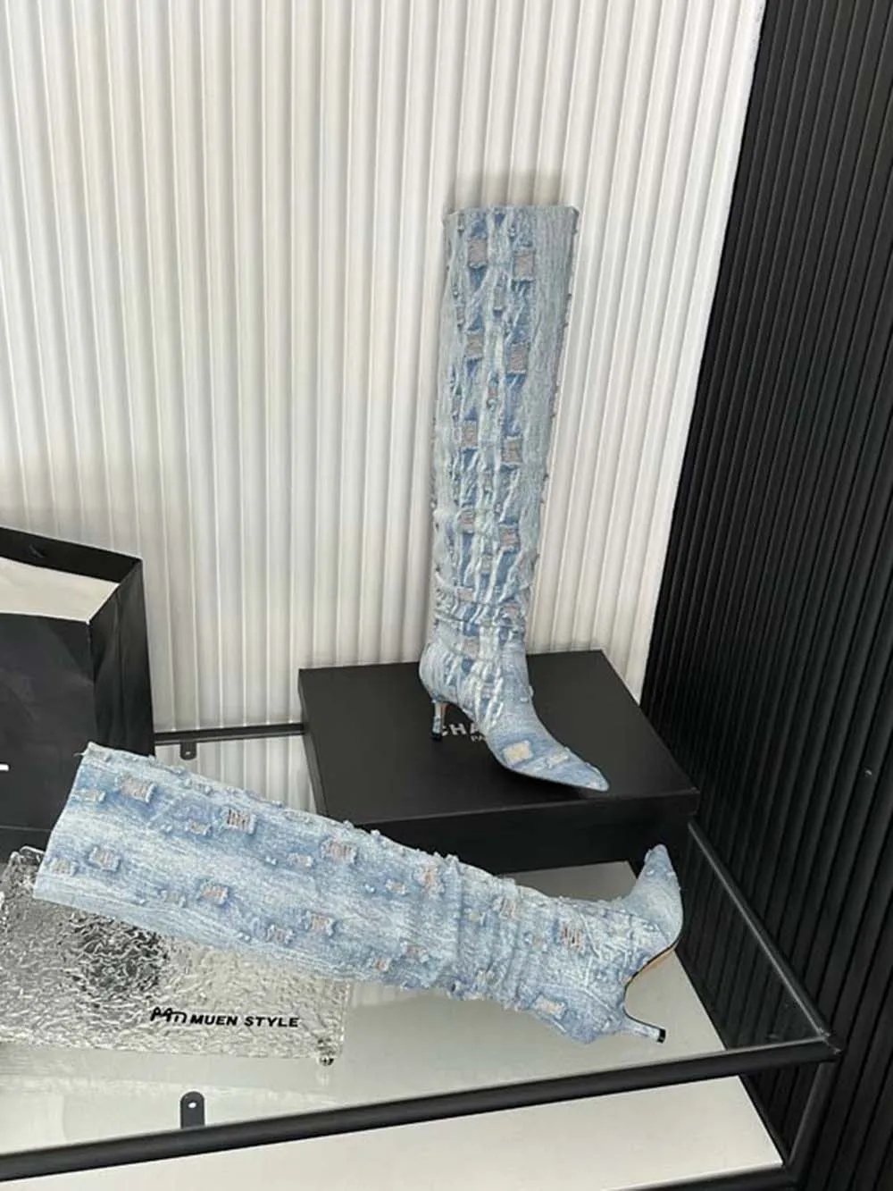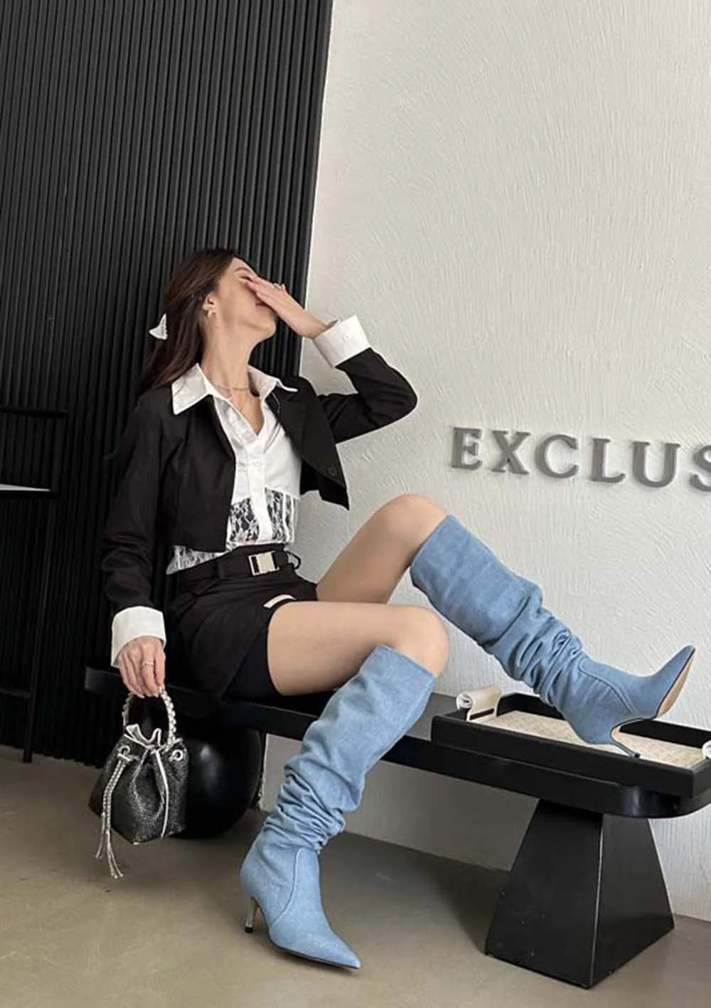 LBSFY - Sexy Women Over The Knee Boots Chelsea Booties Pointed Toe Blue Black White Denim Cloth Winter Dress Shoes Slip On Autumn Boots