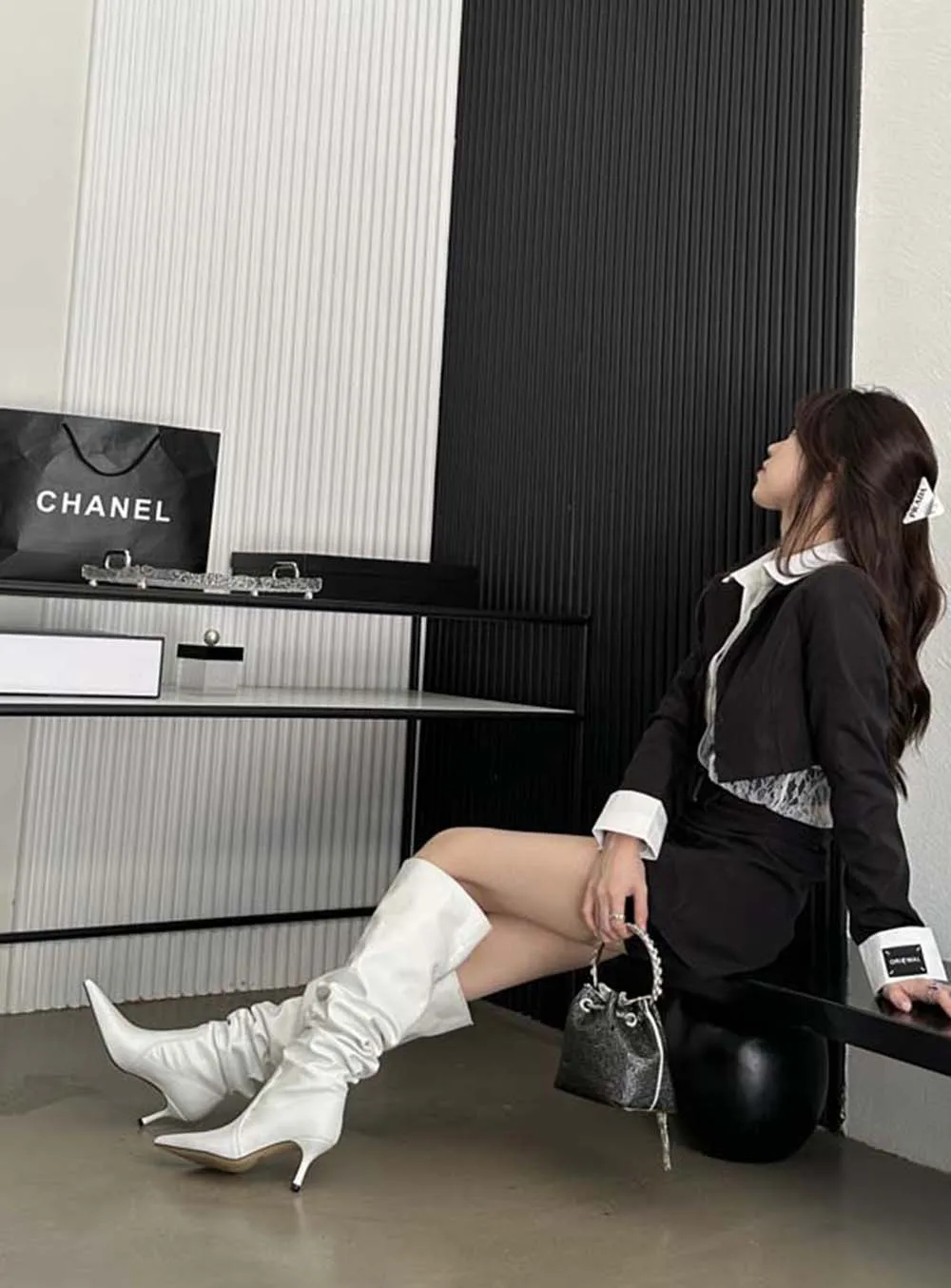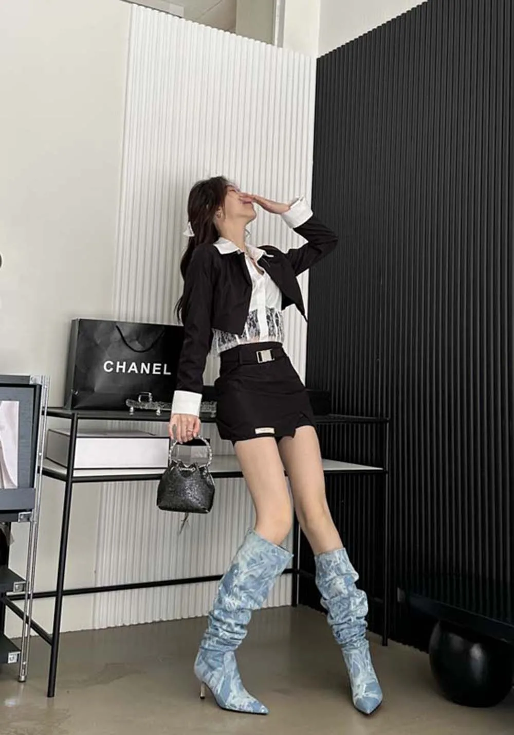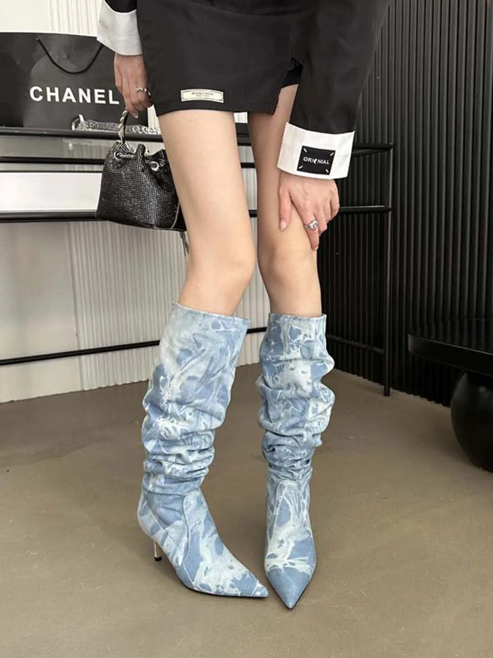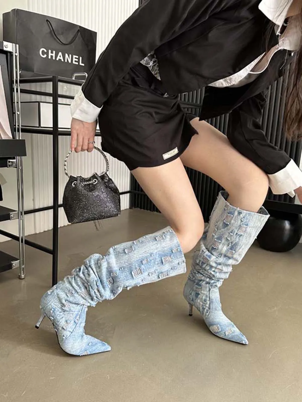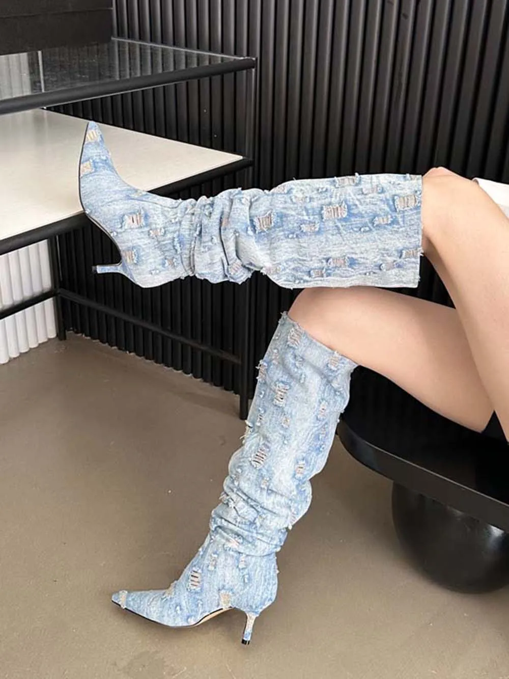 LBSFY - Sexy Women Over The Knee Boots Chelsea Booties Pointed Toe Blue Black White Denim Cloth Winter Dress Shoes Slip On Autumn Boots