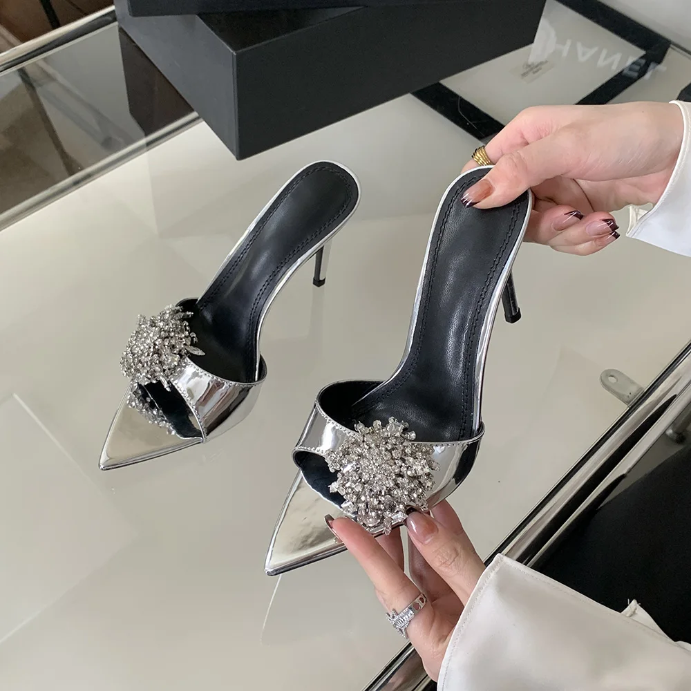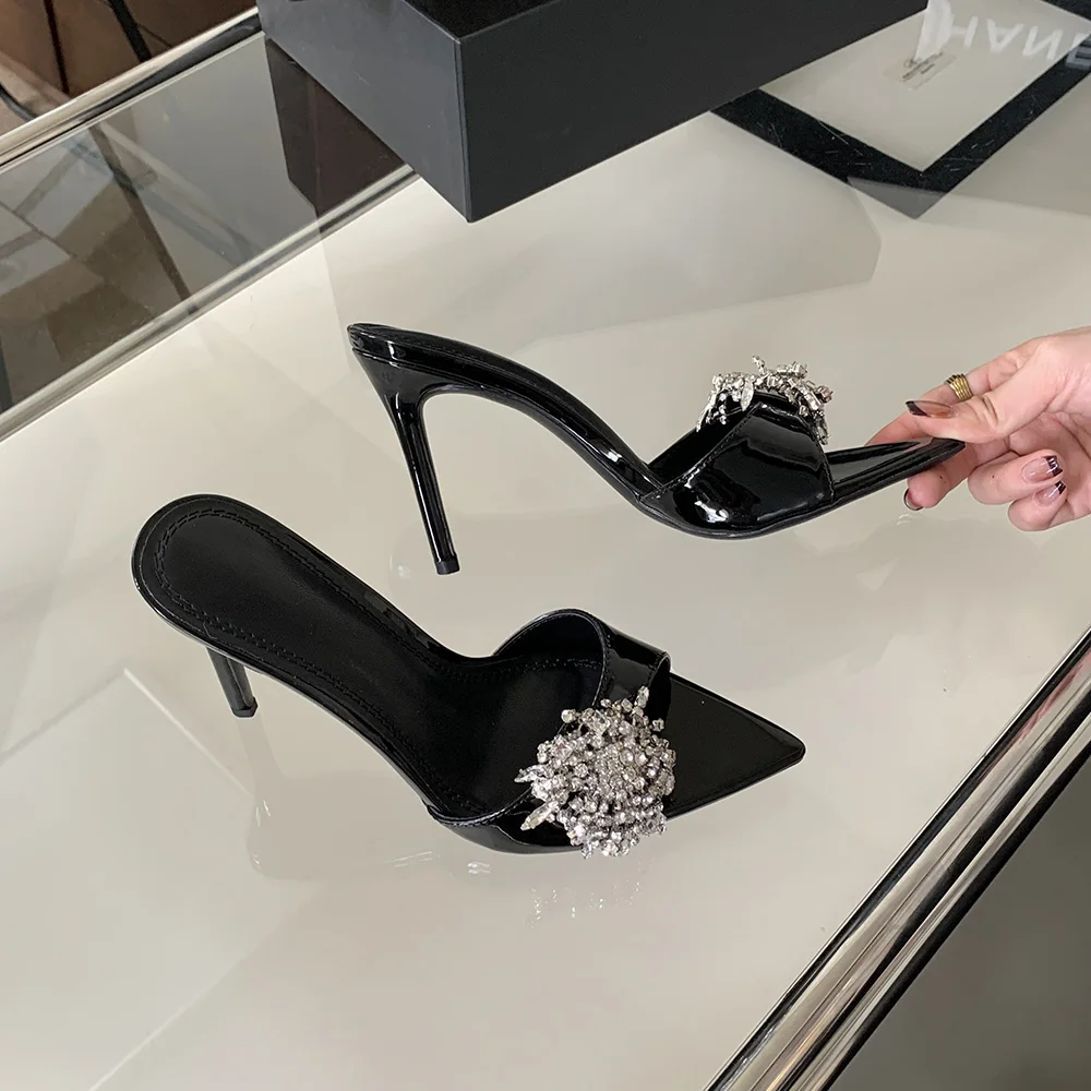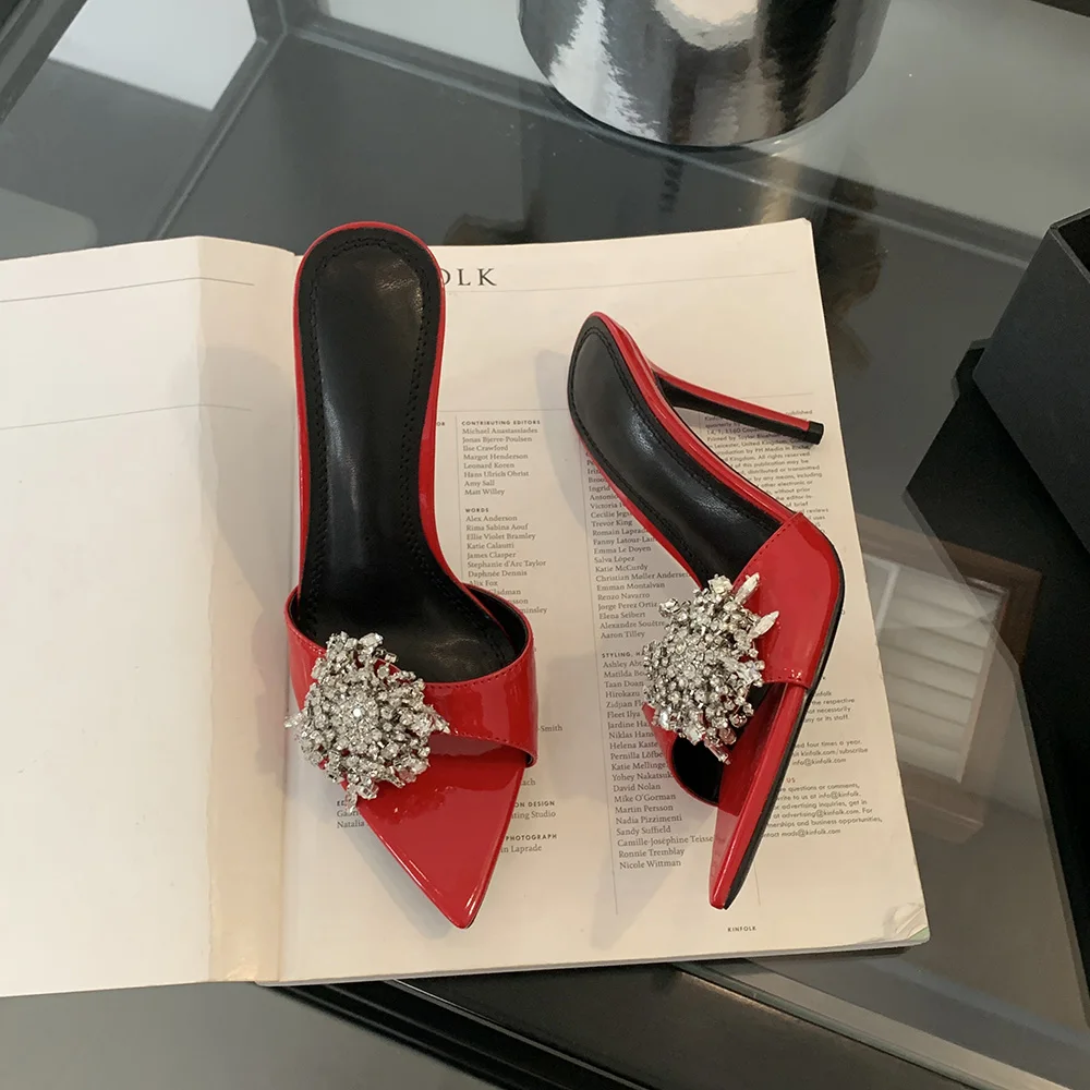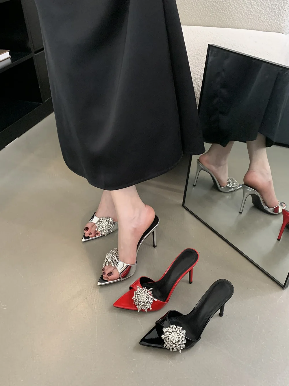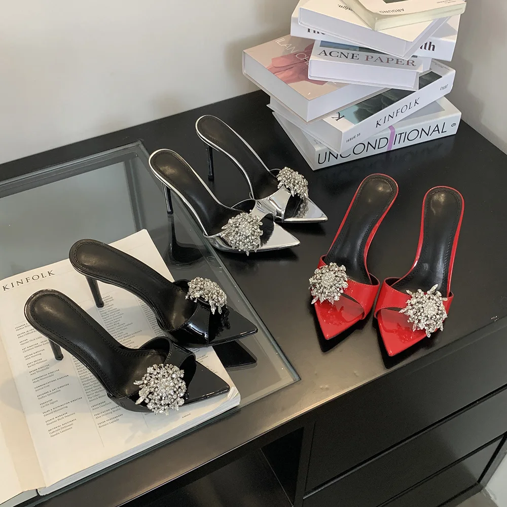 LBSFY - Sexy Women Slides Slippers Summer Outside Thin High Heels Party Pumps Black Red Silver Fashion Rhinestone Crystal Design Sexy