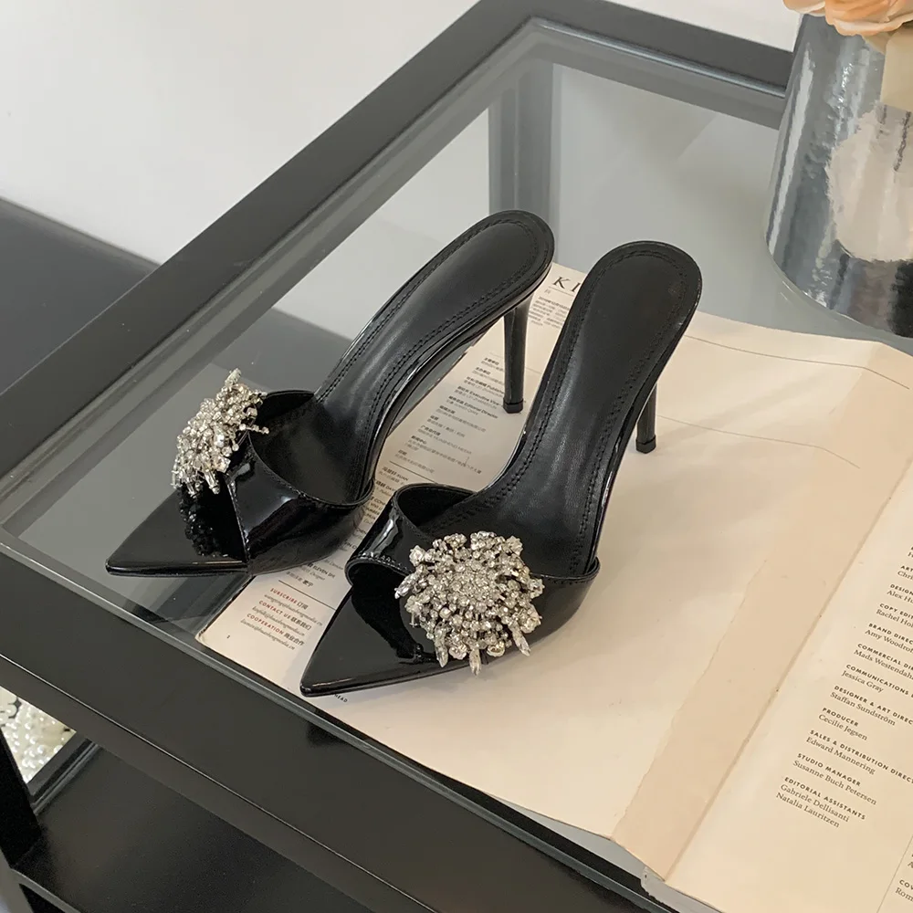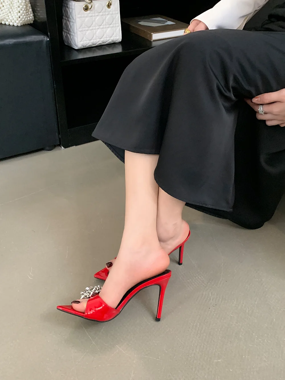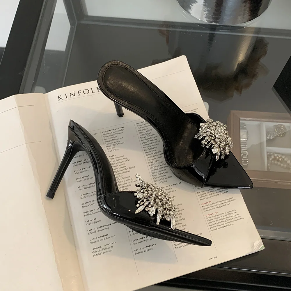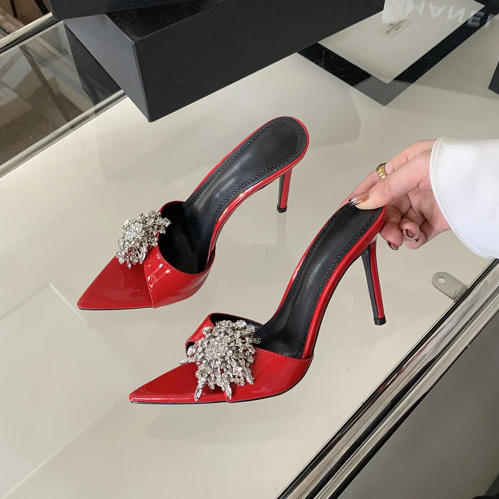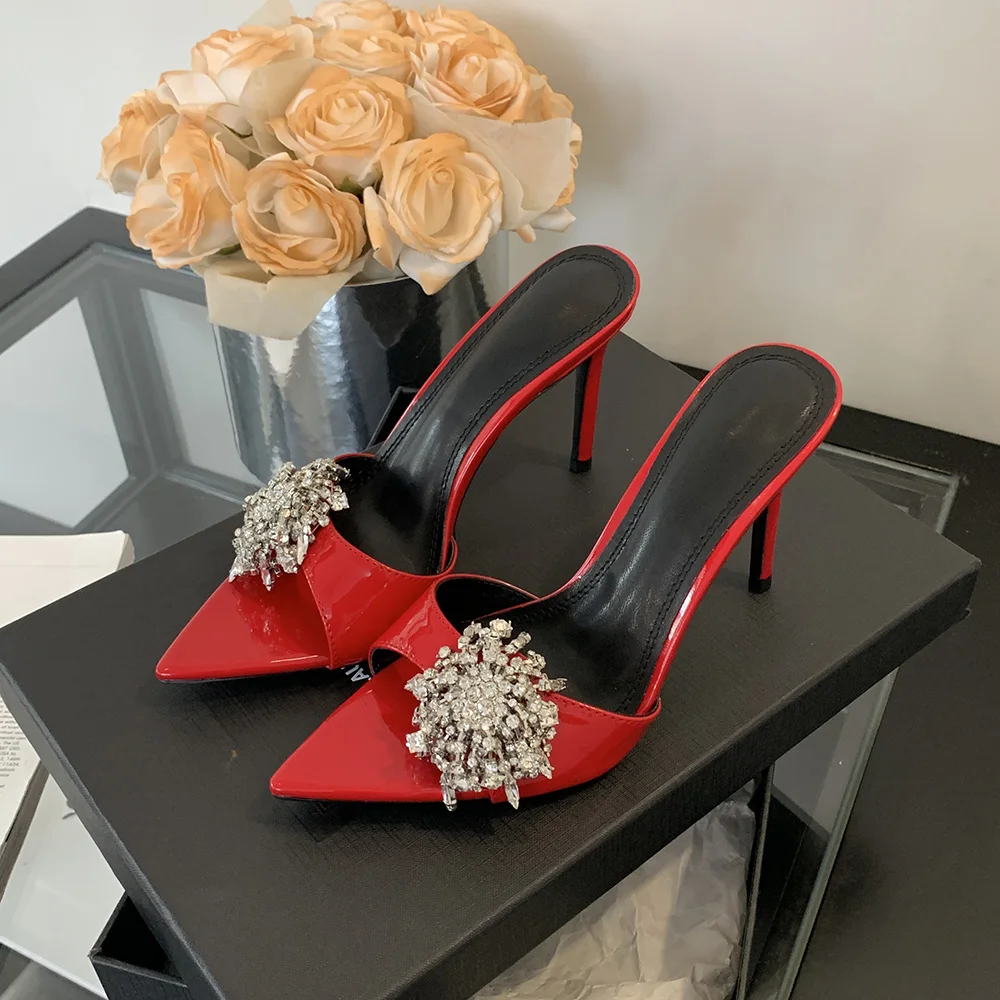 LBSFY - Sexy Women Slides Slippers Summer Outside Thin High Heels Party Pumps Black Red Silver Fashion Rhinestone Crystal Design Sexy