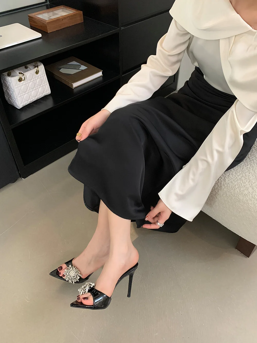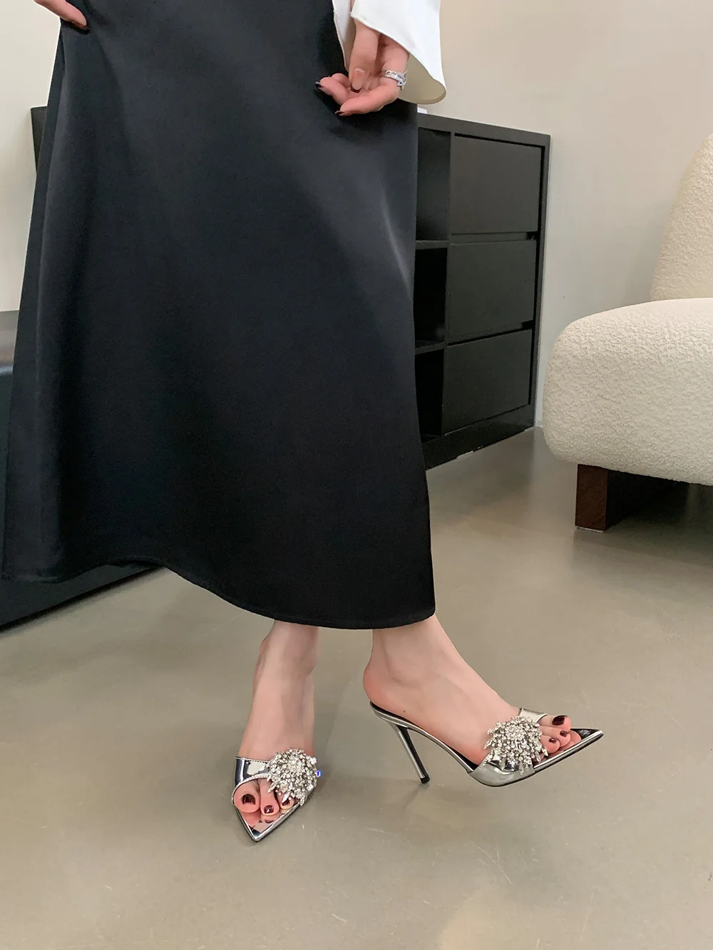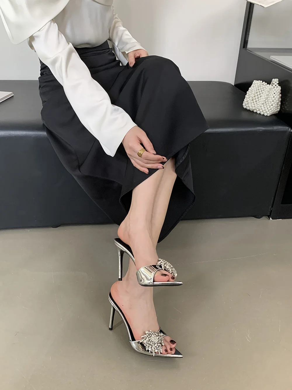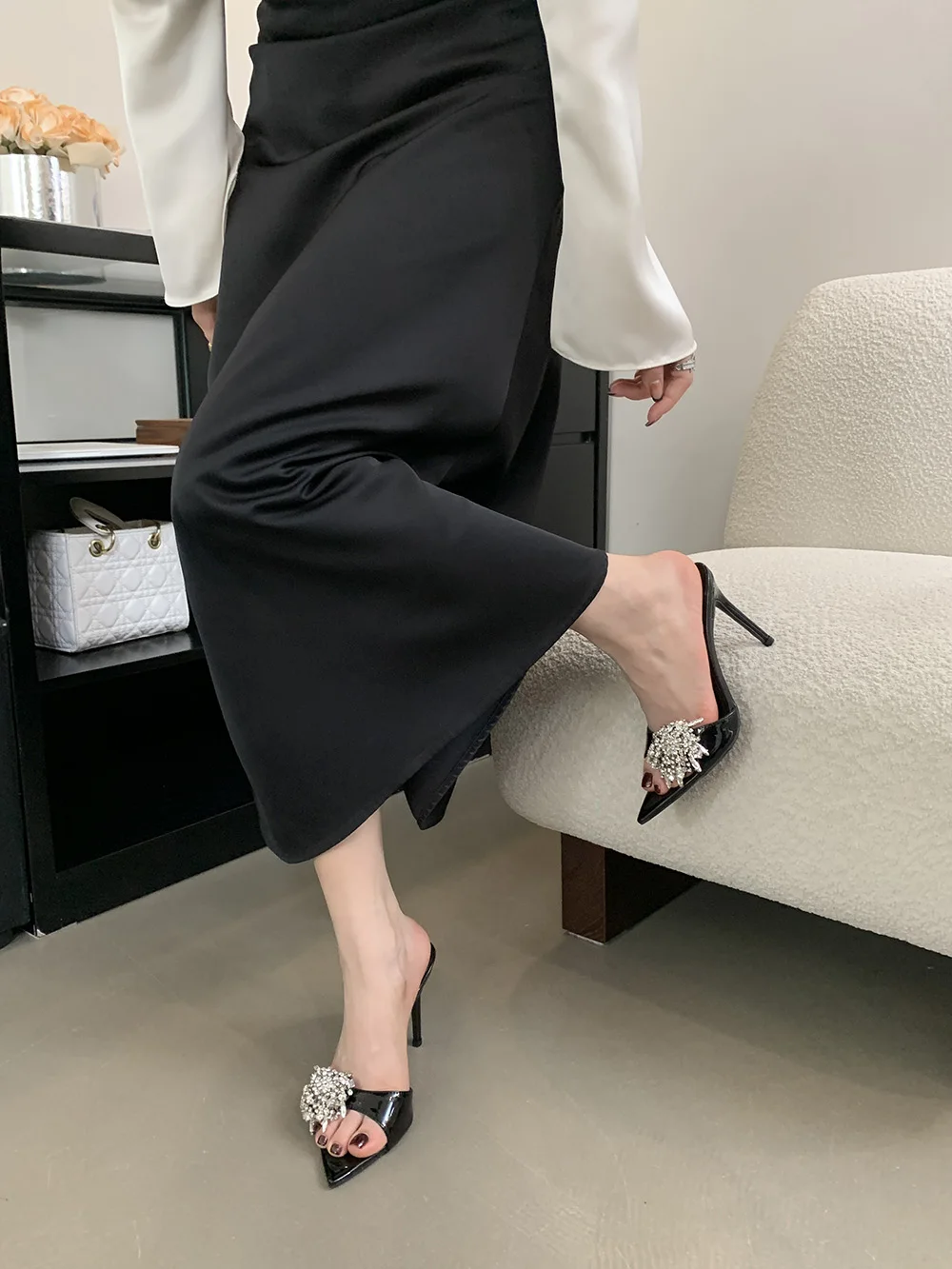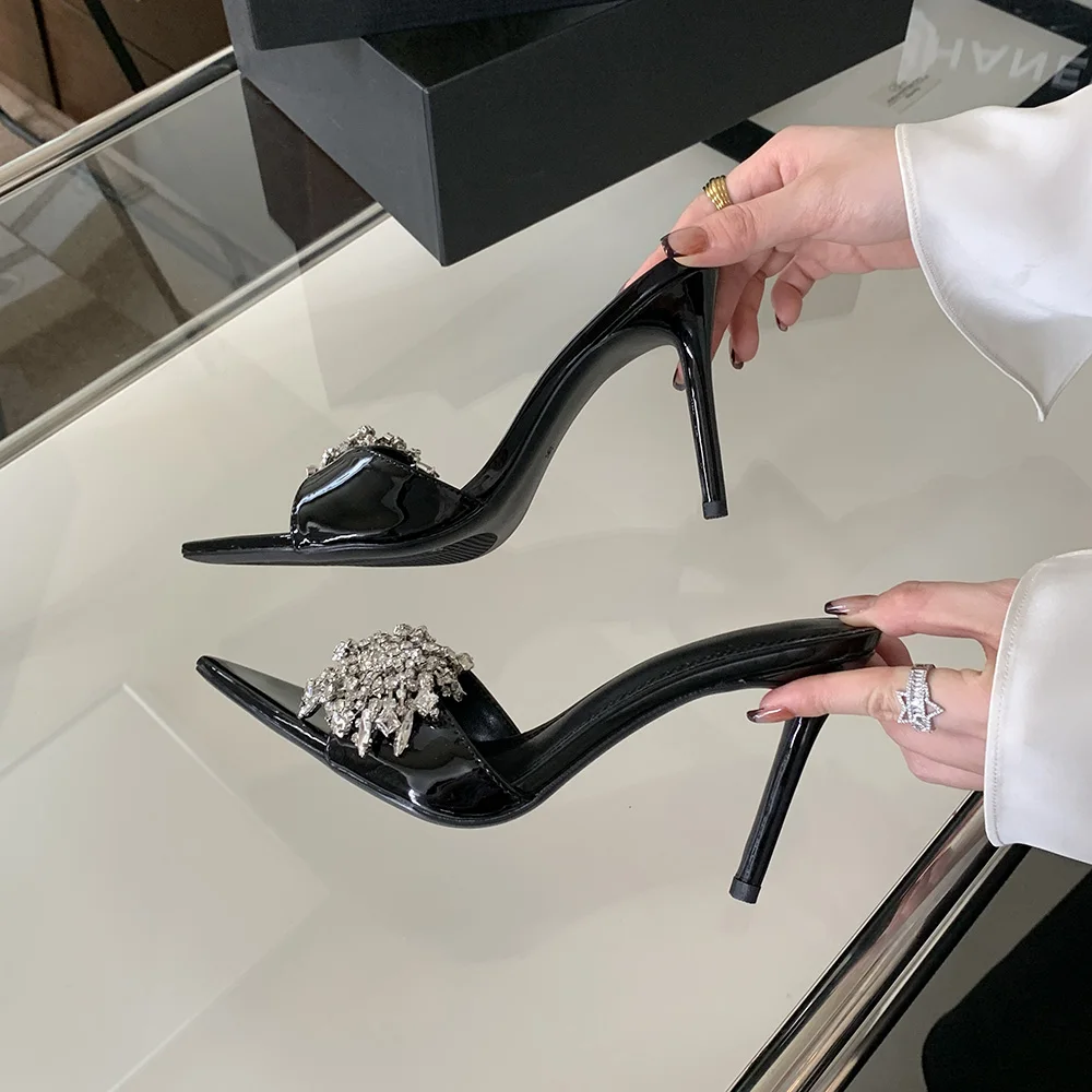 LBSFY - Sexy Women Slides Slippers Summer Outside Thin High Heels Party Pumps Black Red Silver Fashion Rhinestone Crystal Design Sexy